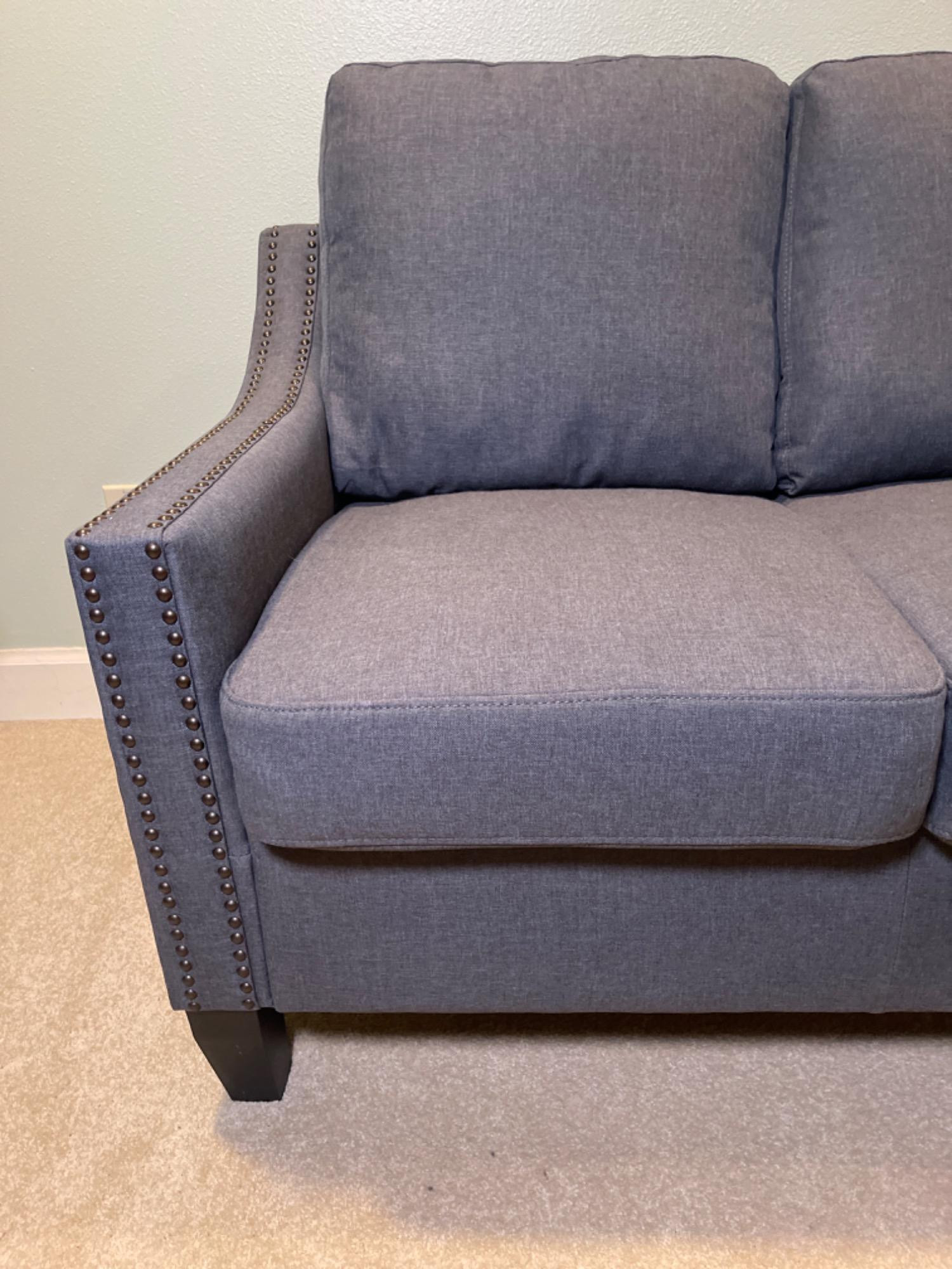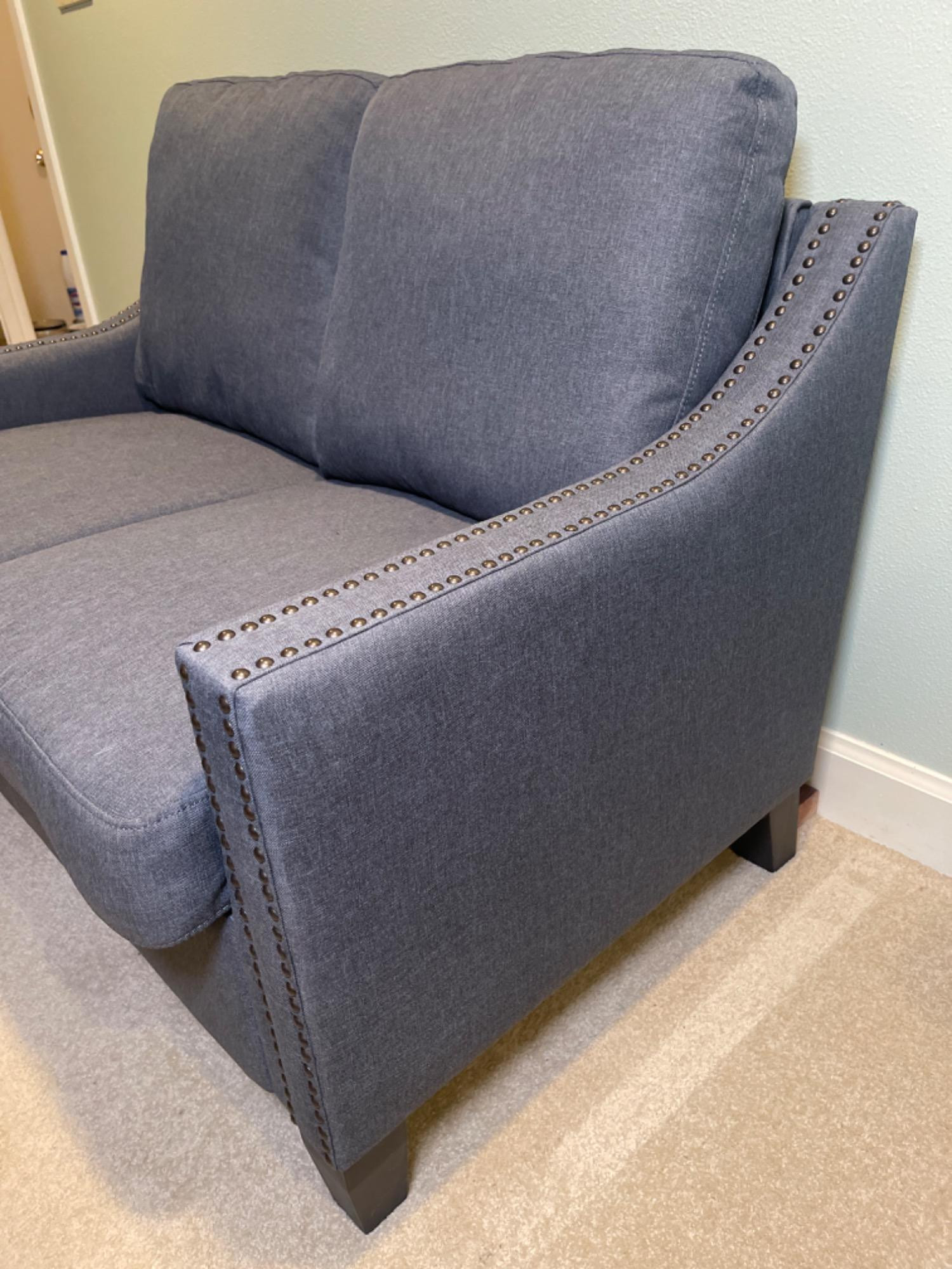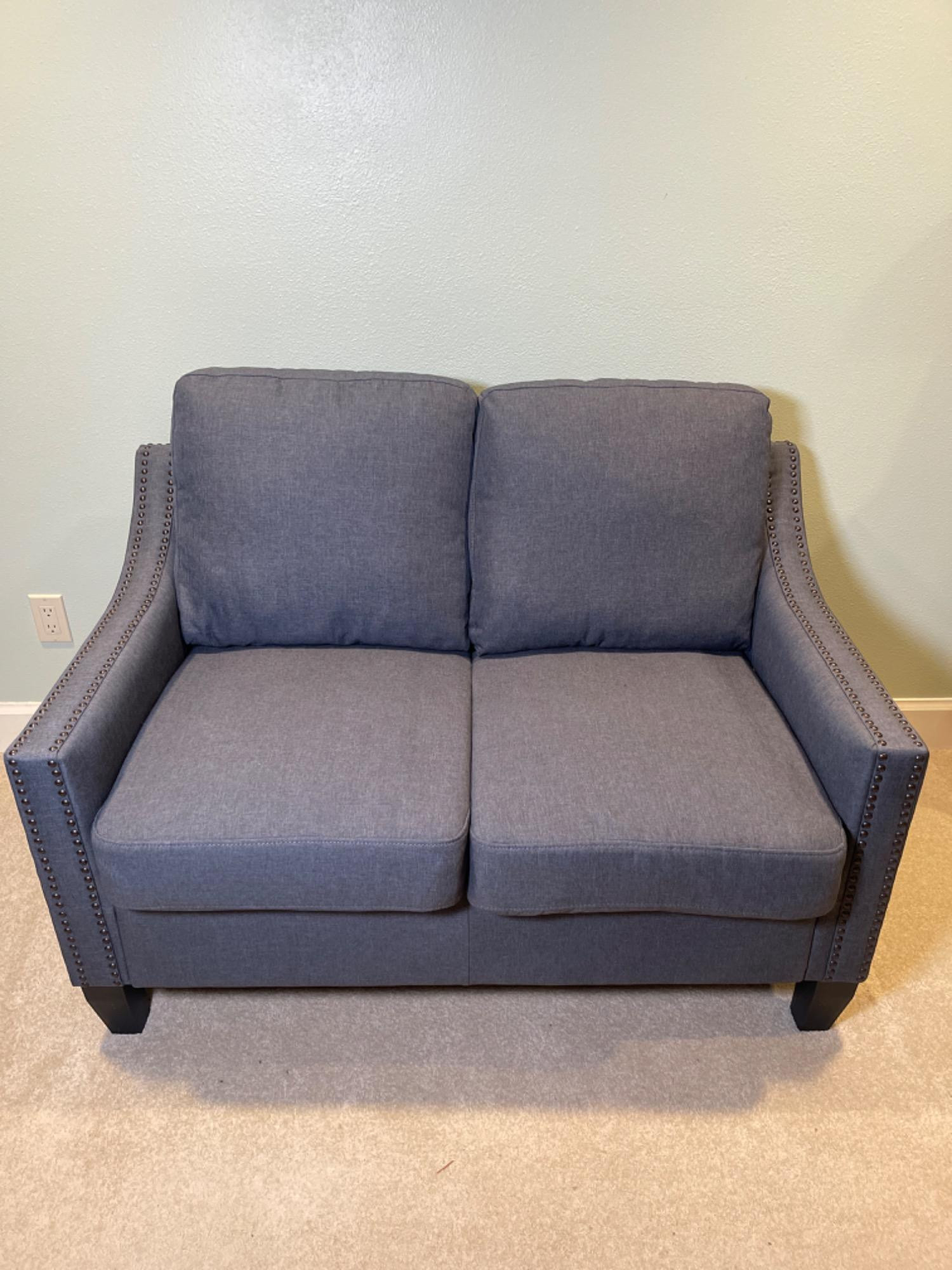 Stylish and comfortable loveseat featuring a sleek design with decorative nailhead trim along the arms. The deep blue-gray upholstery complements a variety of interiors, while the plush cushions provide excellent support.