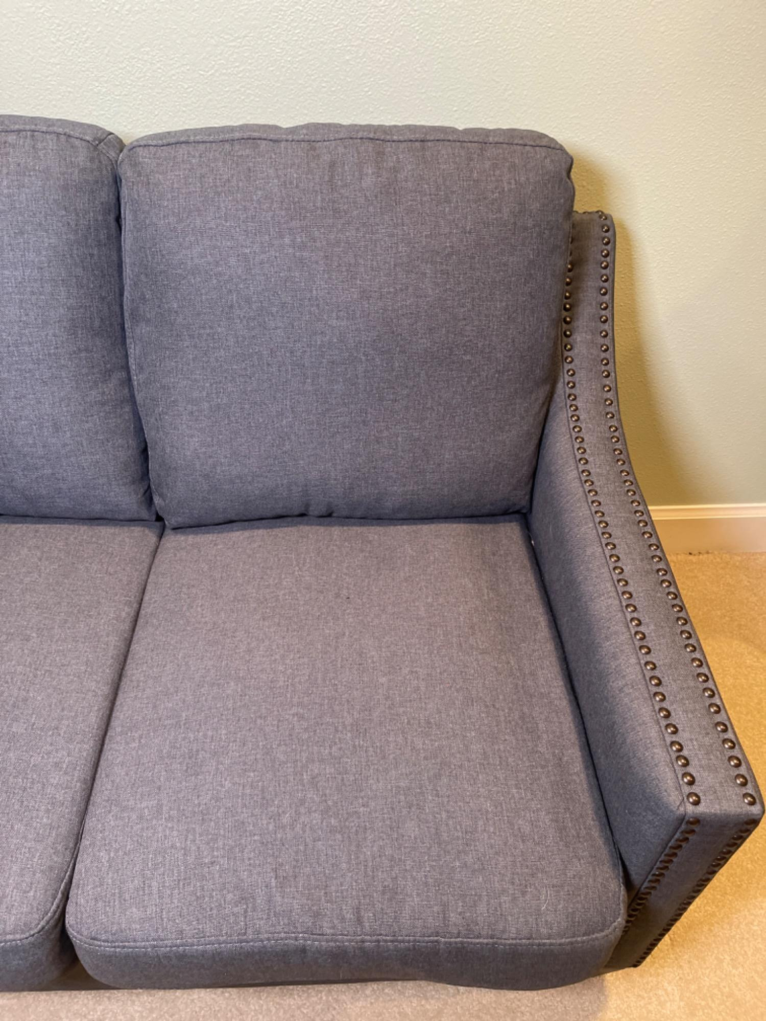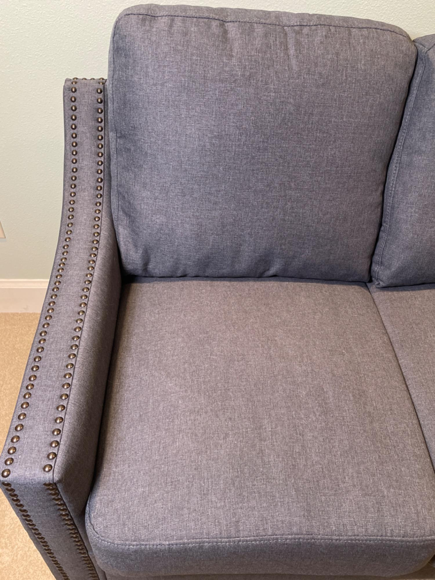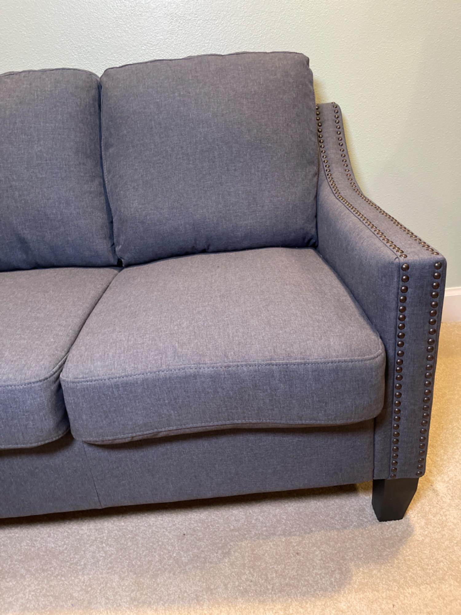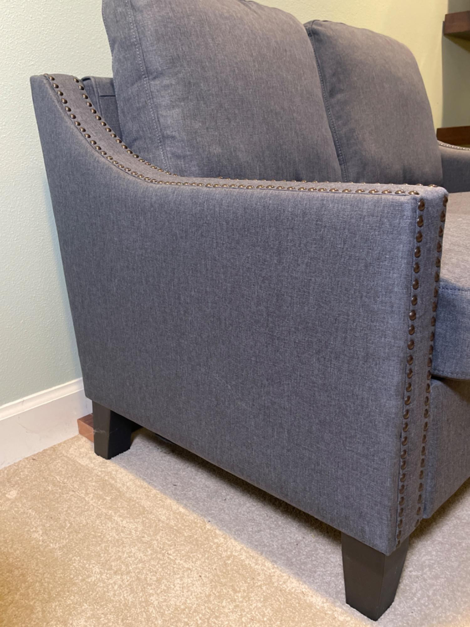 Stylish and comfortable loveseat featuring a sleek design with decorative nailhead trim along the arms. The deep blue-gray upholstery complements a variety of interiors, while the plush cushions provide excellent support.
