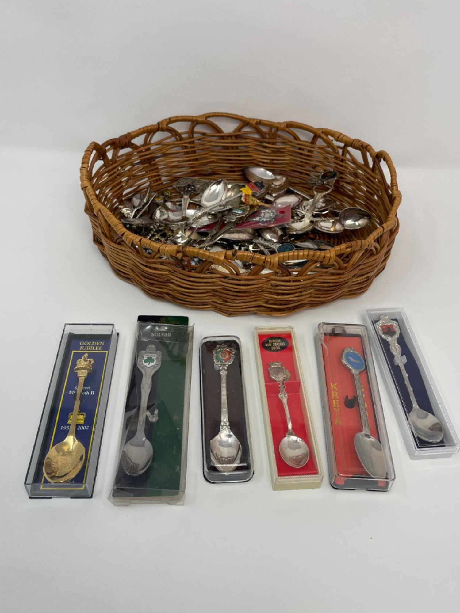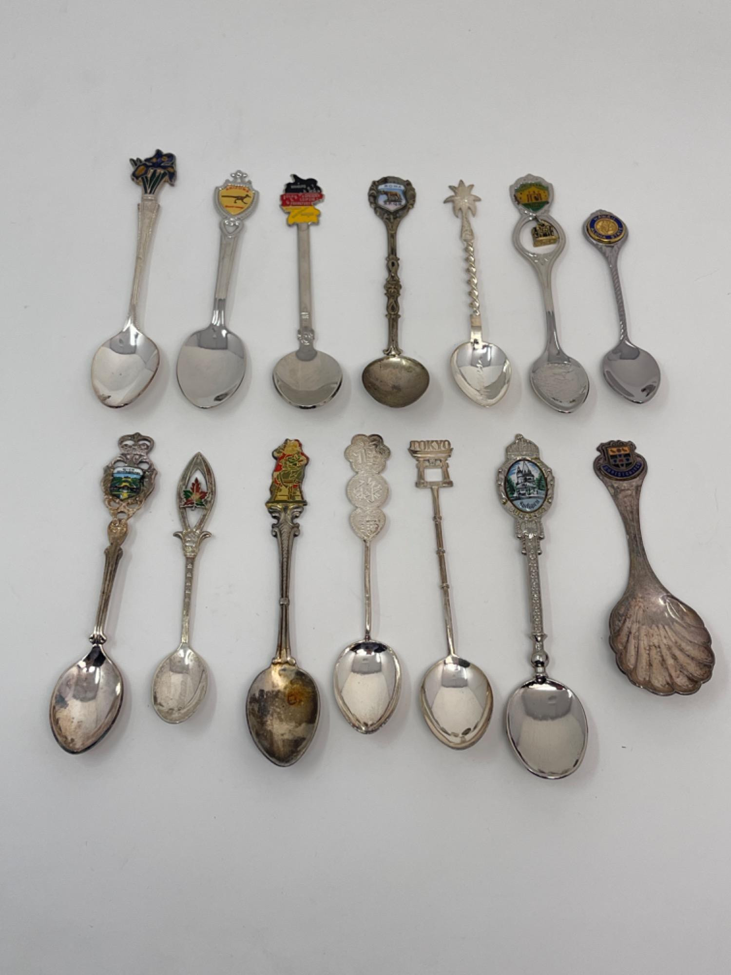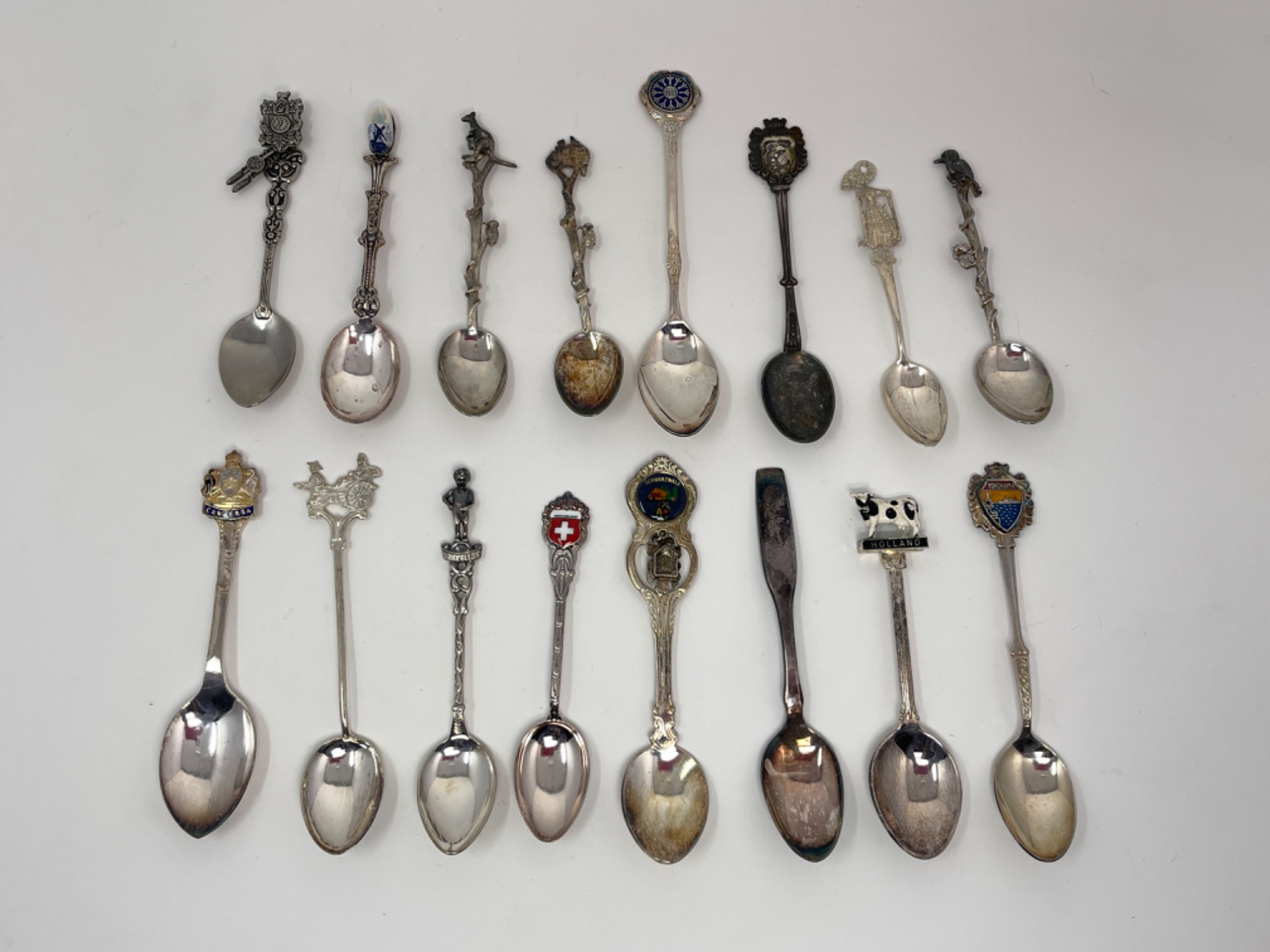 Diverse collection of souvenir and commemorative collector's spoons, featuring a variety of designs, locations, and themes. Condition: Some have tarnishing.