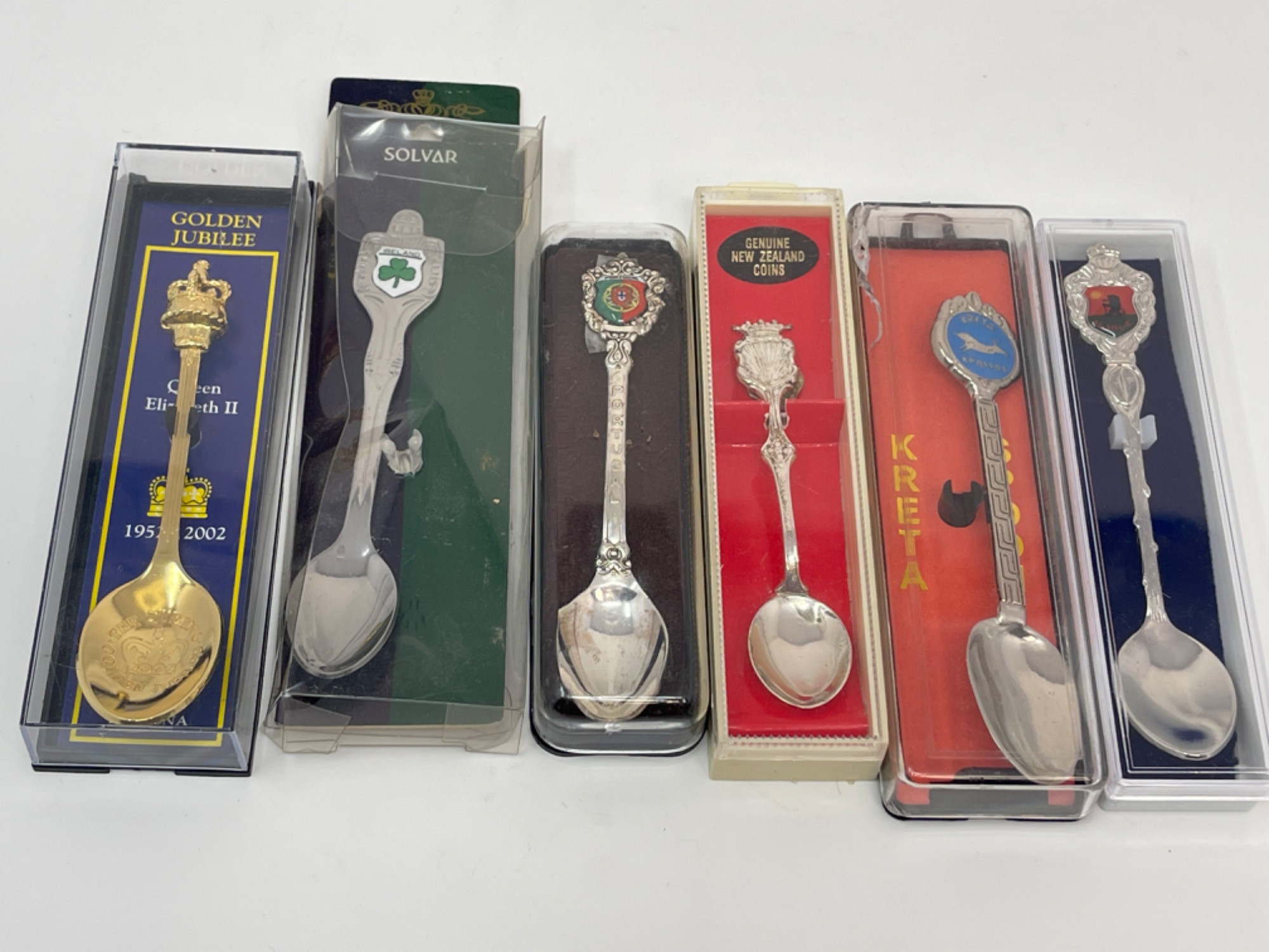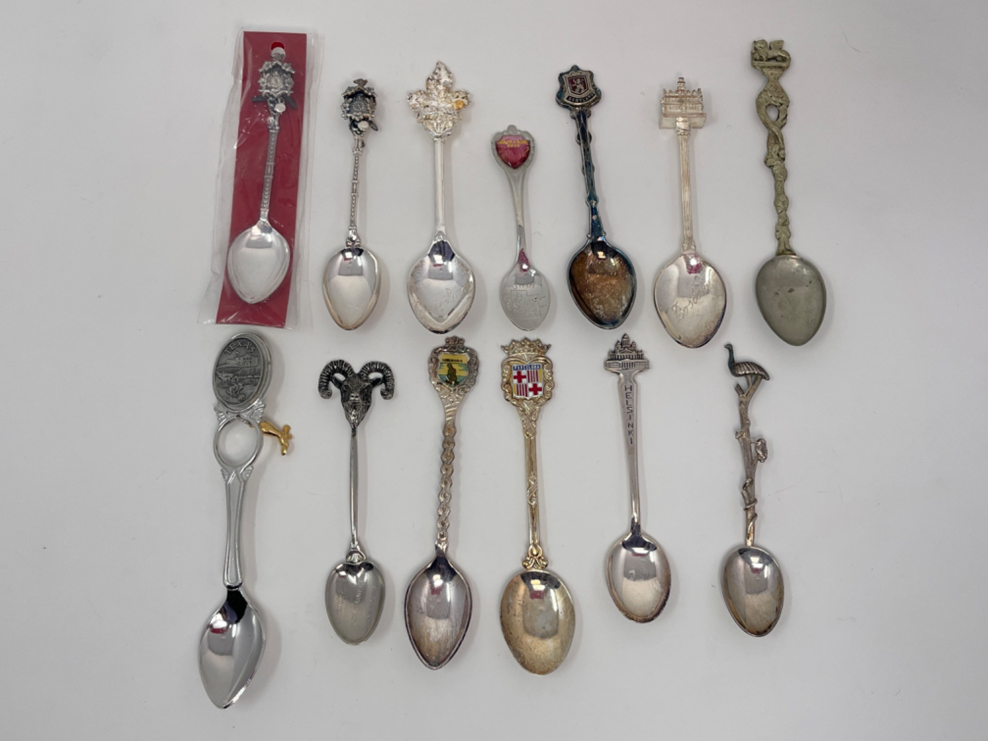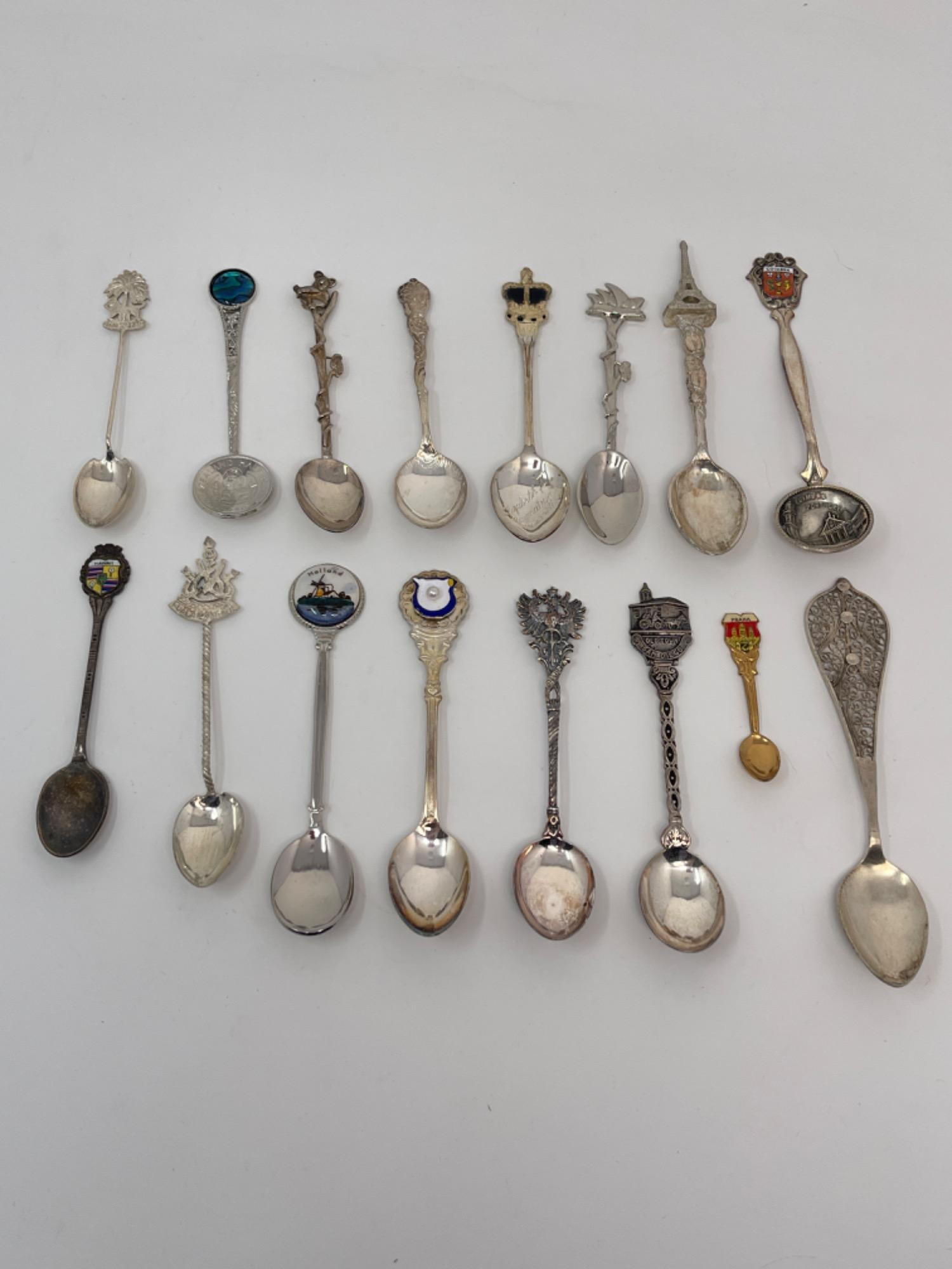 Diverse collection of souvenir and commemorative collector's spoons, featuring a variety of designs, locations, and themes. Condition: Some have tarnishing.