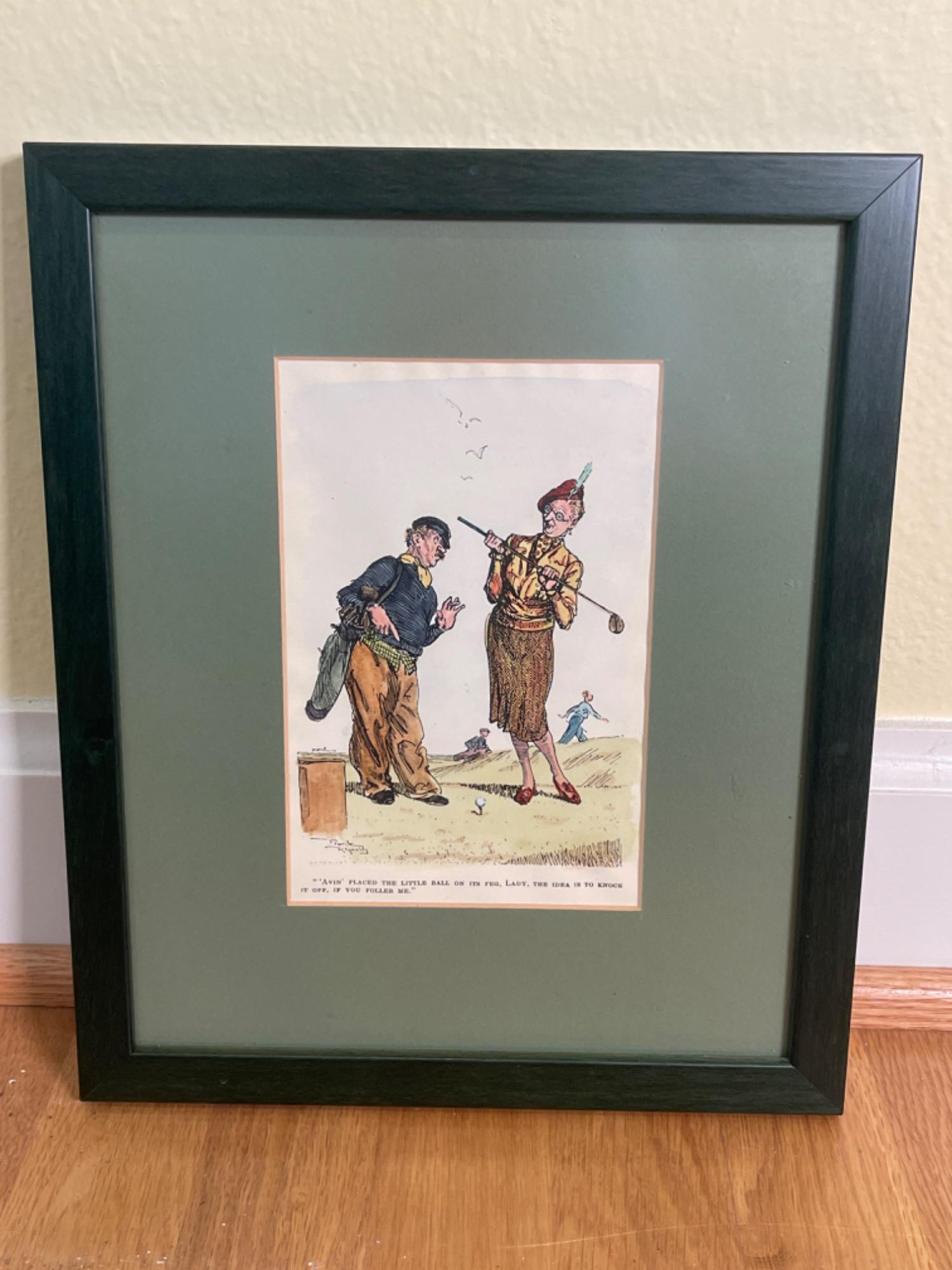 Golf-Themed Decor and Collectibles A fantastic assortment of golf-themed decor and memorabilia, perfect for enthusiasts and collectors. This lot includes framed artwork, a decorative golf clock, collectible posters, and golf-inspired salt and pepper shakers.