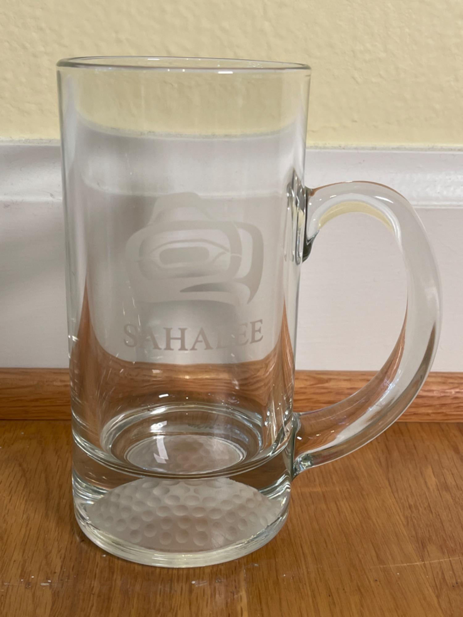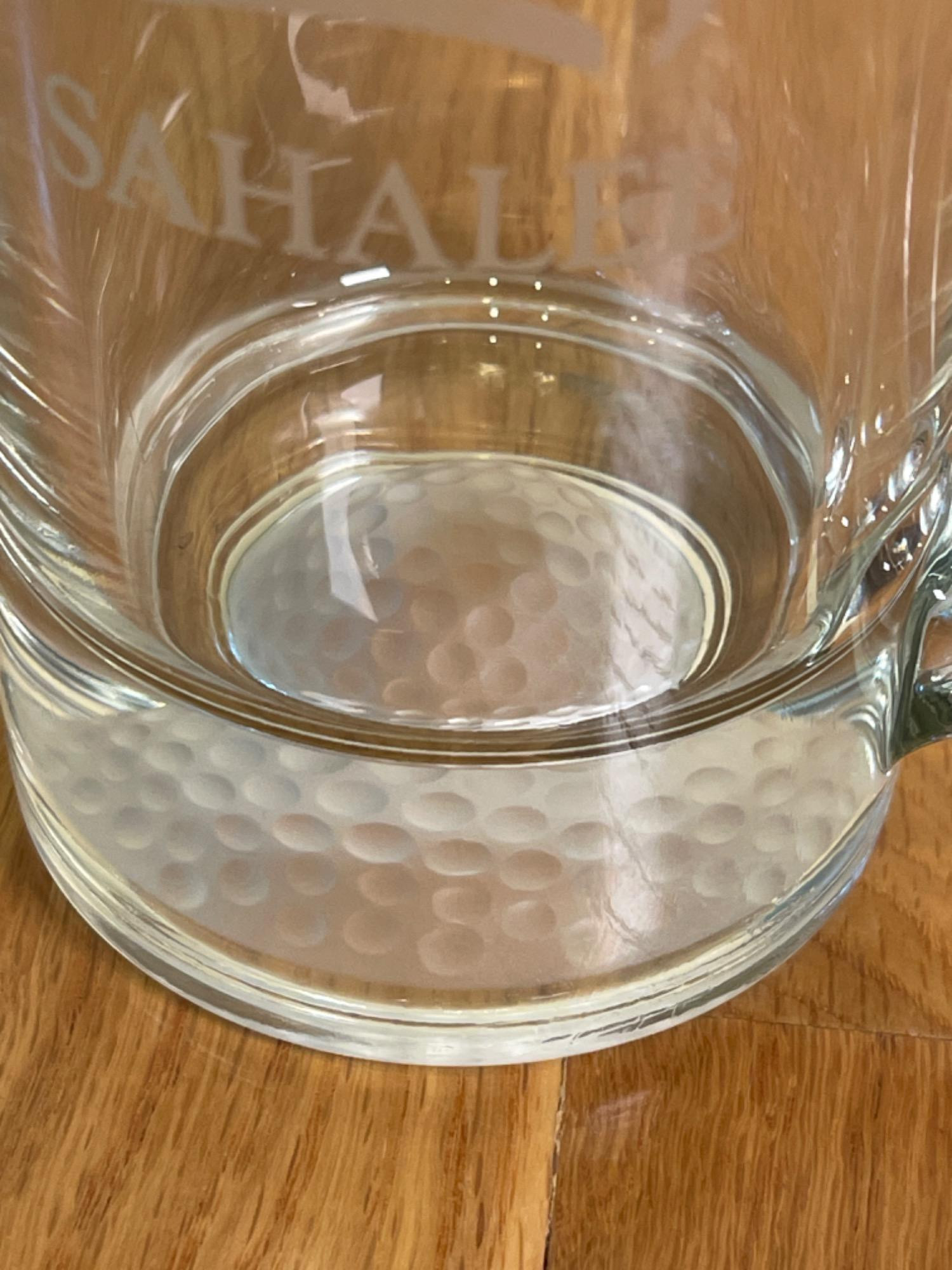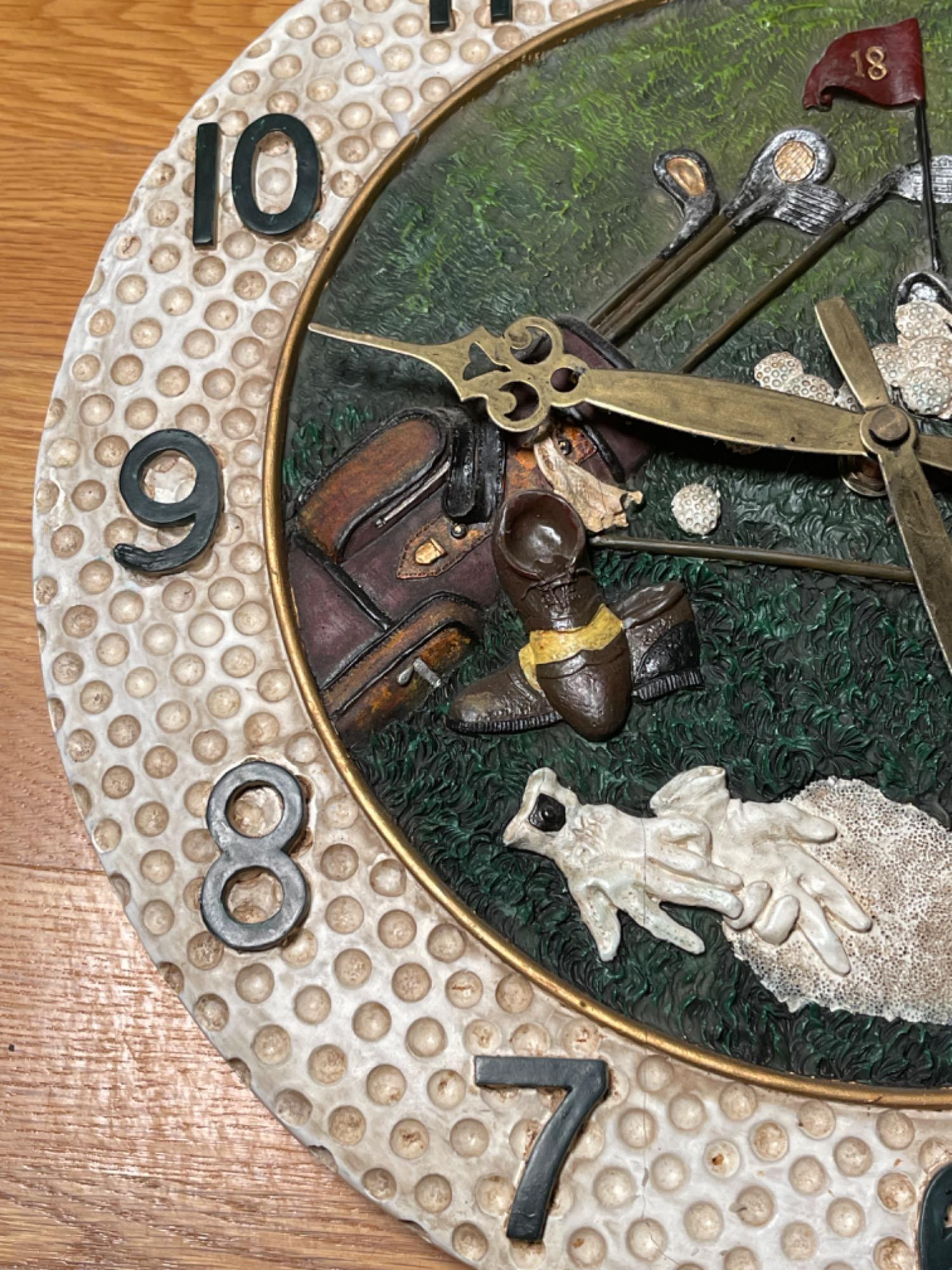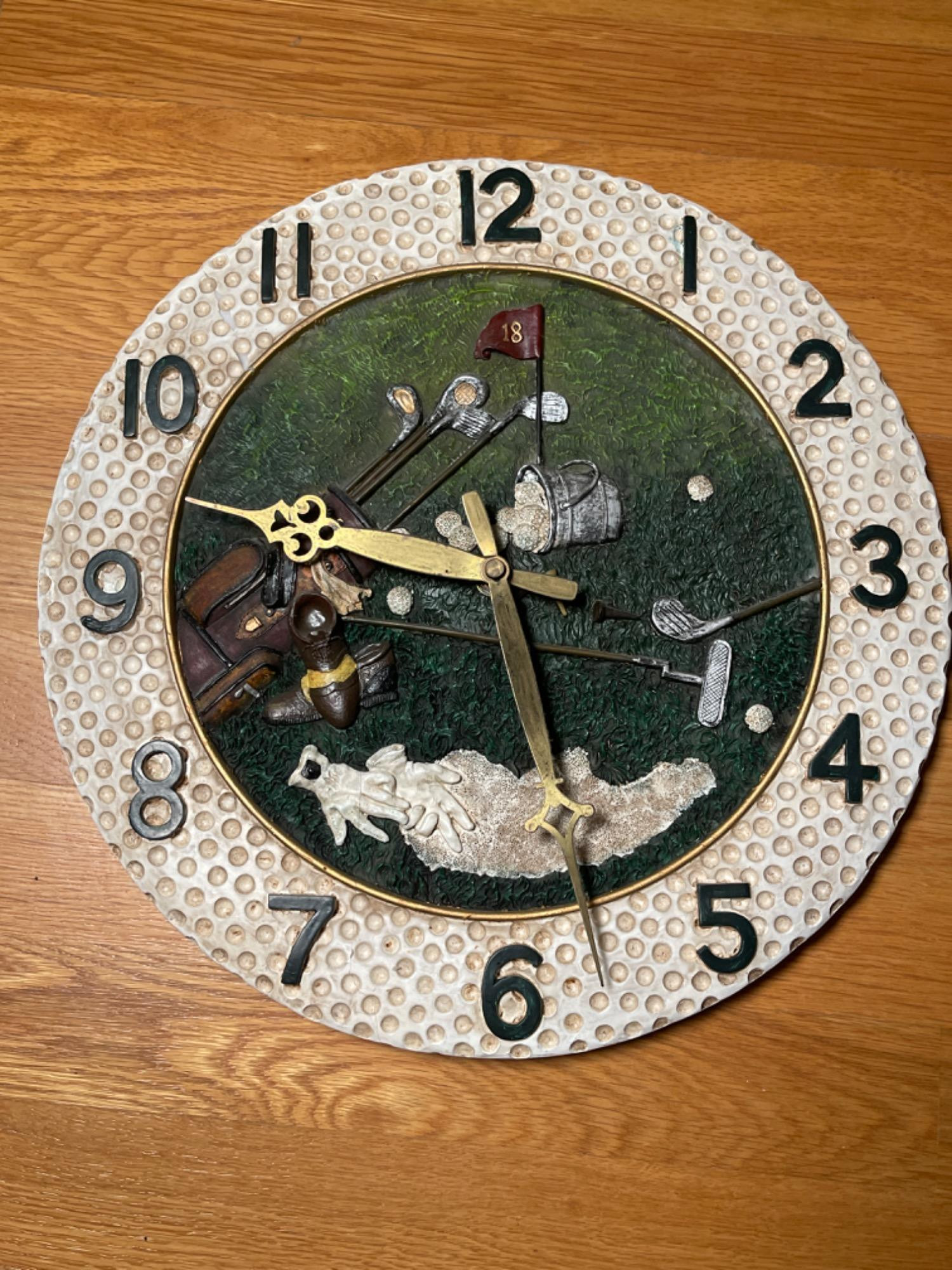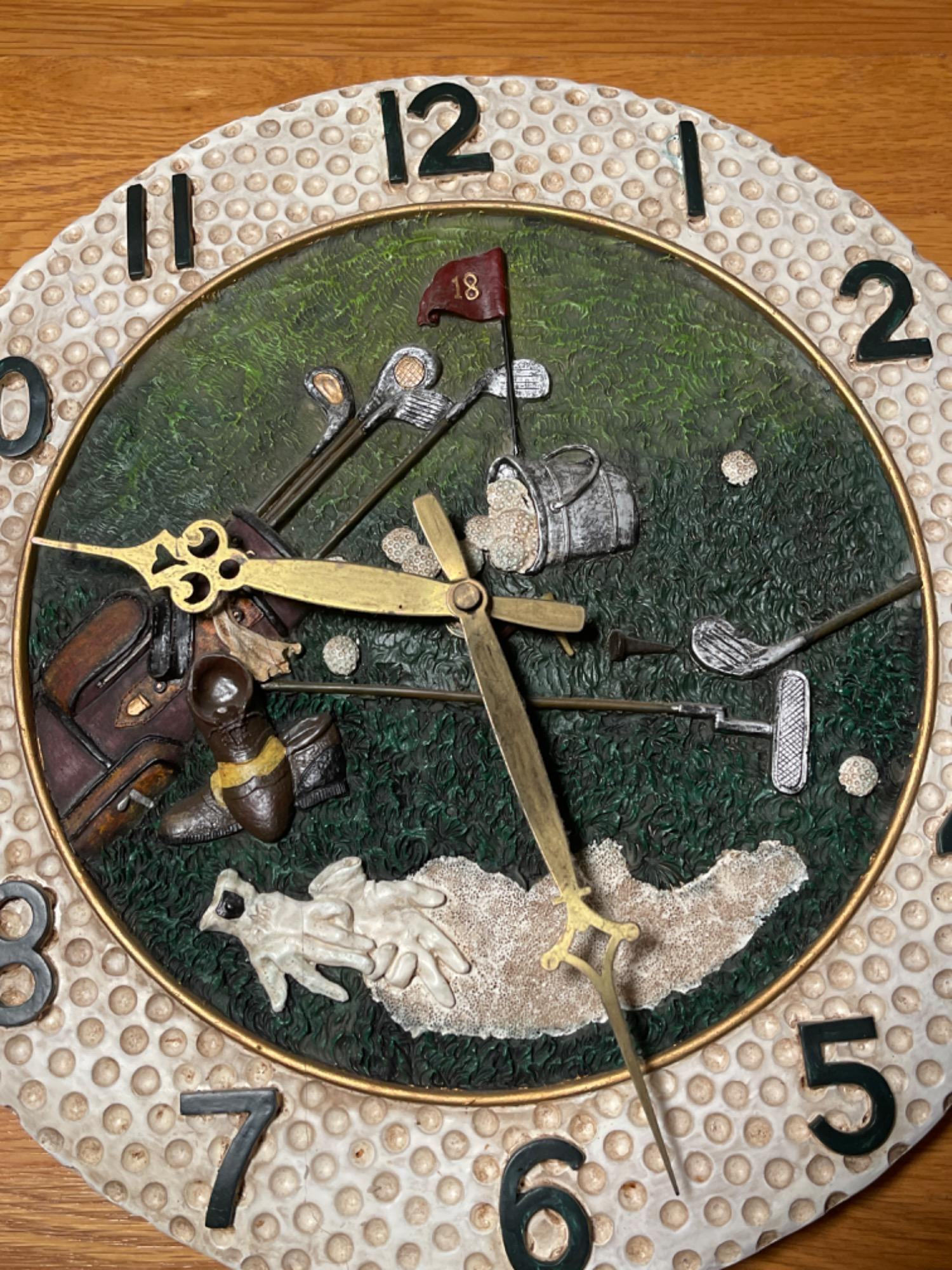 - Golf-Themed Wall Clock – Features embossed golf ball border and a raised course design (Note: Clock has a crack)
