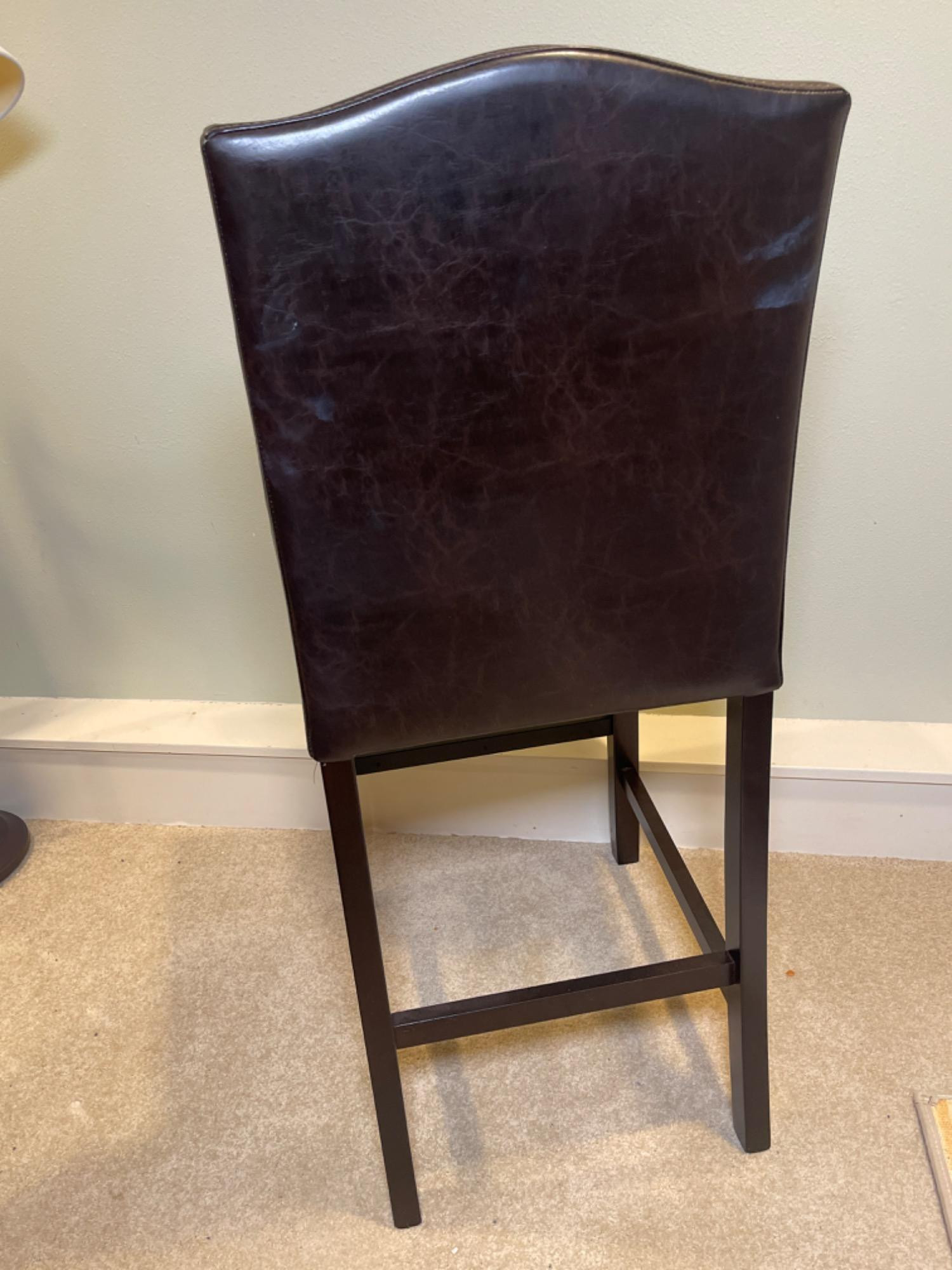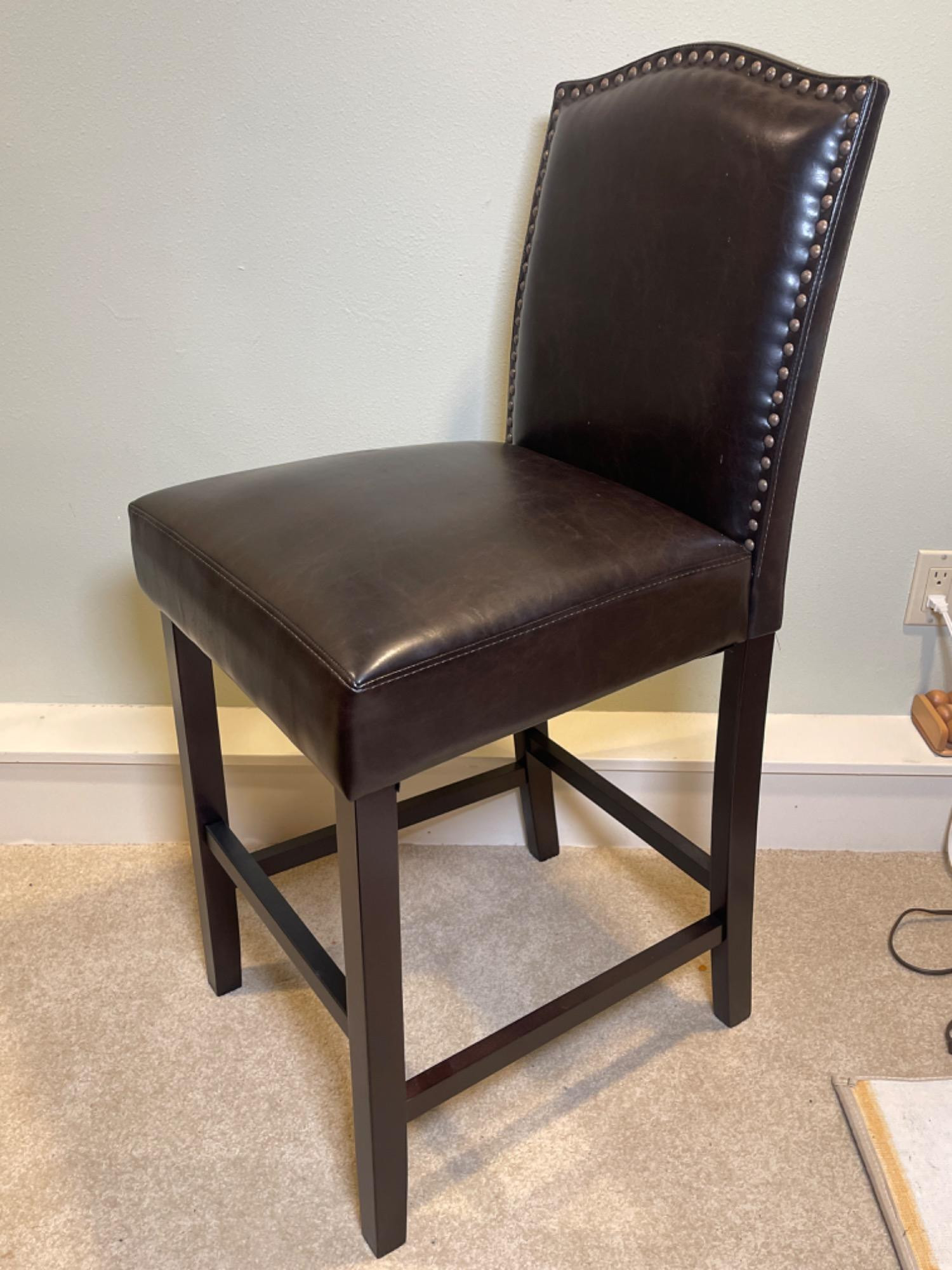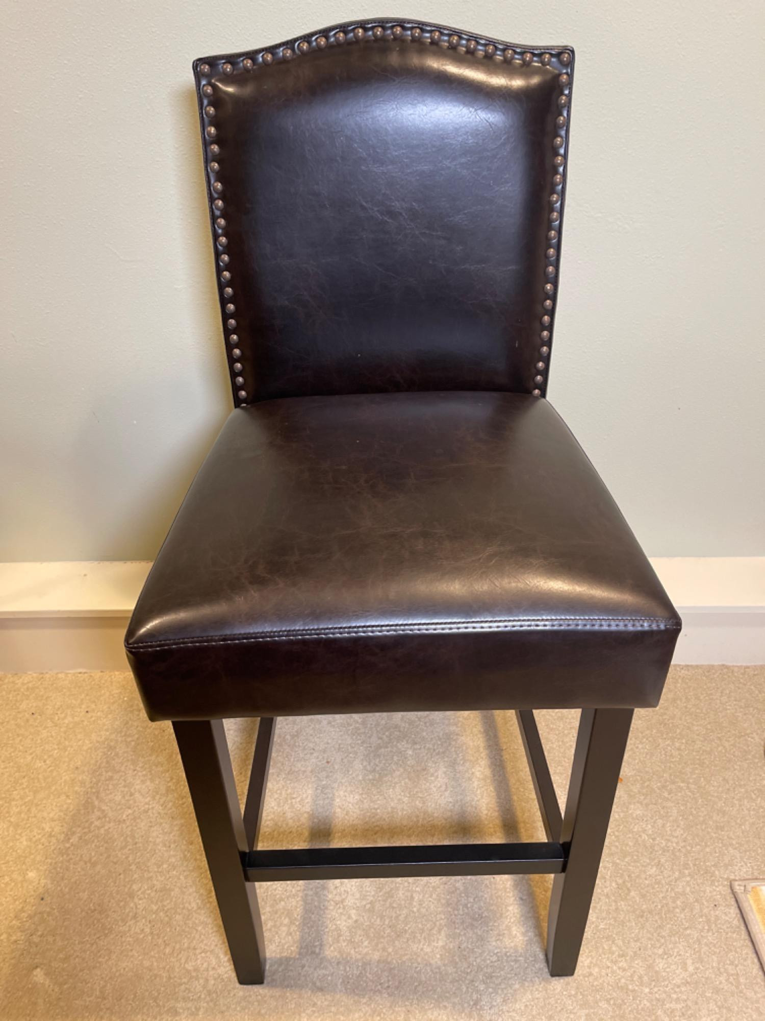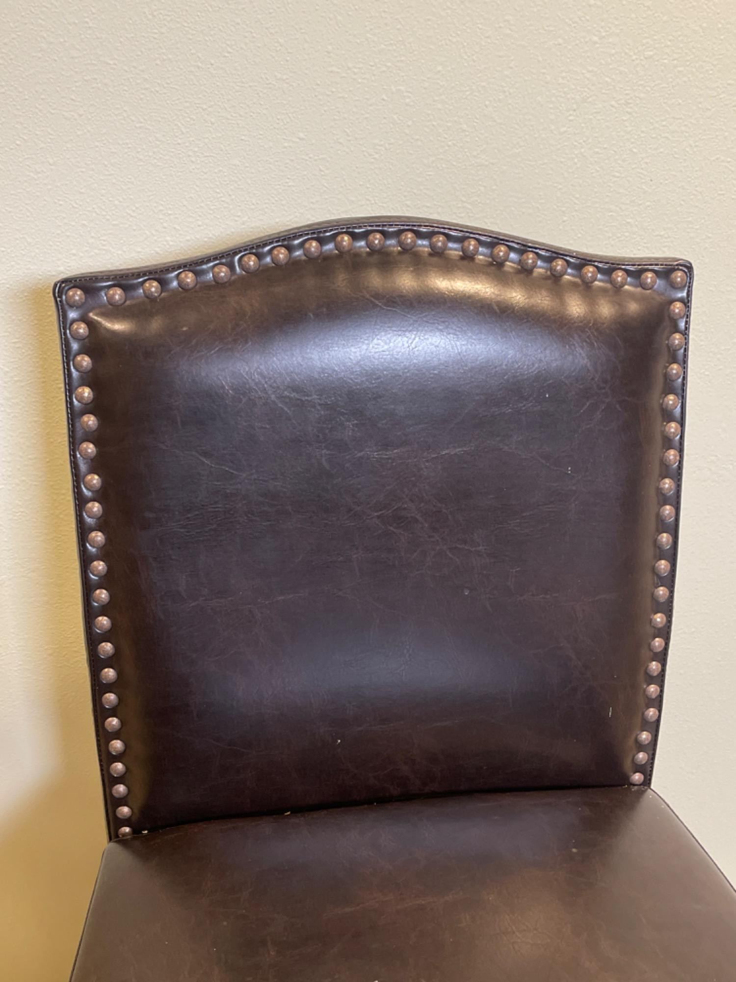 Sophisticated and comfortable counter-height barstool featuring a rich dark brown faux leather upholstery with a gently curved backrest. The elegant nailhead trim adds a classic touch, while the cushioned seat provides excellent support. Sturdy wooden legs with a footrest ensure lasting durability. Condition: Has some scuffs and stains. Please see photos.