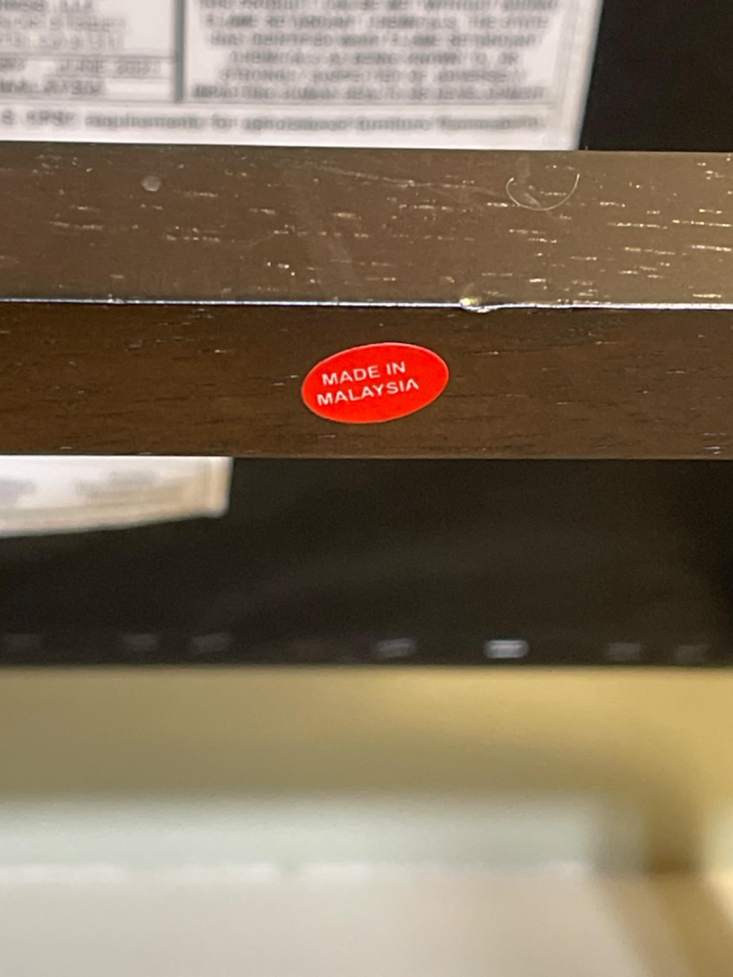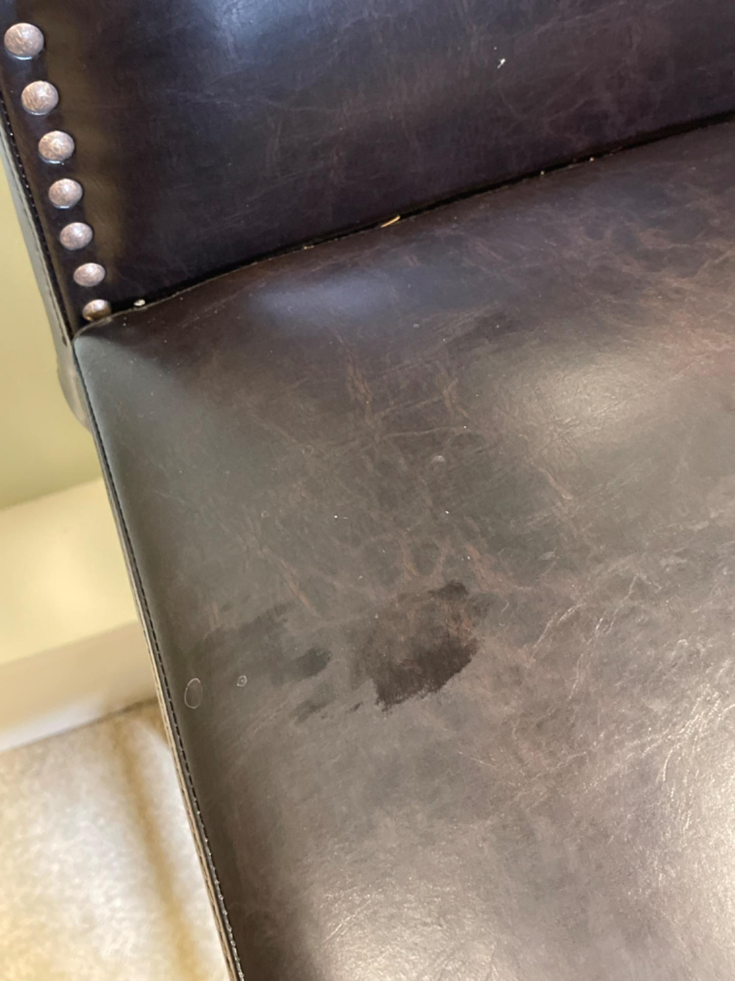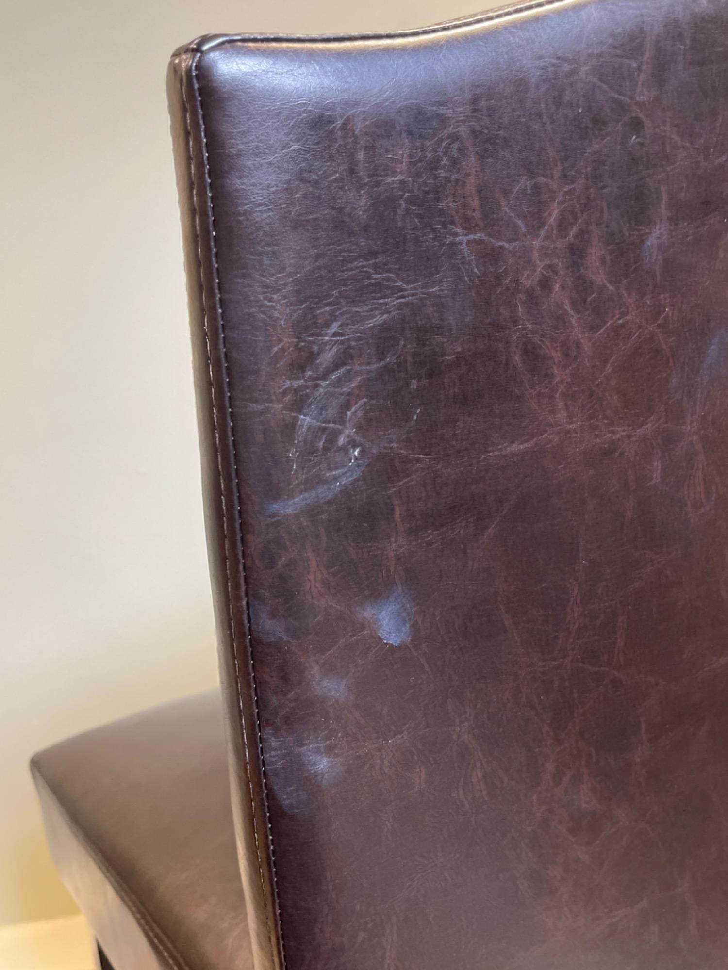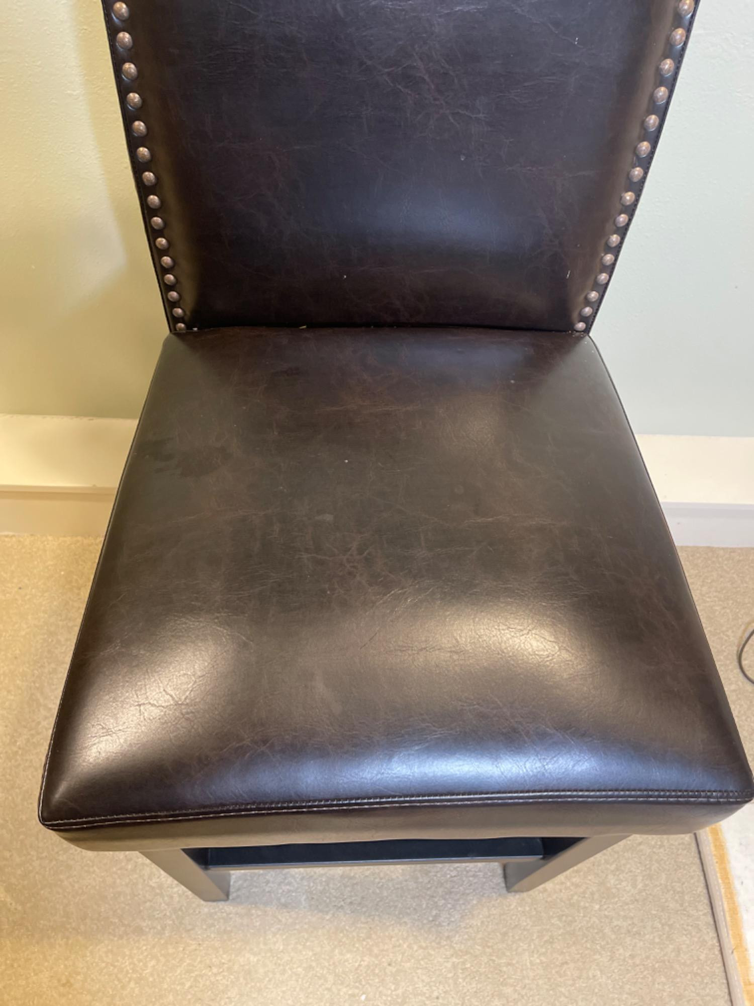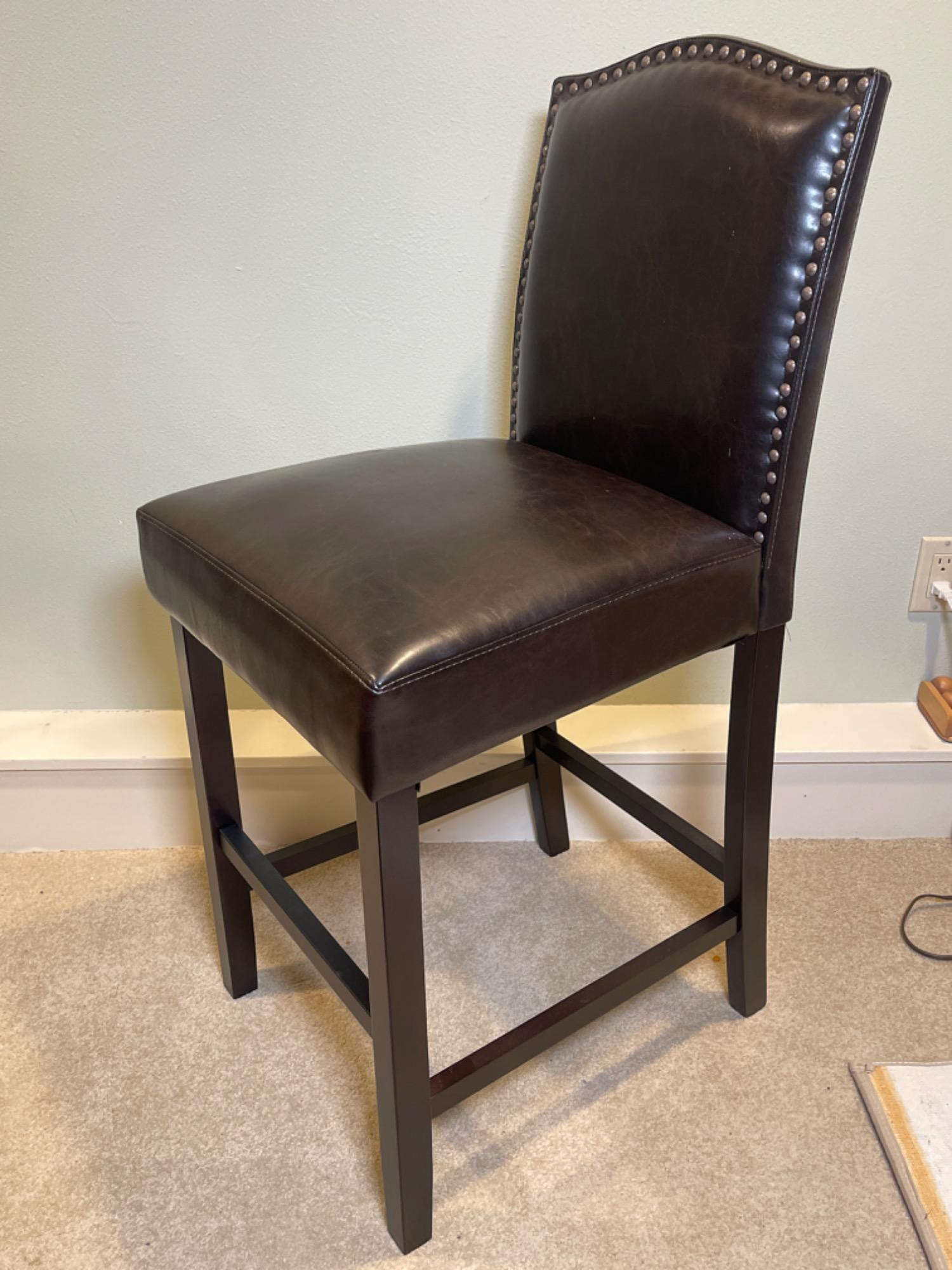 Sophisticated and comfortable counter-height barstool featuring a rich dark brown faux leather upholstery with a gently curved backrest. The elegant nailhead trim adds a classic touch, while the cushioned seat provides excellent support. Sturdy wooden legs with a footrest ensure lasting durability. Condition: Has some scuffs and stains. Please see photos.