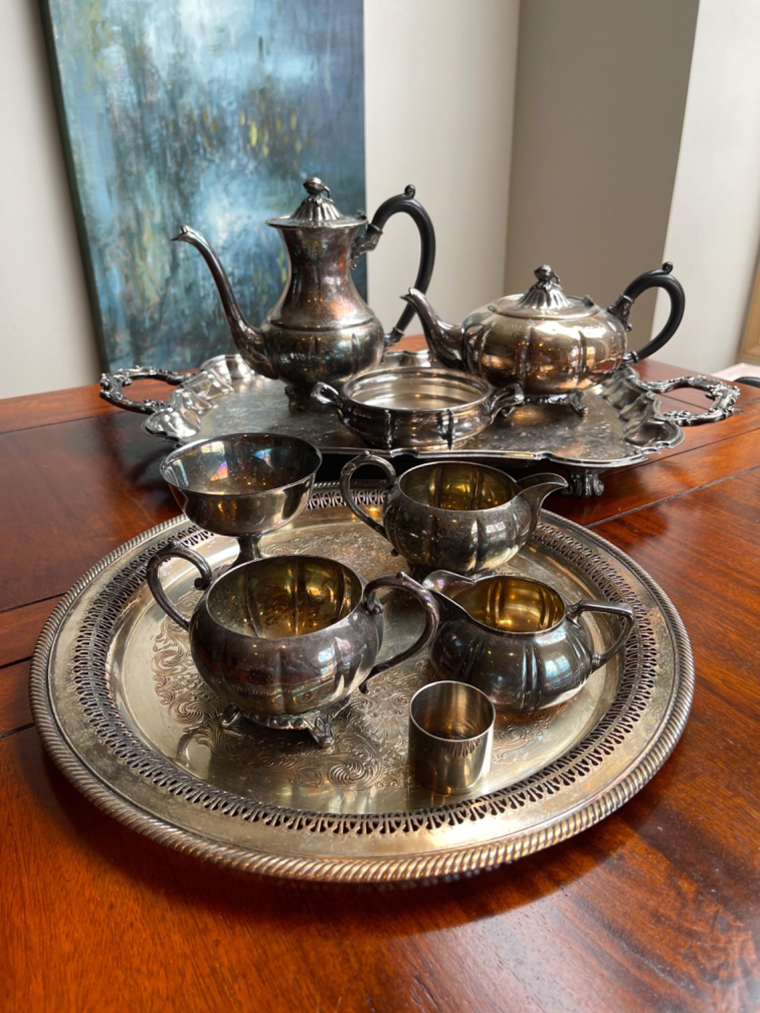 A stunning collection of vintage silverplate, featuring an elegant assortment of serving and tea pieces. The set includes pieces from notable makers such as Viking and Reed & Barton, showcasing classic ornate designs and timeless appeal.