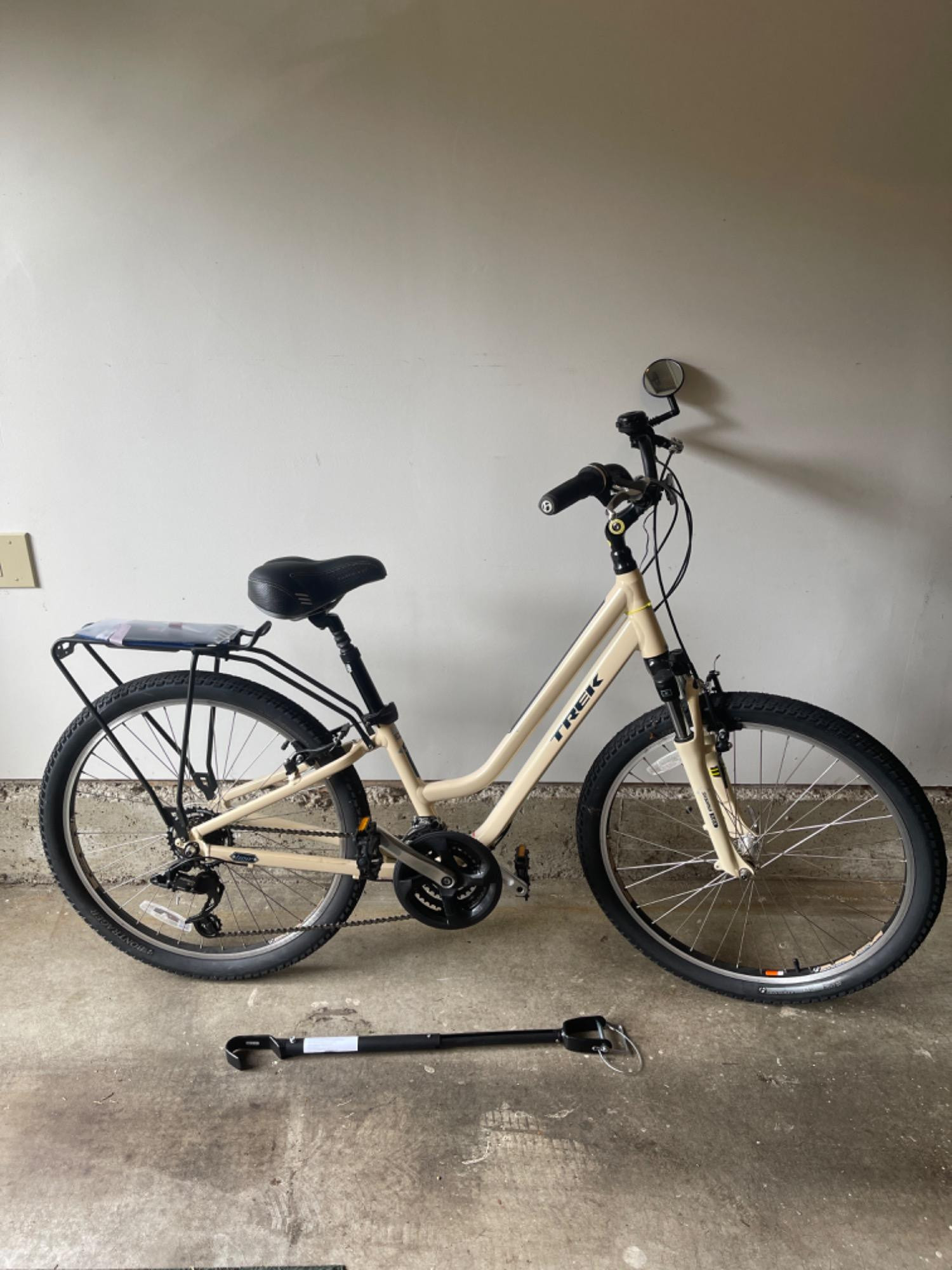 This Trek hybrid bicycle is designed for versatility and comfort, featuring a step-through 13.5" (34cm) frame for easy mounting and dismounting. Outfitted with durable Bontrager AT-550 wheels, it provides a smooth ride on both city streets and light trails. Additional features include a rear cargo rack, ergonomic handlebars with a mounted mirror, and Shimano gear components for reliable shifting. The handlebars stand at 44" in height.