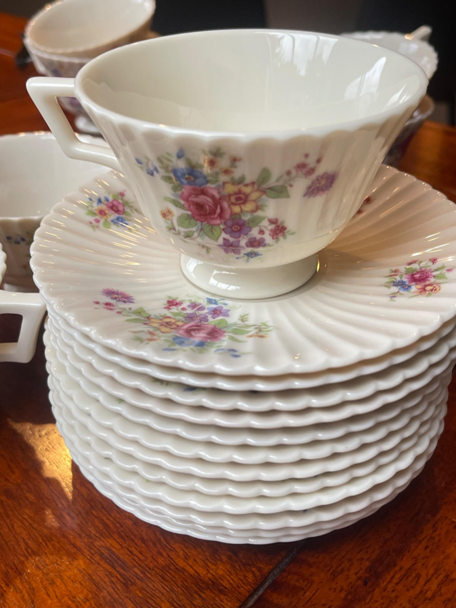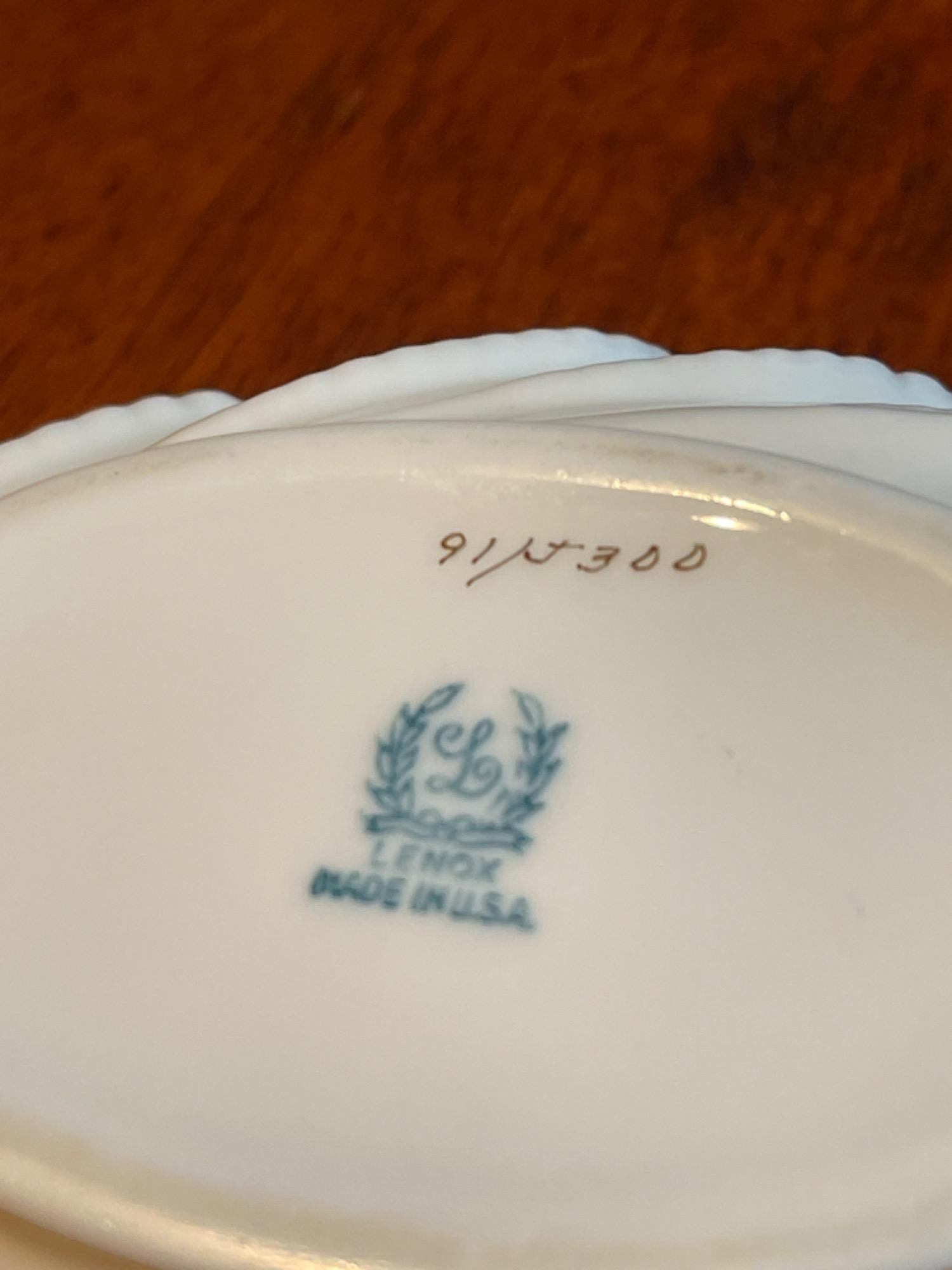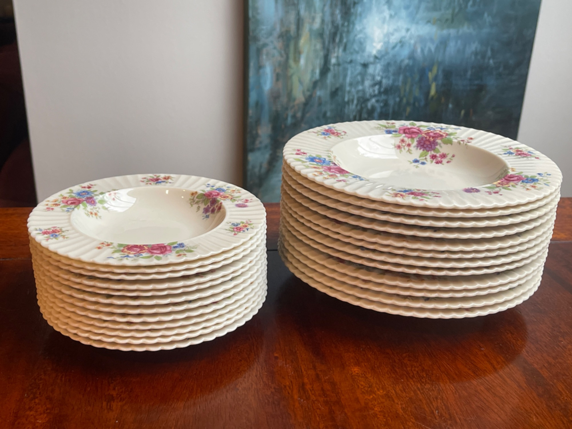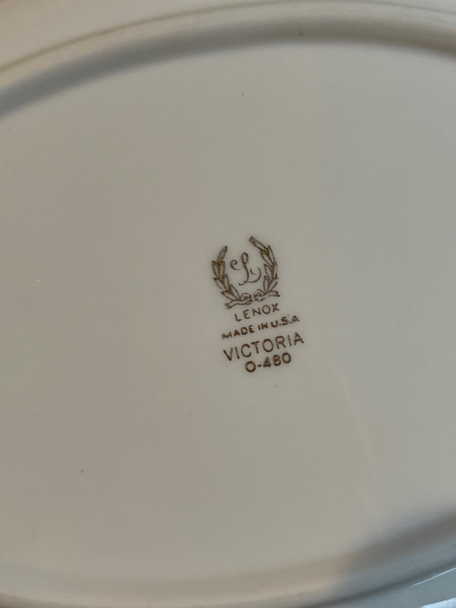 Elegant and timeless, this vintage Lenox "Victoria" pattern dinnerware set features delicate floral designs on a cream-colored base with a ribbed edge. A beautiful addition to any collection or formal table setting.