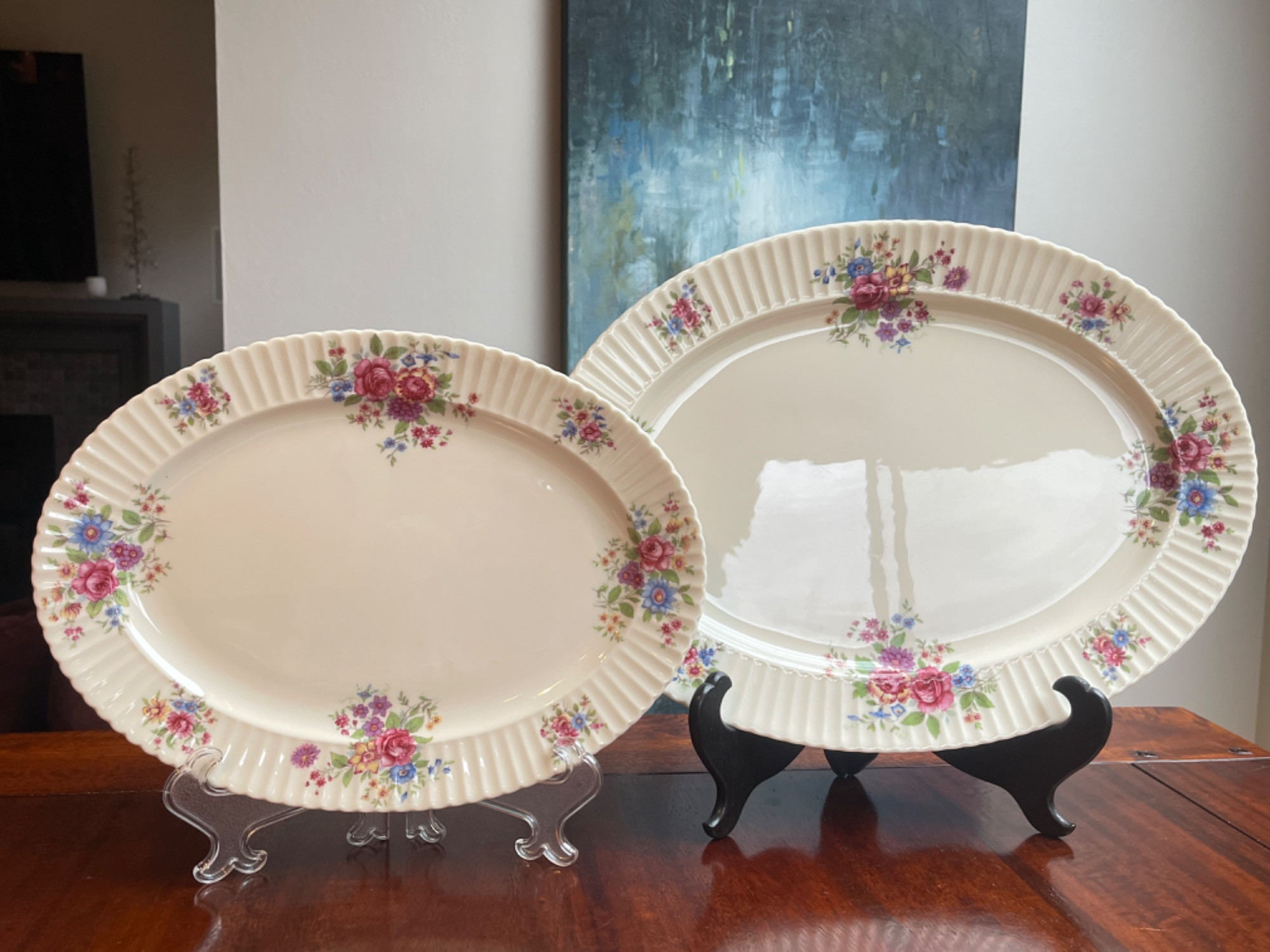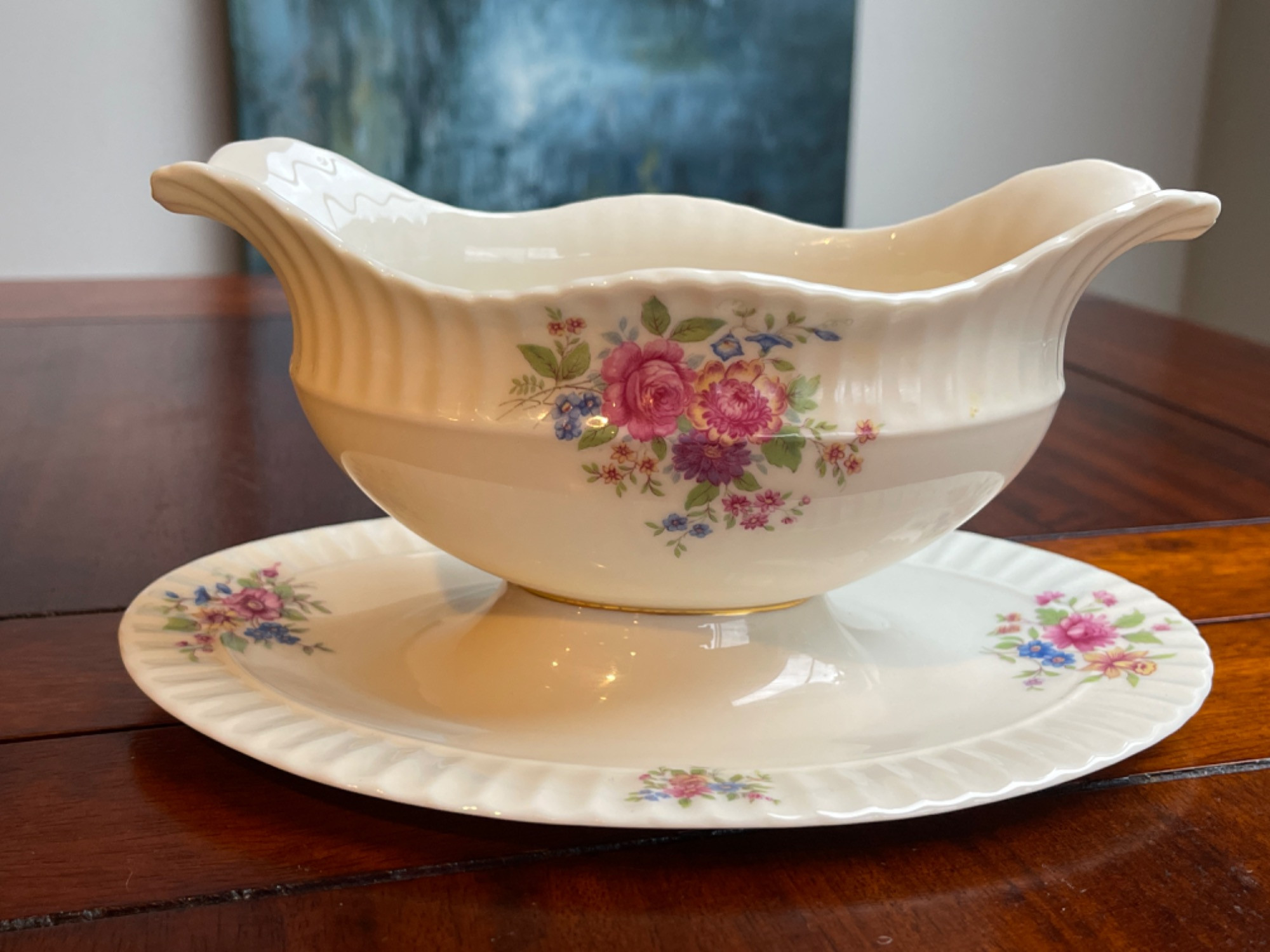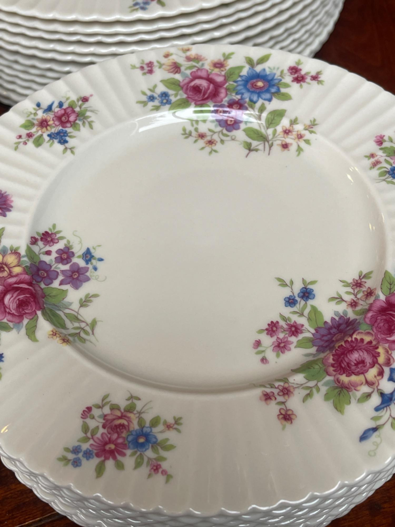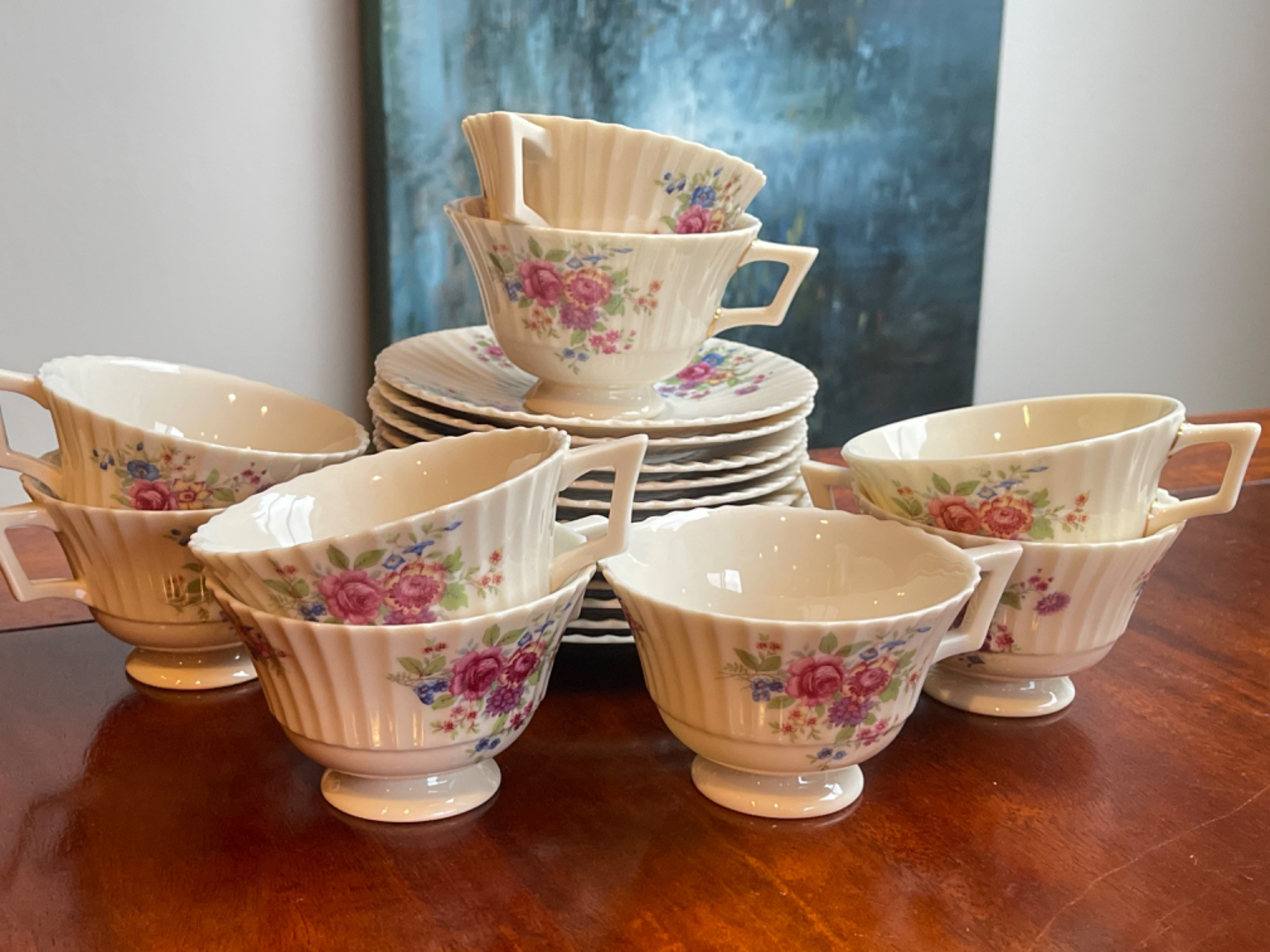 Elegant and timeless, this vintage Lenox "Victoria" pattern dinnerware set features delicate floral designs on a cream-colored base with a ribbed edge. A beautiful addition to any collection or formal table setting.