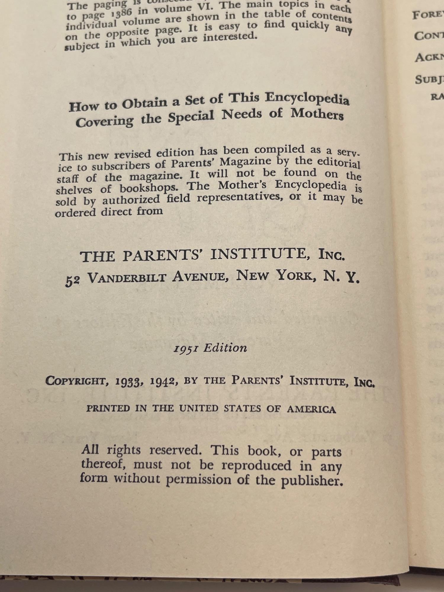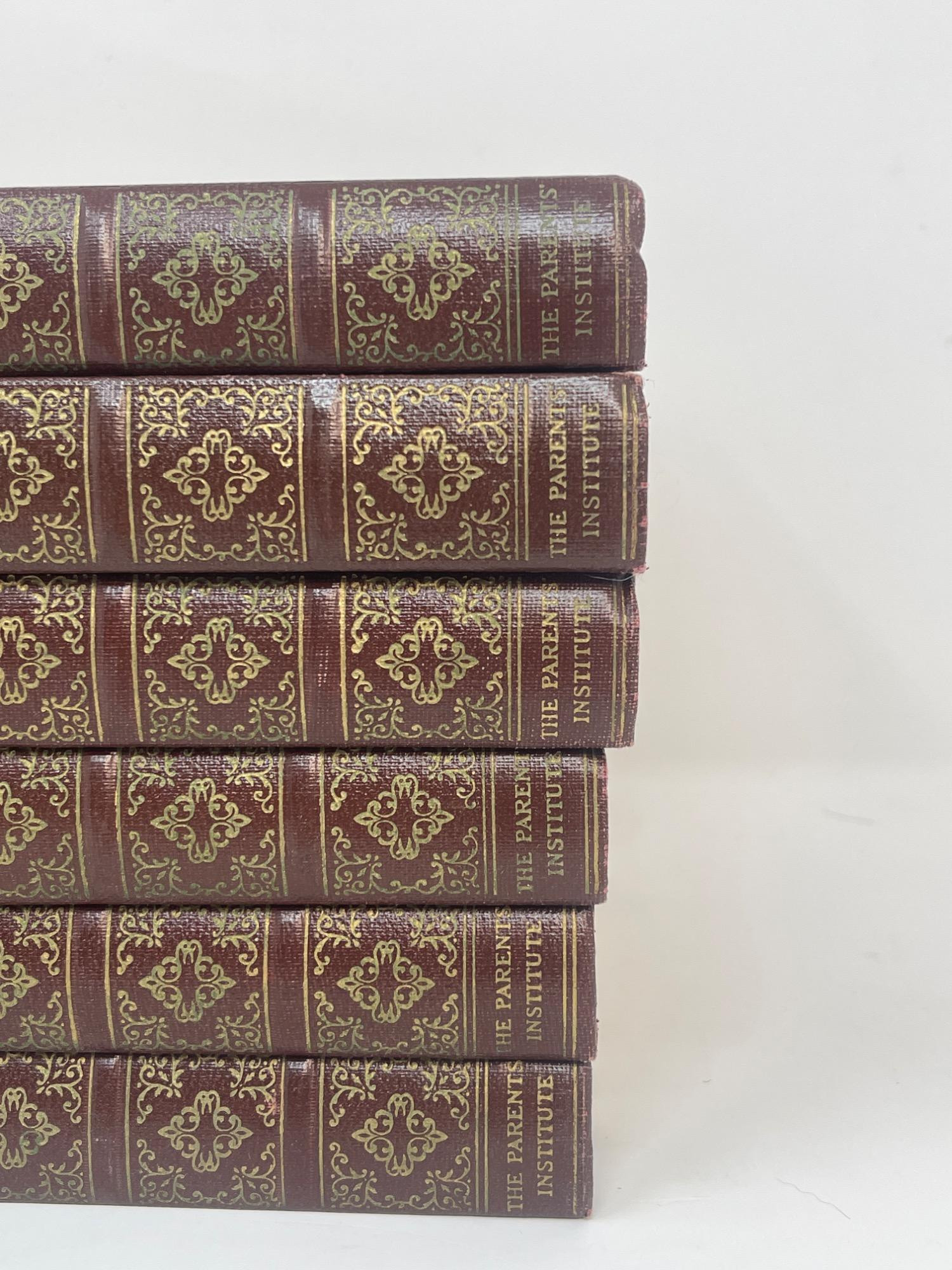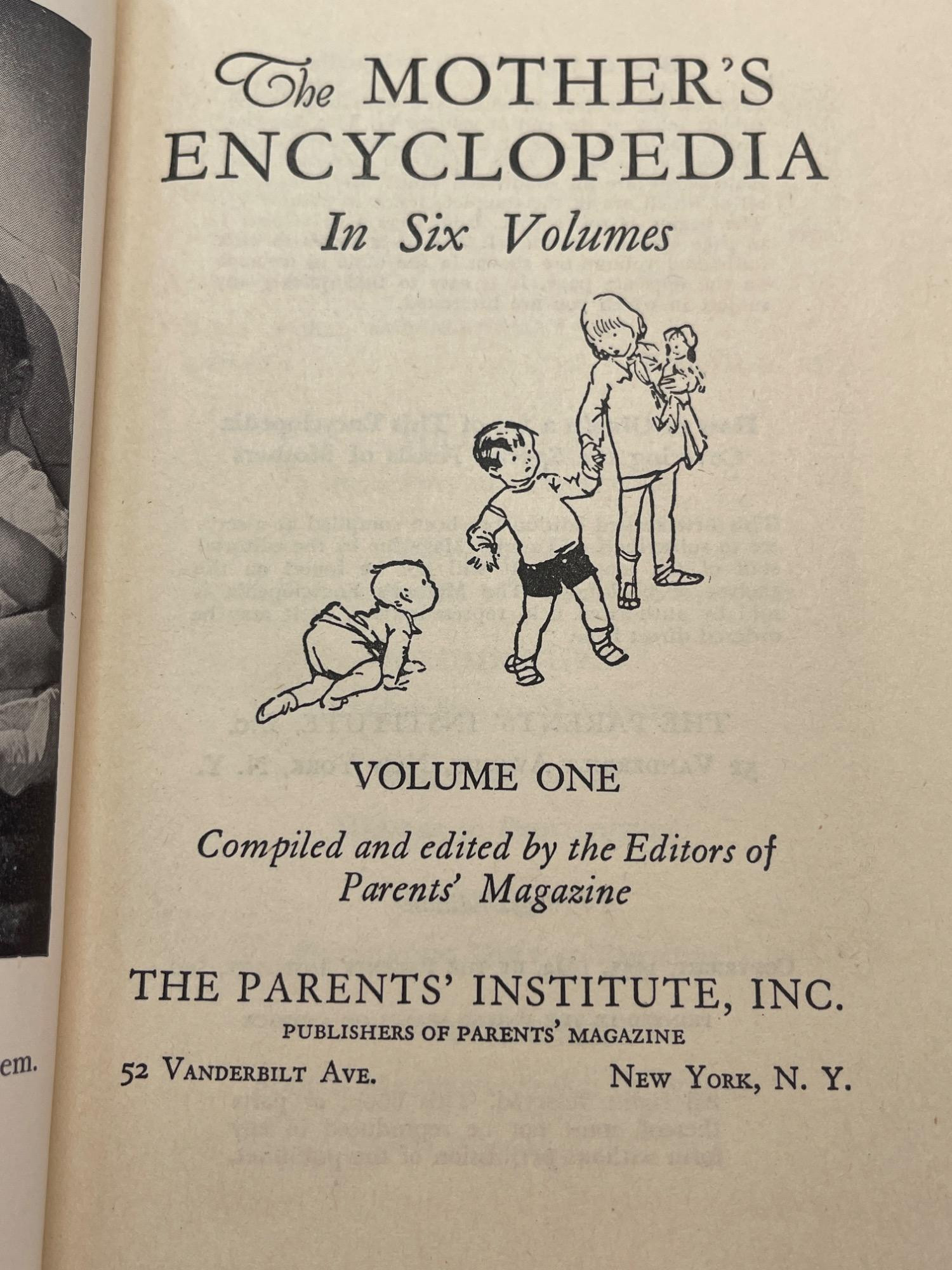 This 1951 edition of "Mother’s Encyclopedia" is a six-volume reference collection published by The Parents’ Institute. Bound in rich brown faux leather with elegant gilt detailing on the spine, these books provide a comprehensive guide to child-rearing, home management, and family life as seen through the lens of mid-20th-century America. Condition: