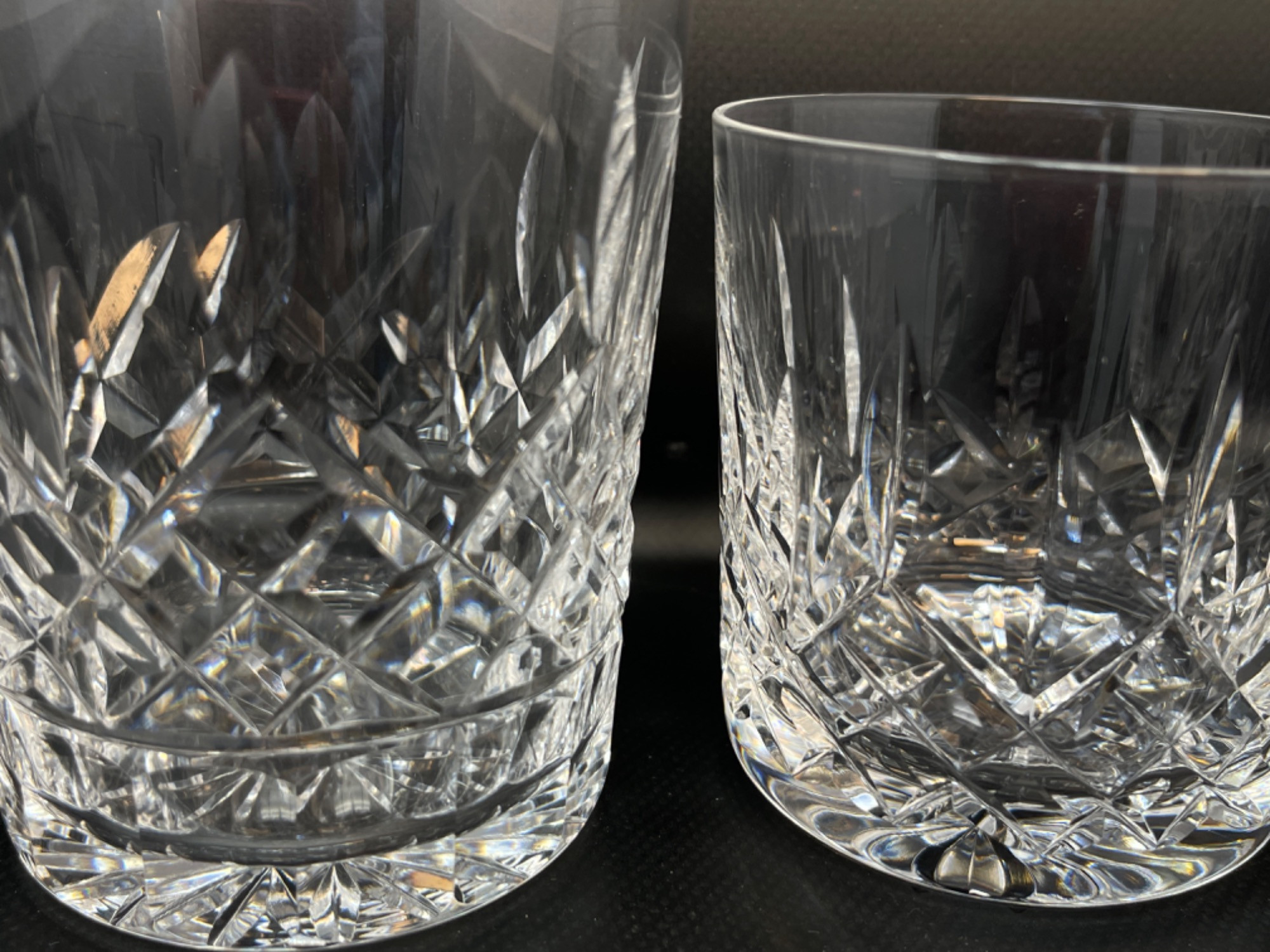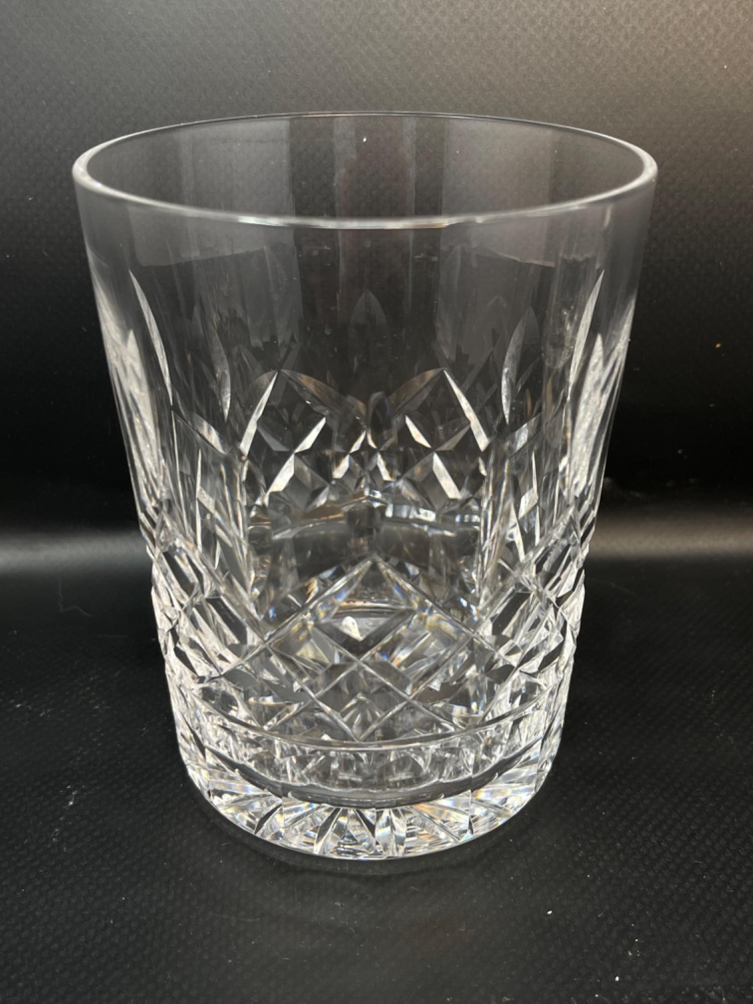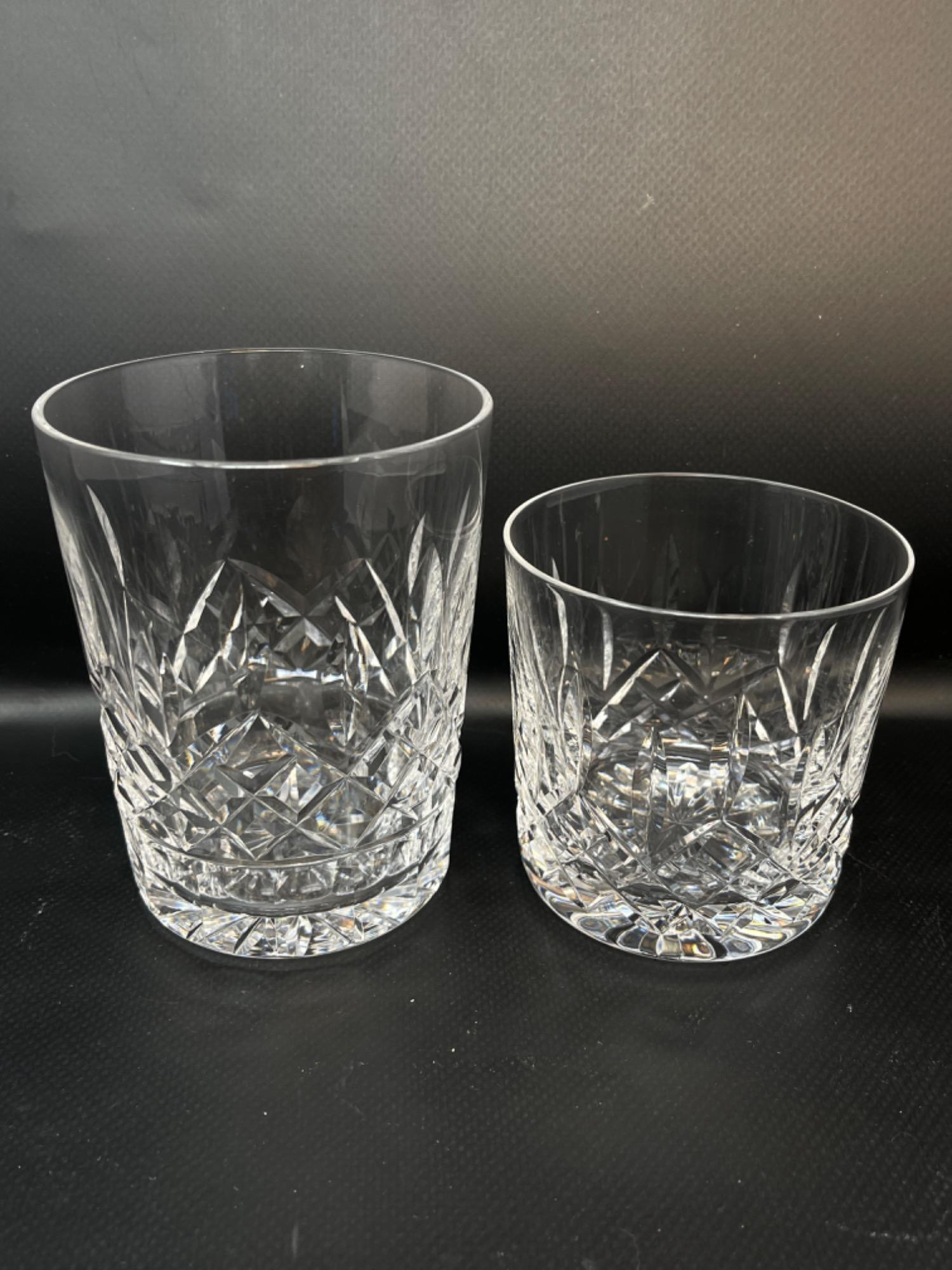 Elegant Waterford Lismore crystal glasses featuring the iconic diamond and wedge cut pattern that defines this timeless collection. This set of eight includes seven smaller glasses and one larger glass, perfect for adding classic sophistication to your barware collection. (7) Small Glasses – 3.25” H