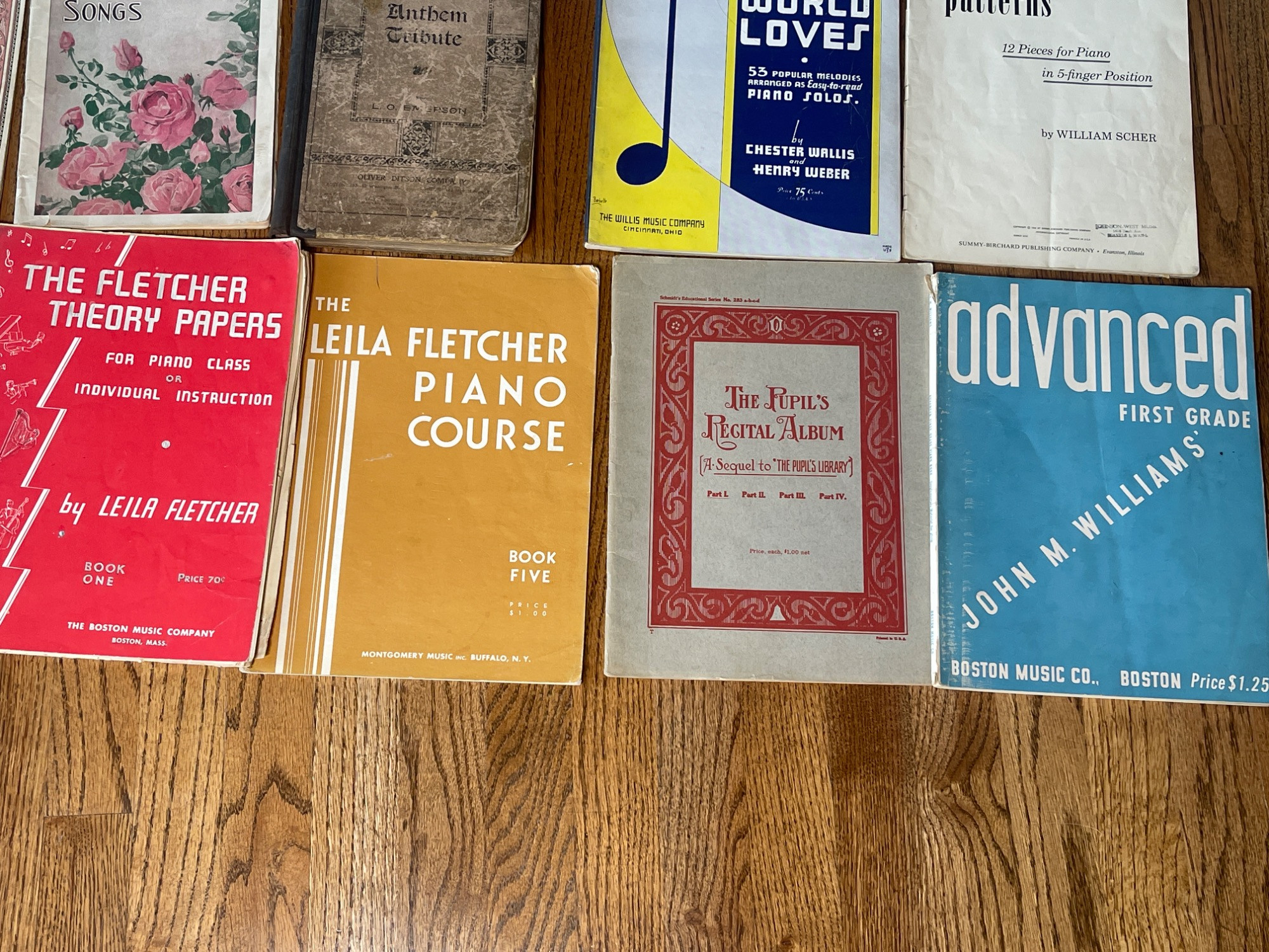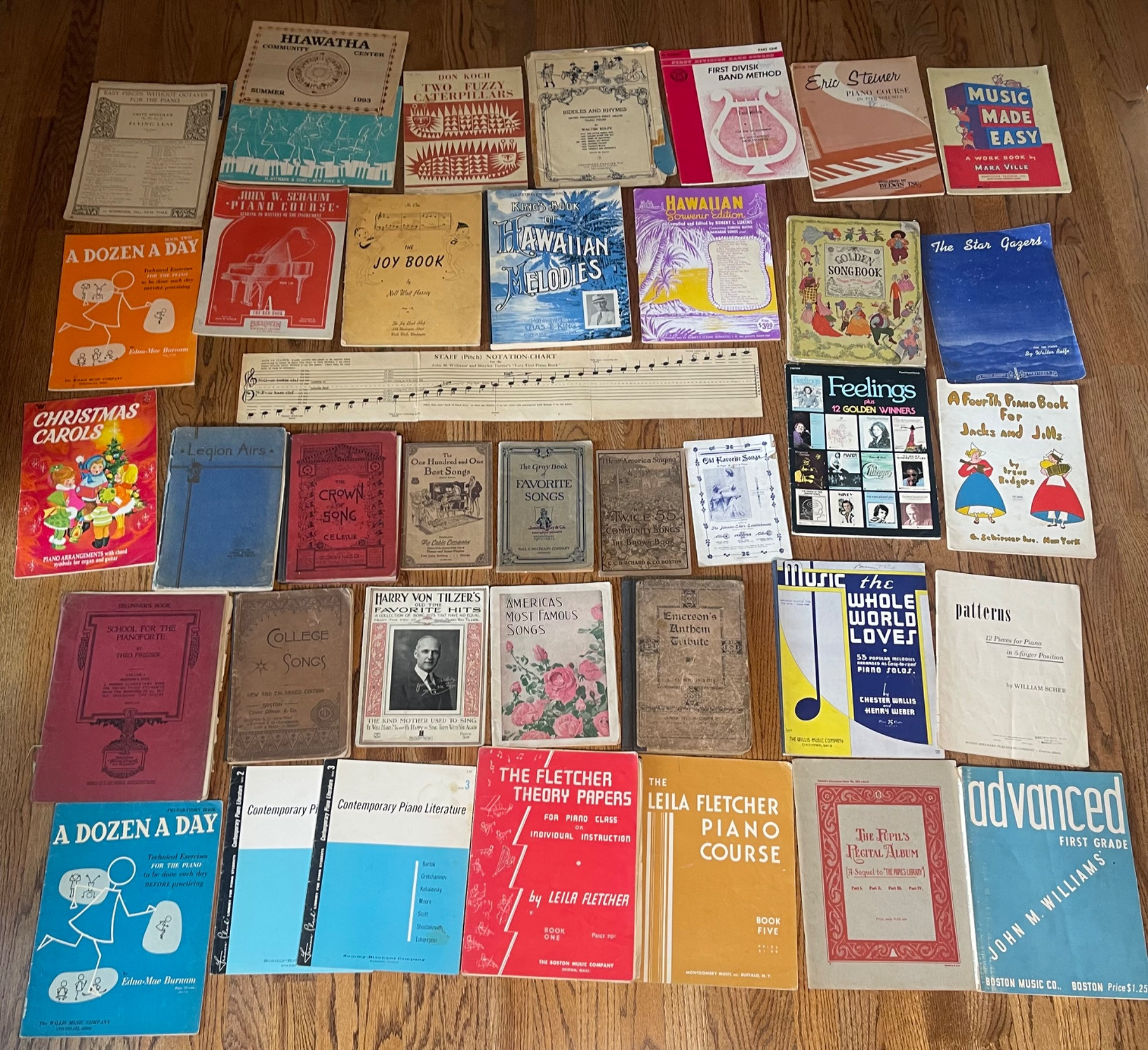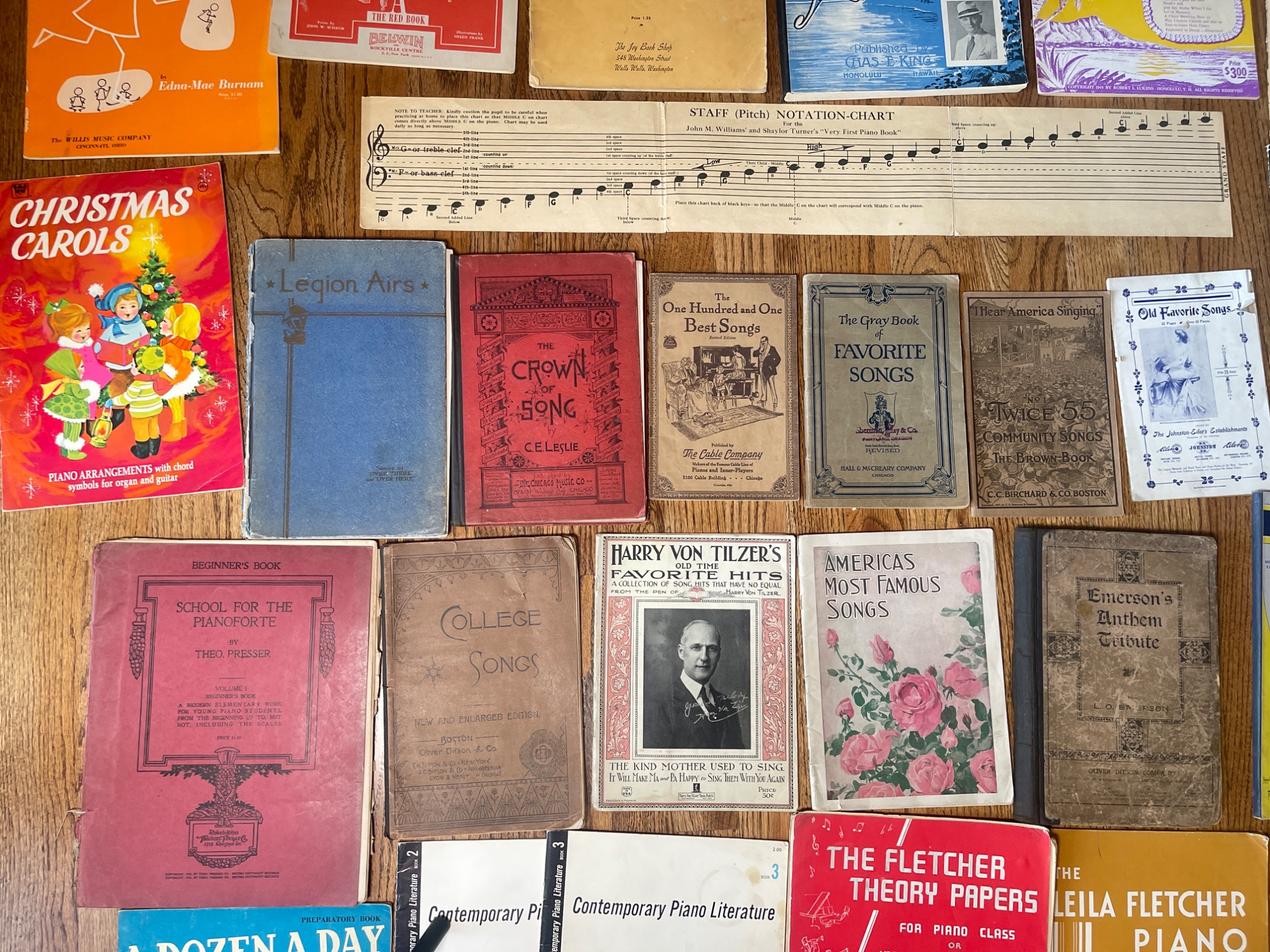 Diverse collection of vintage and antique songbooks, piano instruction books, and sheet music covering various musical styles and time periods. Includes classic favorites, instructional guides, and unique finds. Condition: All are very used and worn.
