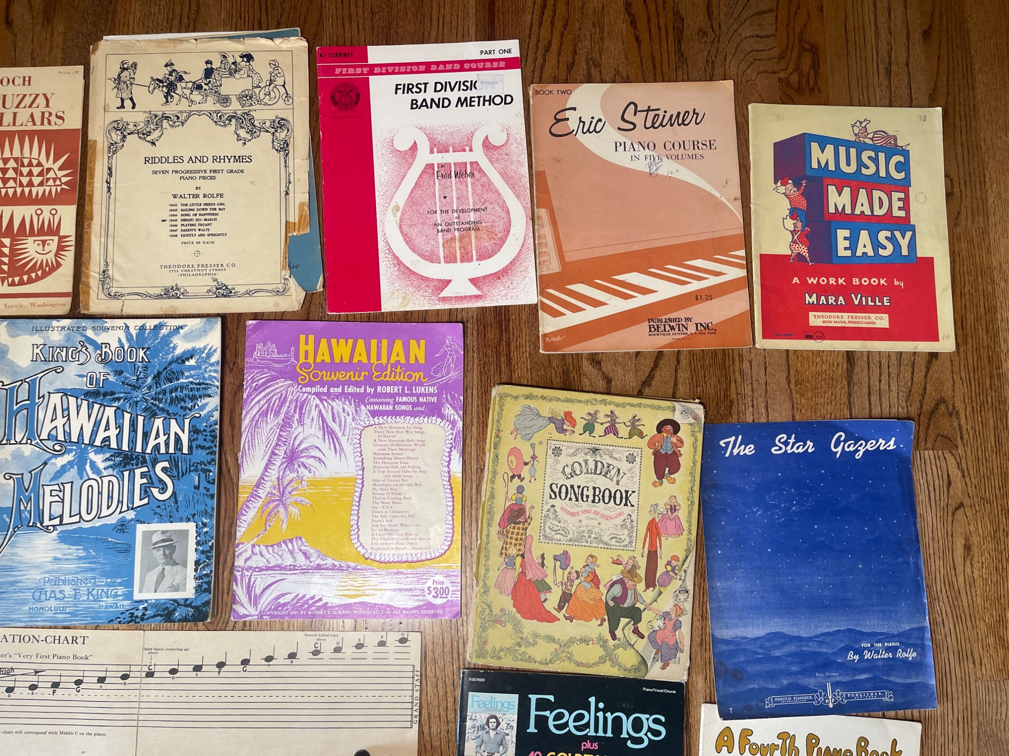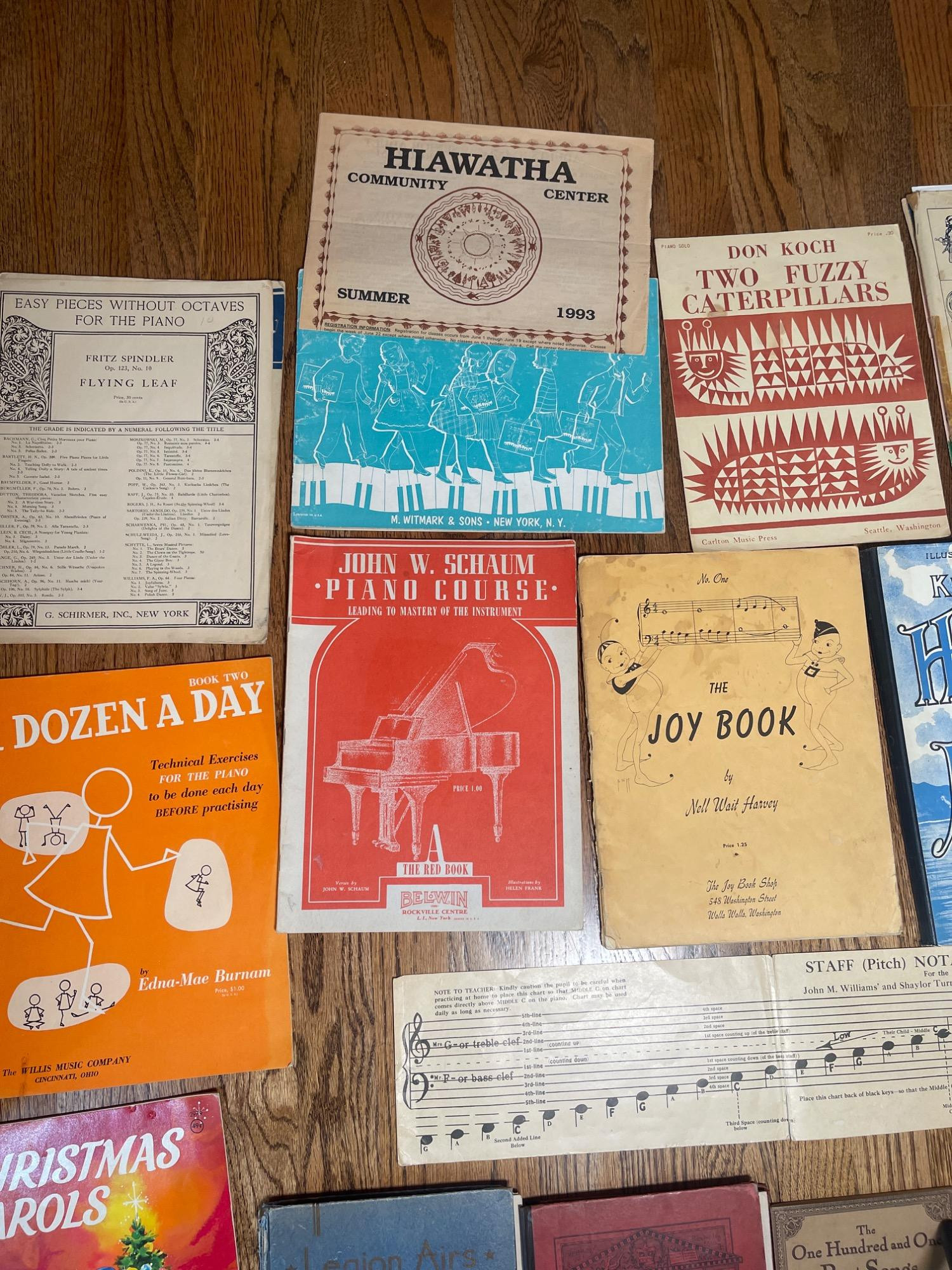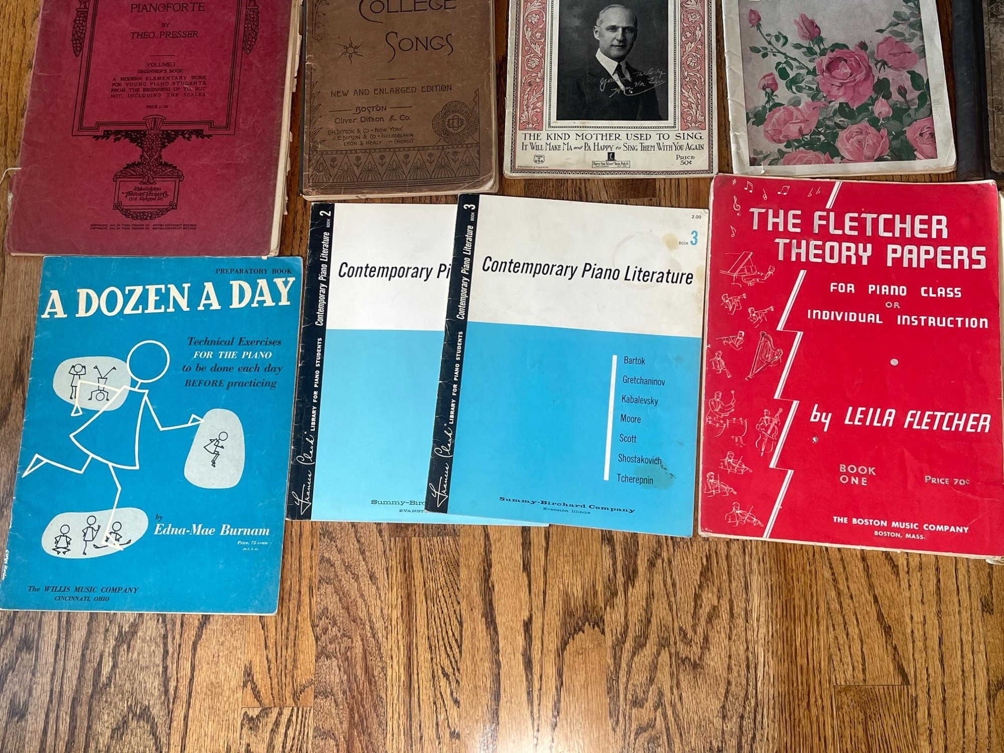 Diverse collection of vintage and antique songbooks, piano instruction books, and sheet music covering various musical styles and time periods. Includes classic favorites, instructional guides, and unique finds. Condition: All are very used and worn.