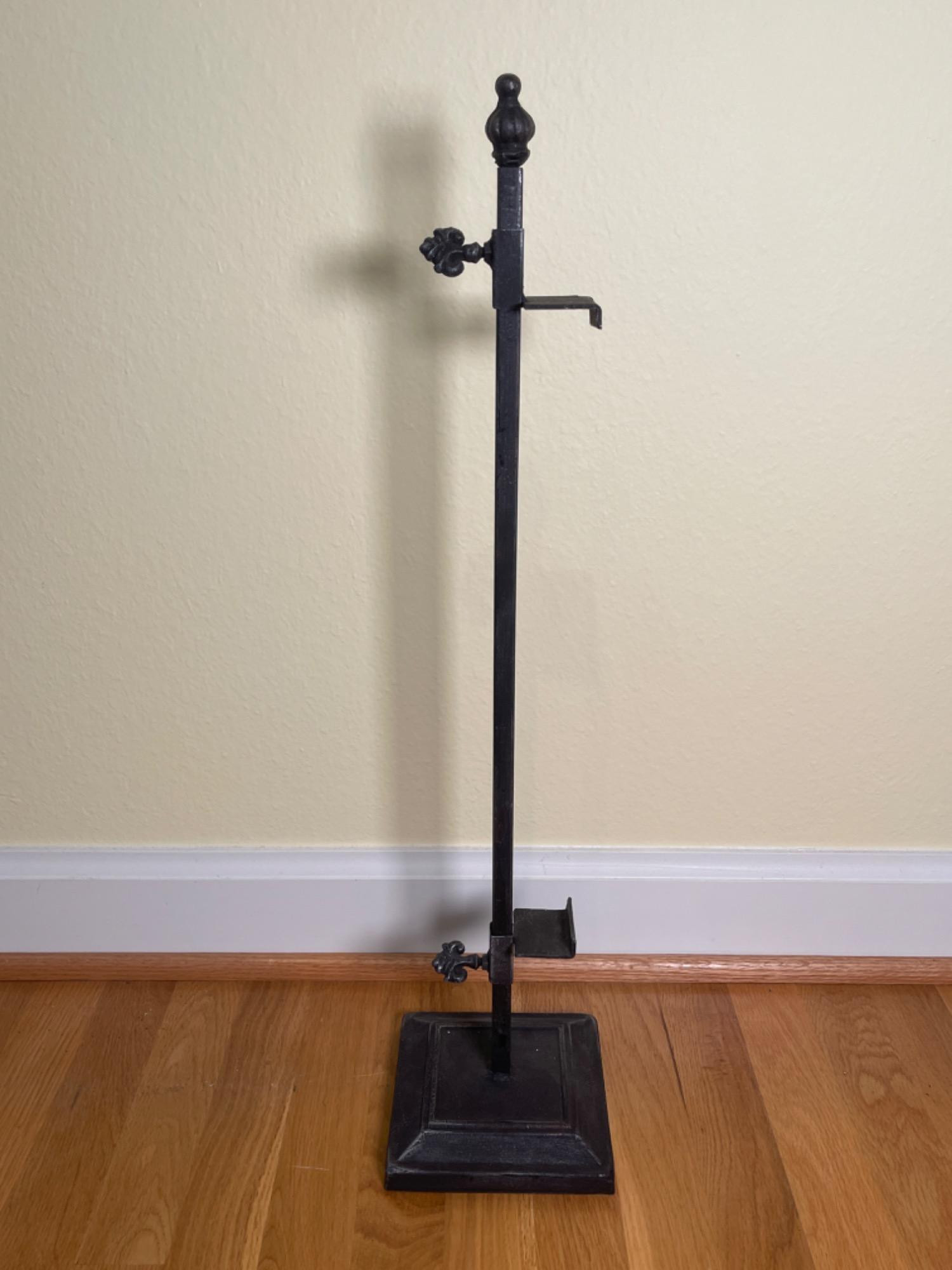 Vintage Cast Iron Adjustable Holder Stand – 26.25” H This vintage cast iron adjustable stand features an elegant black finish, a square base, and decorative adjustment knobs. Likely used for holding tools, lamps, or other functional accessories, it offers a sturdy and timeless design Condition: