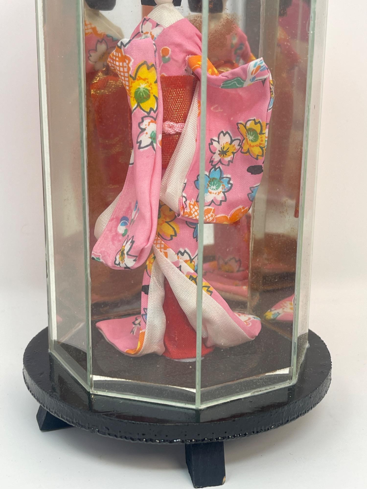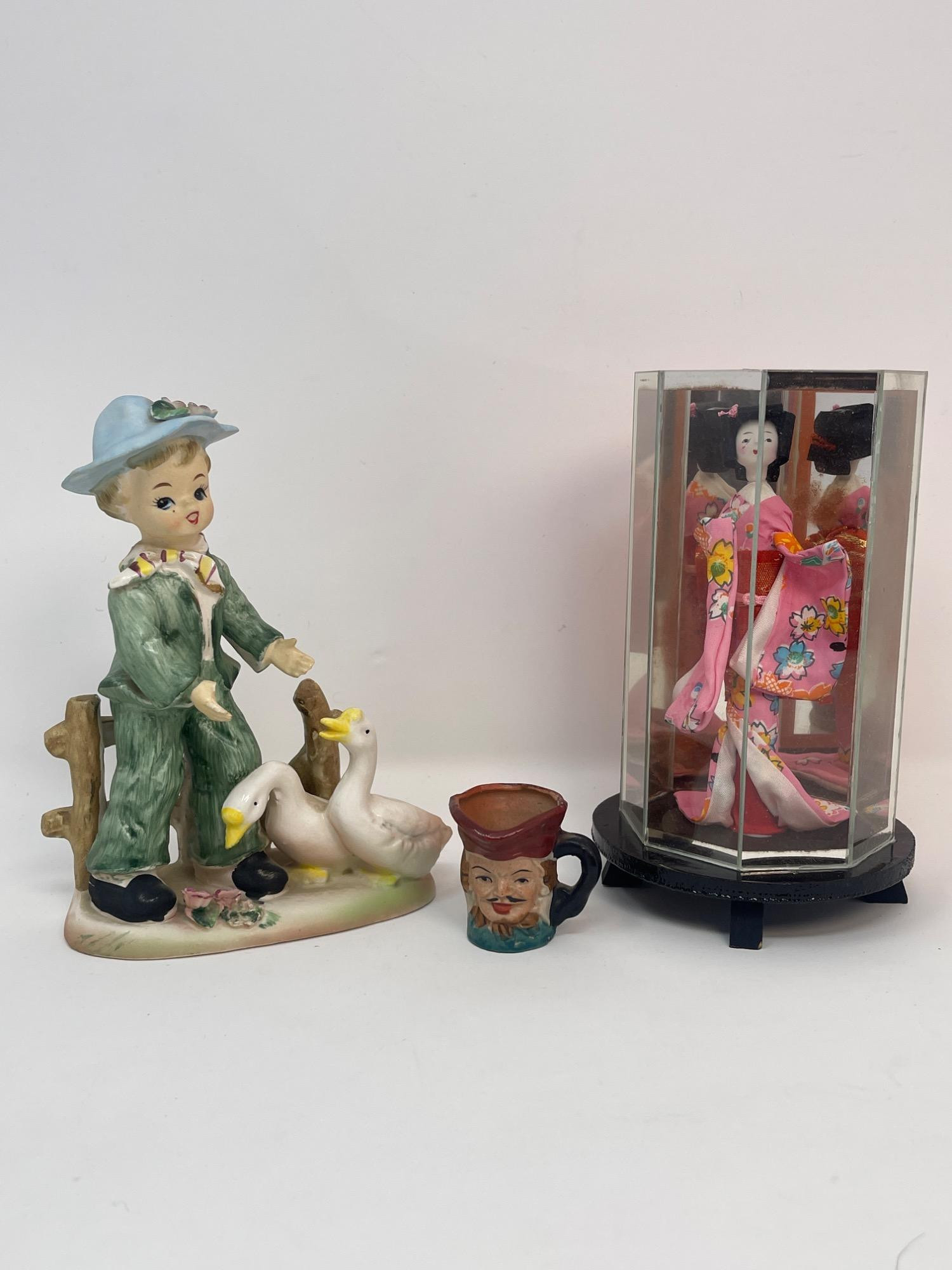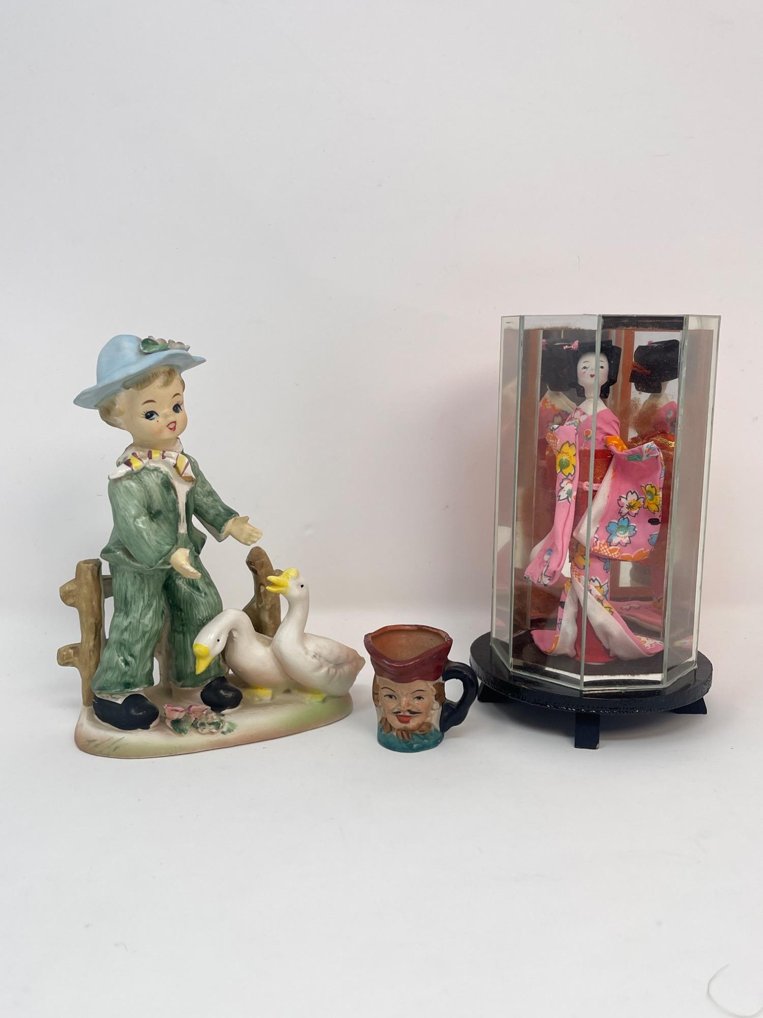 Charming collection of Japanese porcelain and decorative items, including a porcelain boy with geese, a traditional Japanese doll in a display case, and a mini character mug.