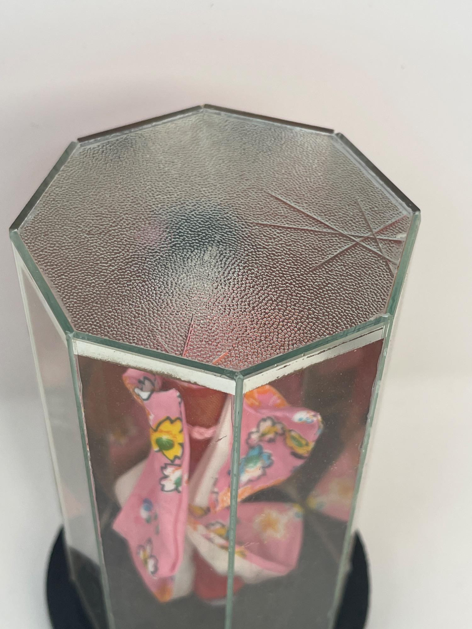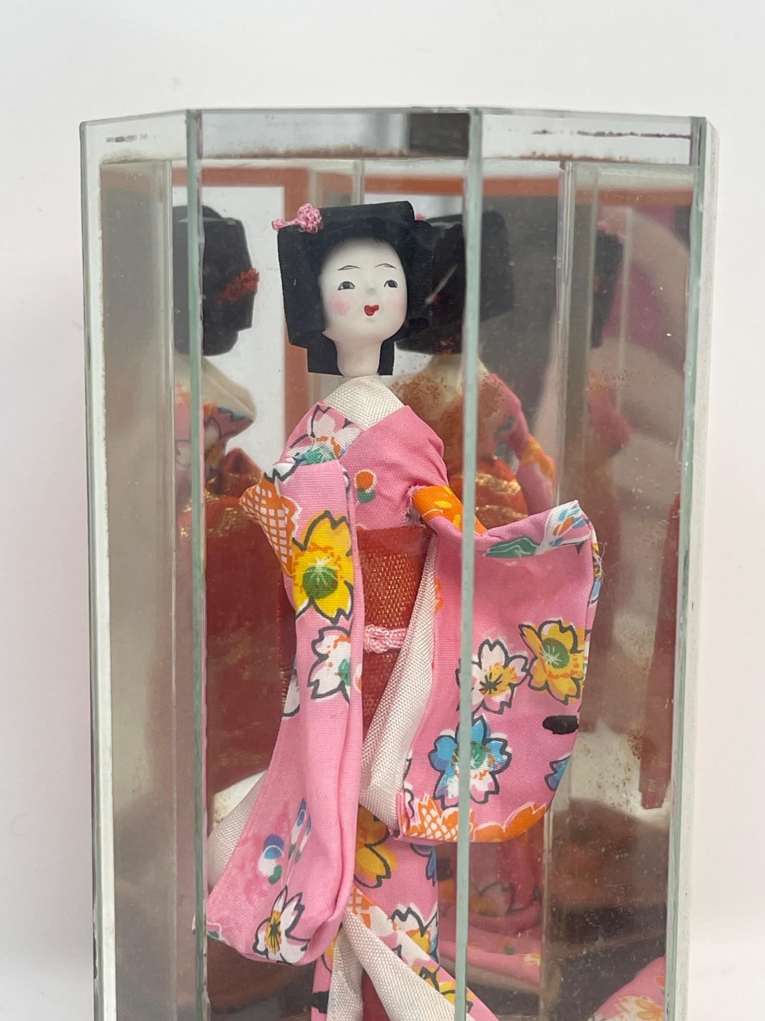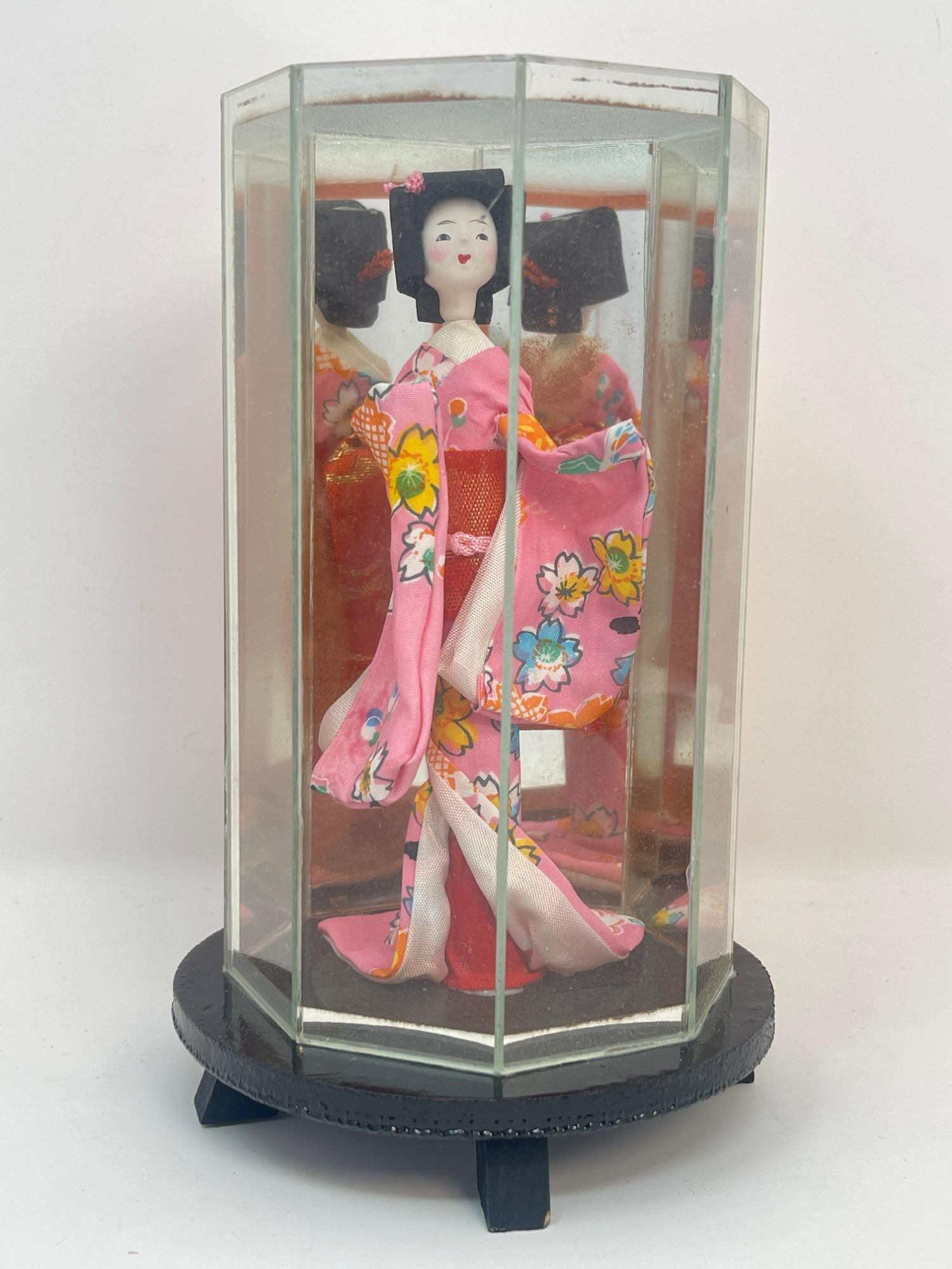 Charming collection of Japanese porcelain and decorative items, including a porcelain boy with geese, a traditional Japanese doll in a display case, and a mini character mug.