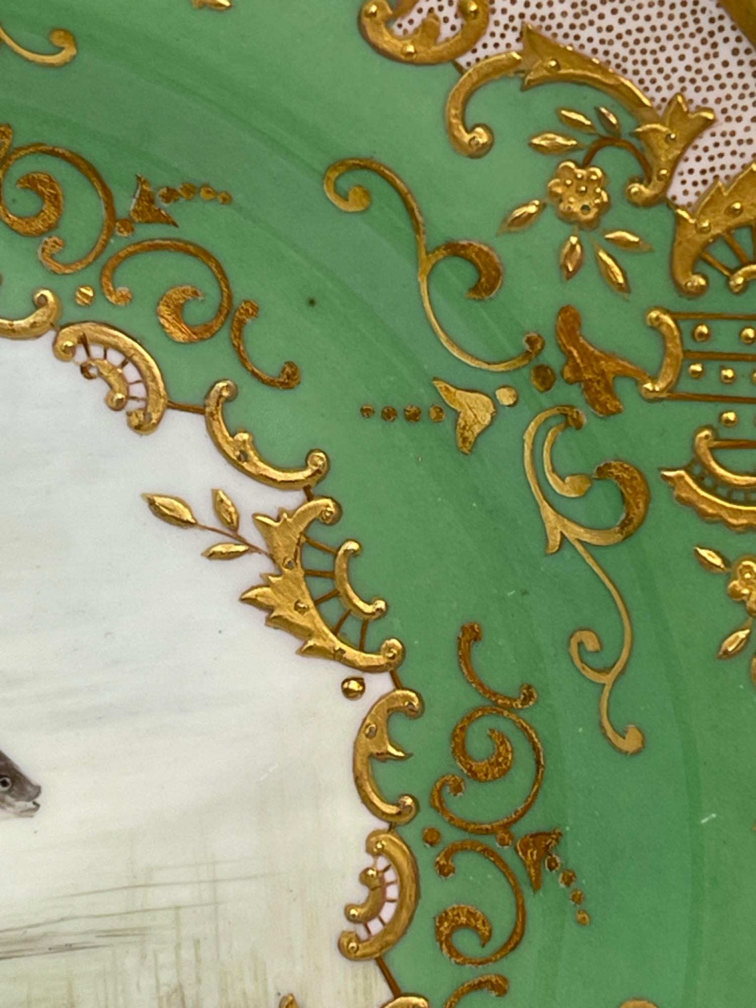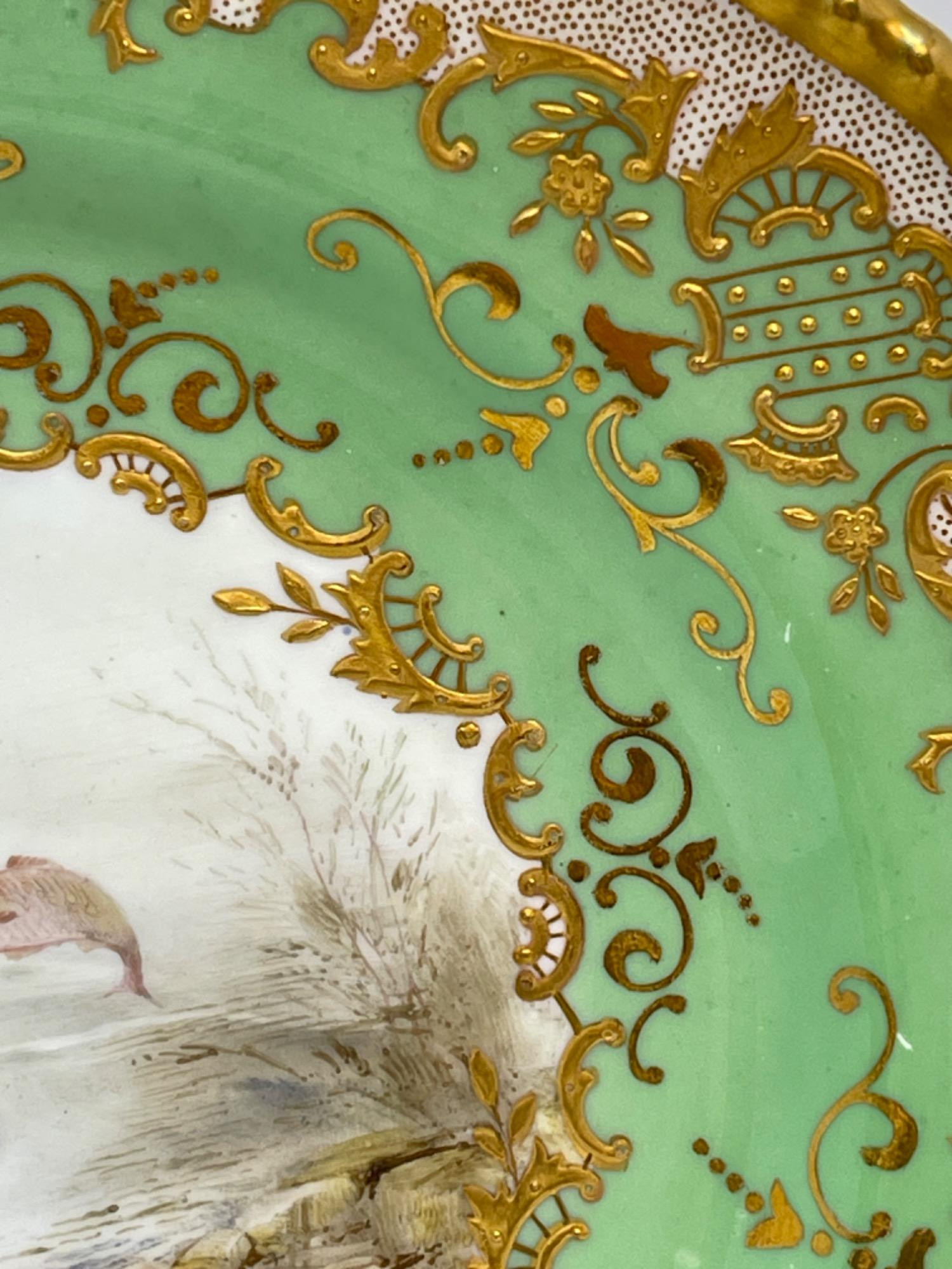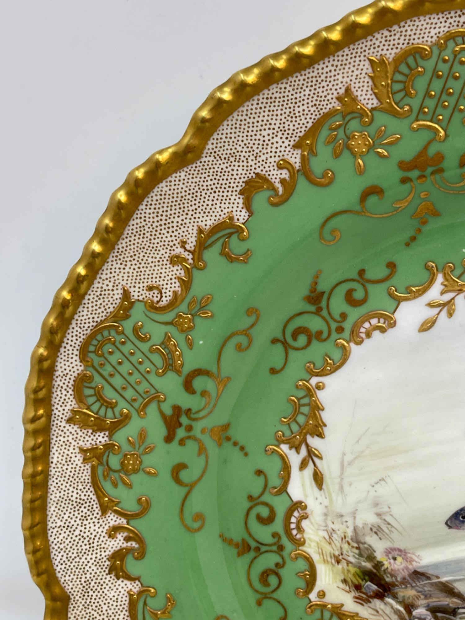This exquisite trio of antique Coalport England porcelain plates showcases rich green backgrounds, elaborate raised gold detailing, and masterfully hand-painted fish scenes at the center. Each plate is a fine example of 19th-century English craftsmanship, featuring a scalloped edge and intricate gilded flourishes.