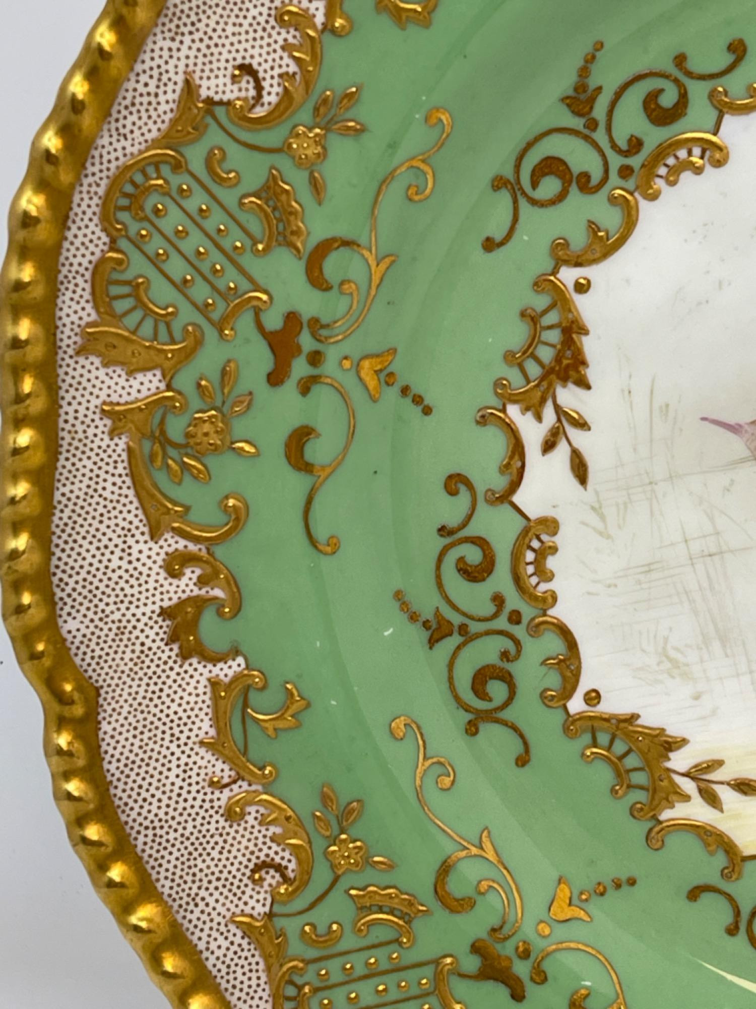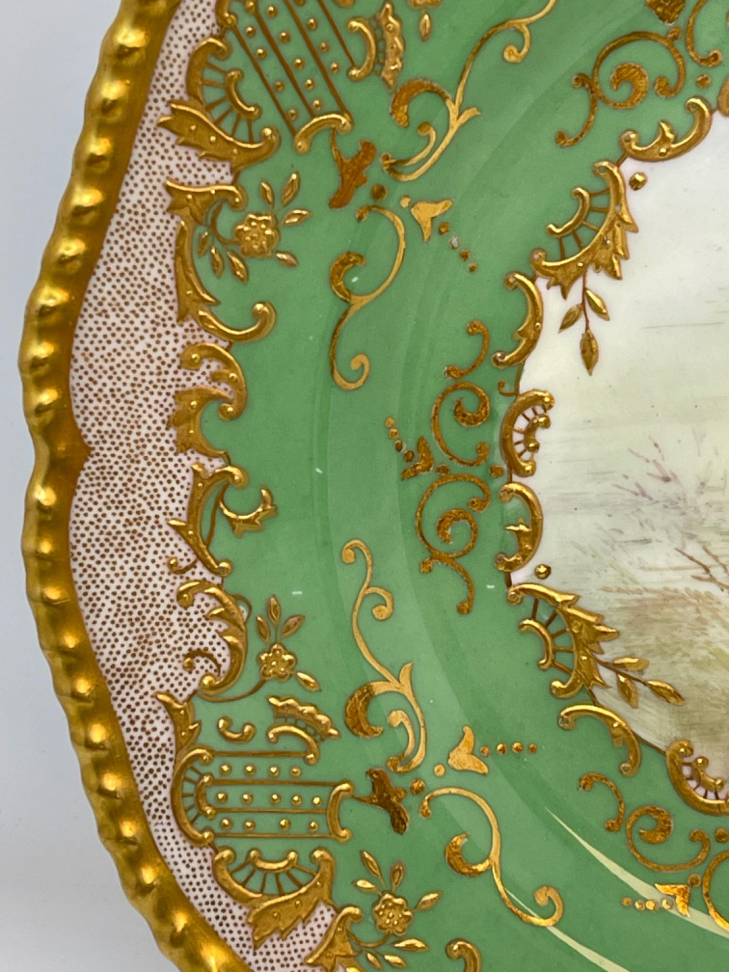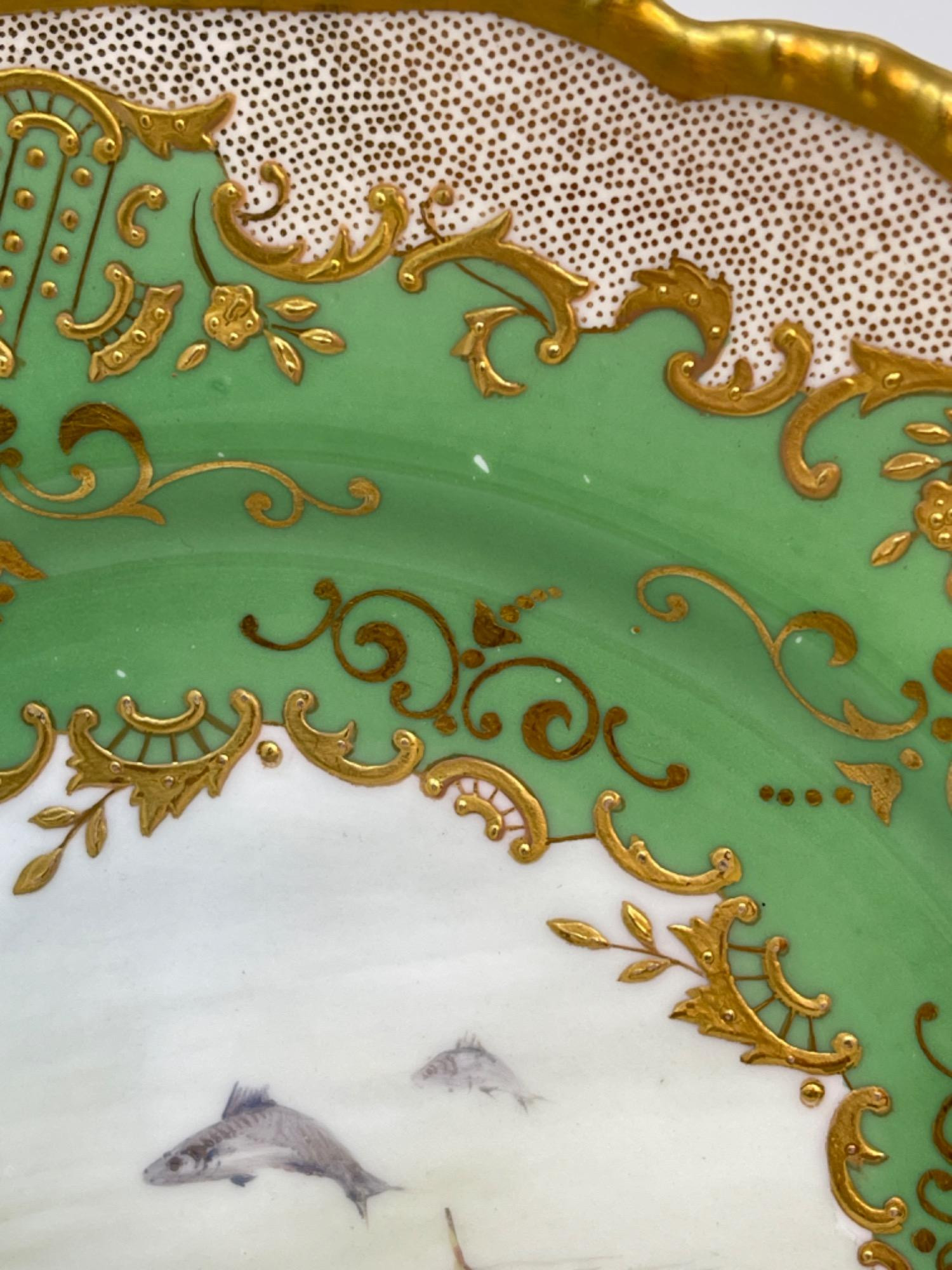 This exquisite trio of antique Coalport England porcelain plates showcases rich green backgrounds, elaborate raised gold detailing, and masterfully hand-painted fish scenes at the center. Each plate is a fine example of 19th-century English craftsmanship, featuring a scalloped edge and intricate gilded flourishes.