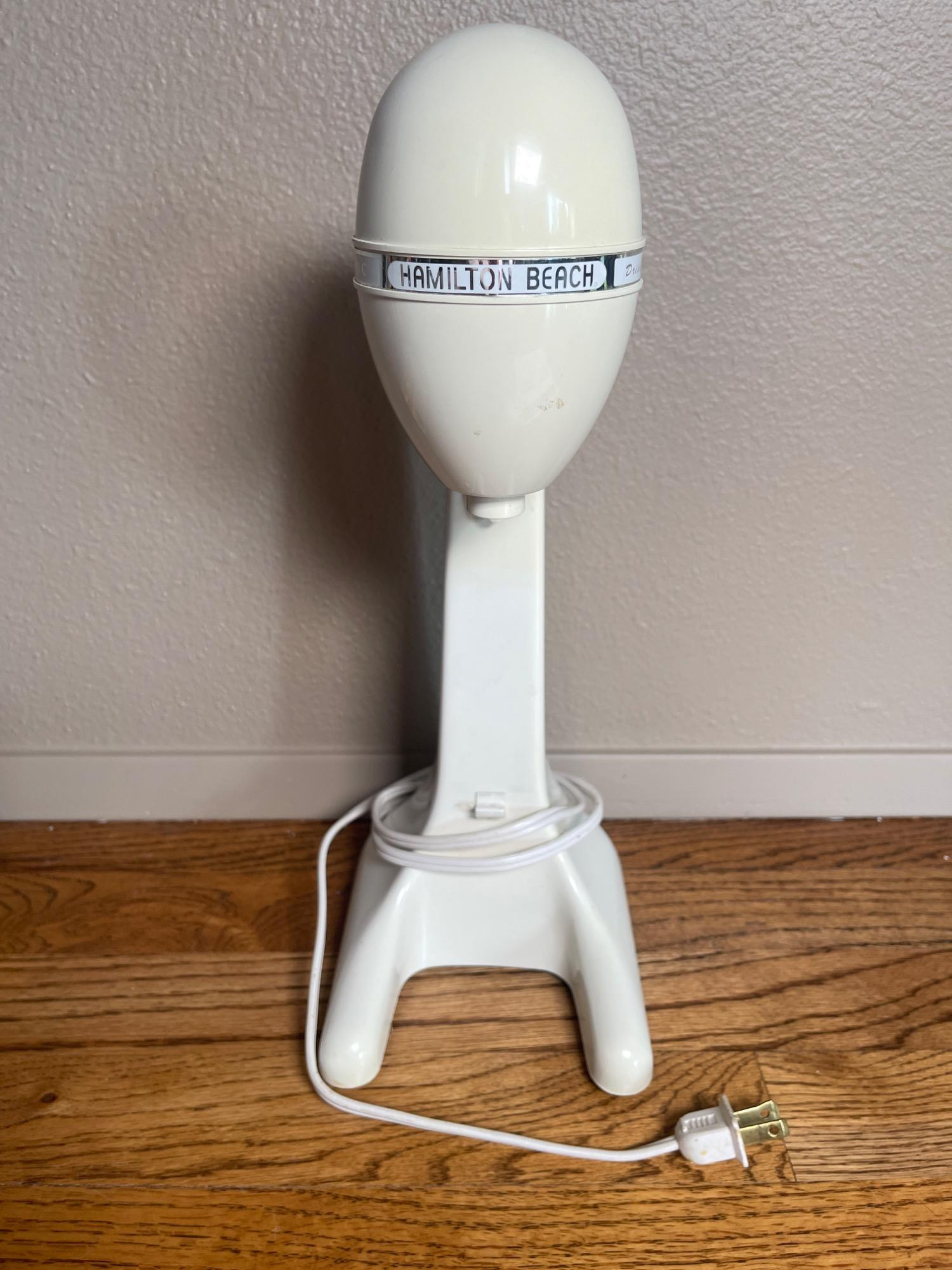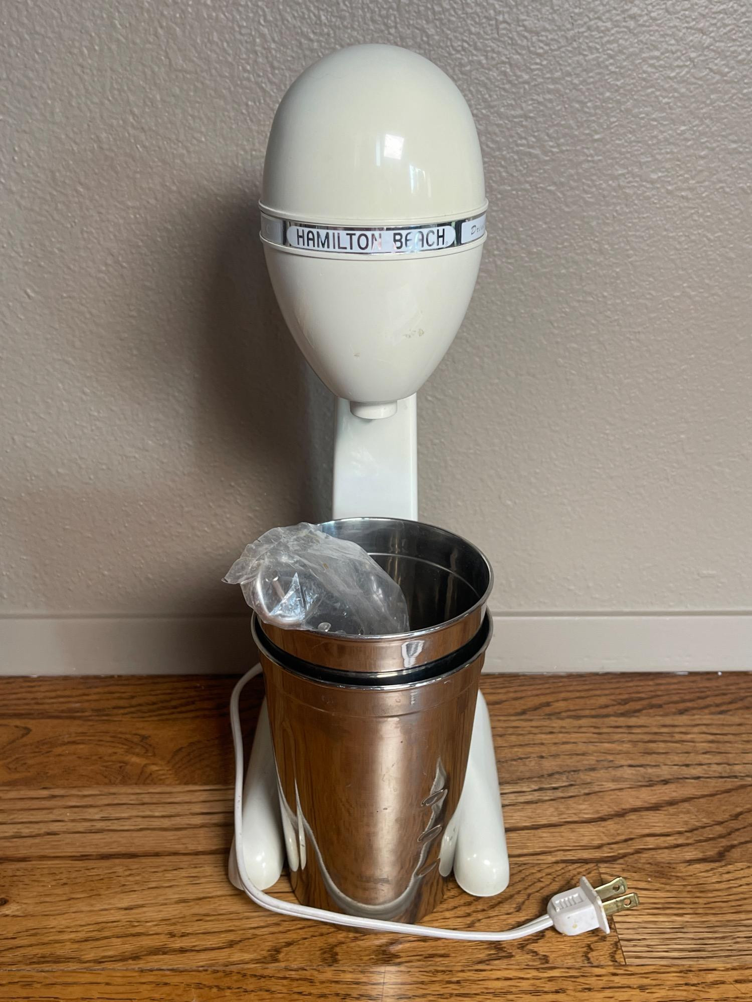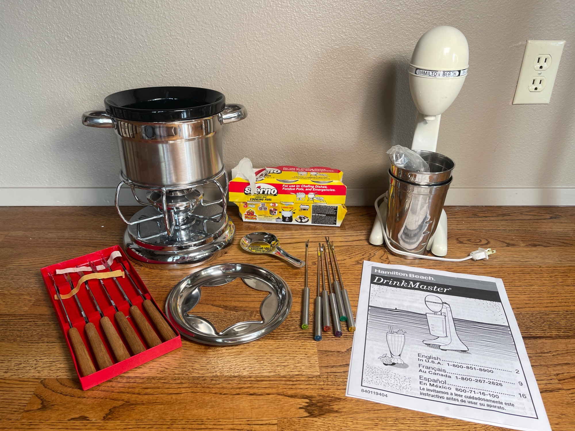 This set includes a classic stainless steel fondue pot with a black ceramic insert, complete with a stand and wooden-handled forks—perfect for entertaining or indulging in a cozy fondue night. Also included is a vintage Hamilton Beach DrinkMaster, a retro-style milkshake mixer that adds a nostalgic touch to any kitchen.