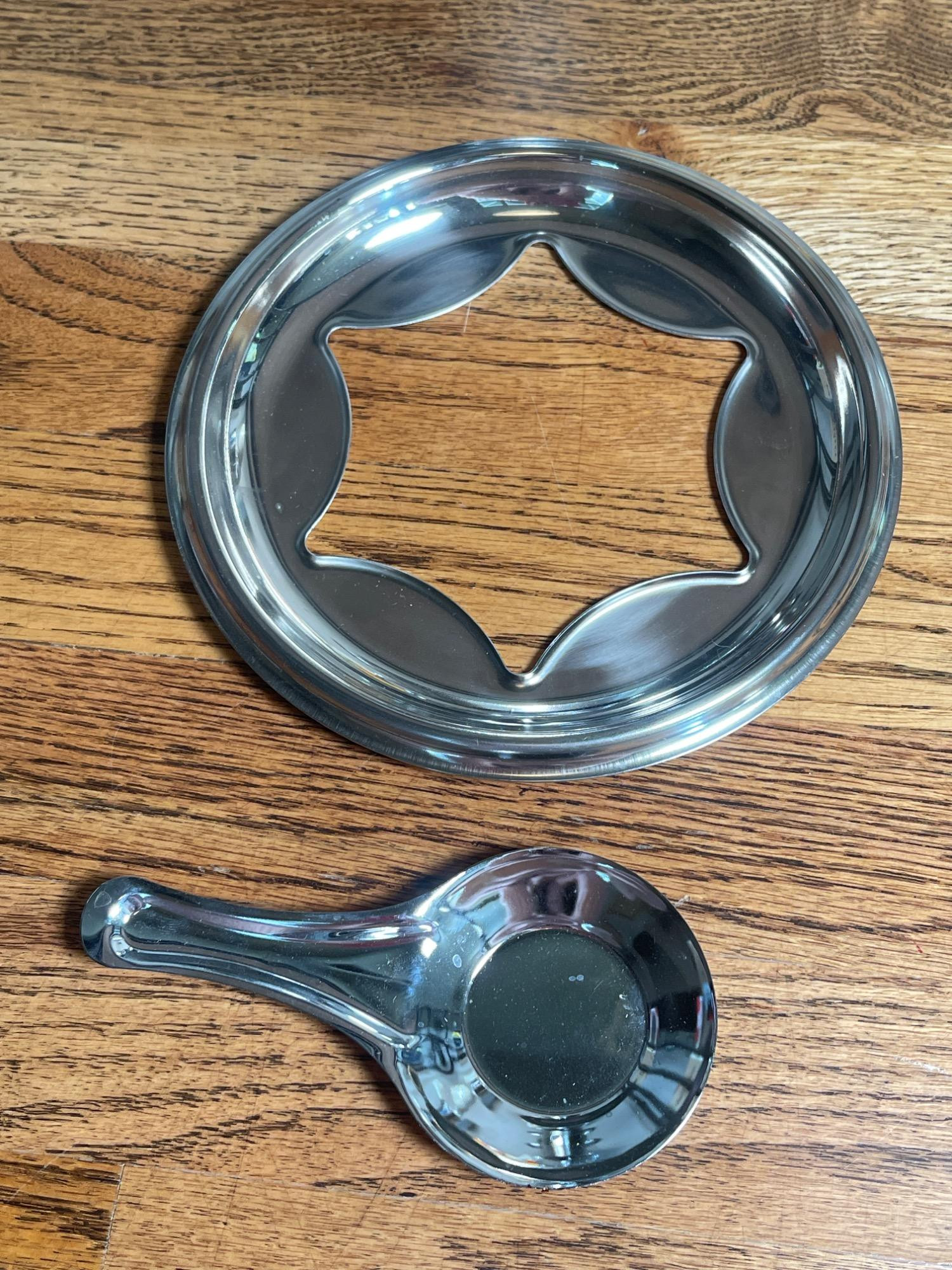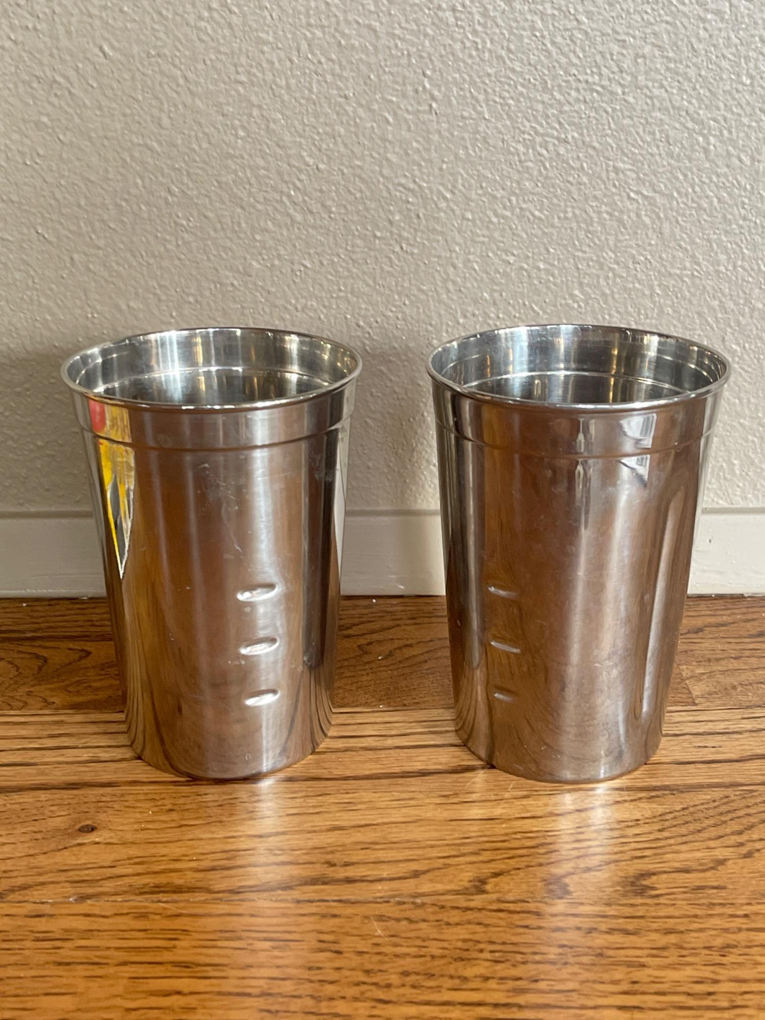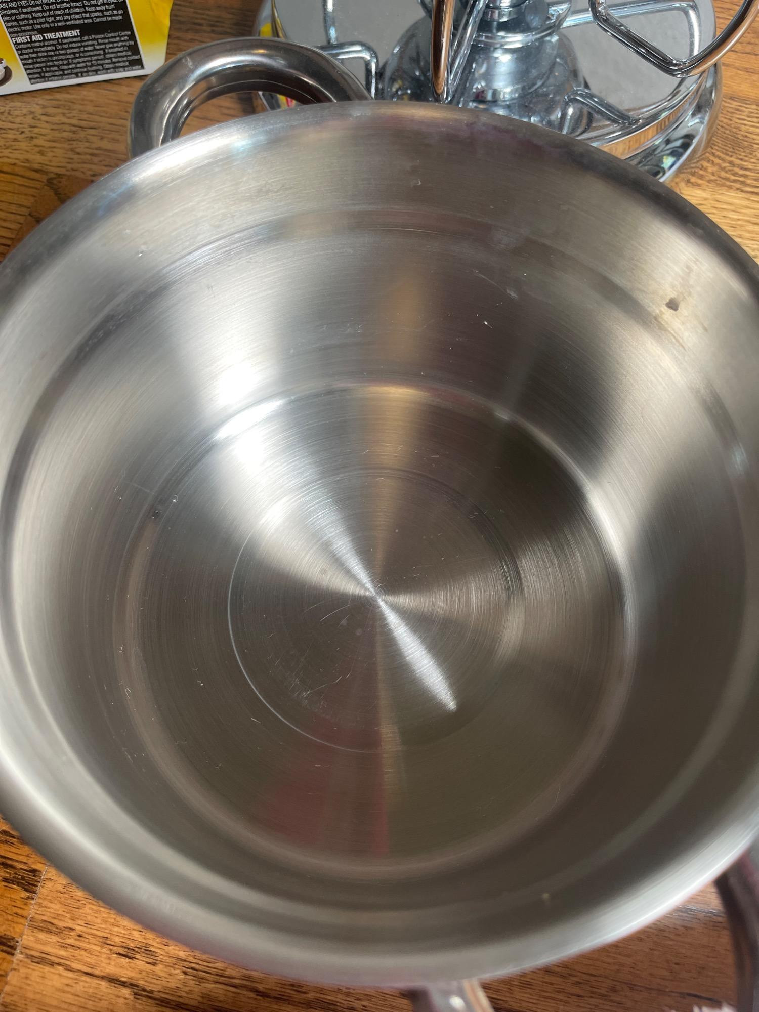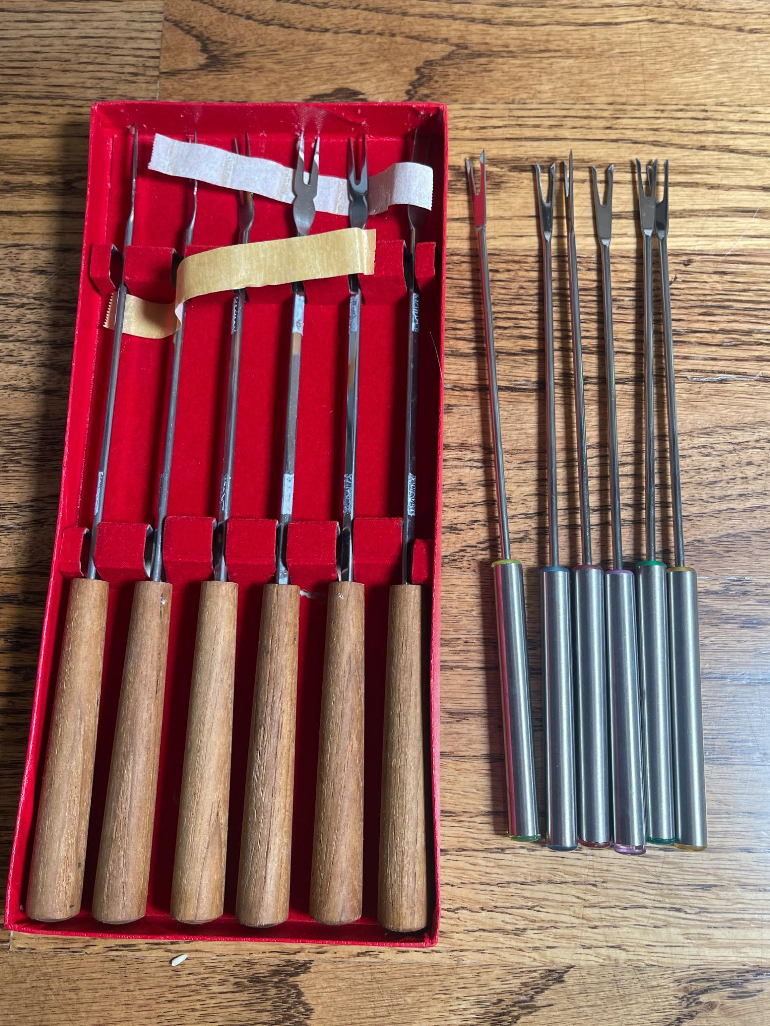 This set includes a classic stainless steel fondue pot with a black ceramic insert, complete with a stand and wooden-handled forks—perfect for entertaining or indulging in a cozy fondue night. Also included is a vintage Hamilton Beach DrinkMaster, a retro-style milkshake mixer that adds a nostalgic touch to any kitchen.
