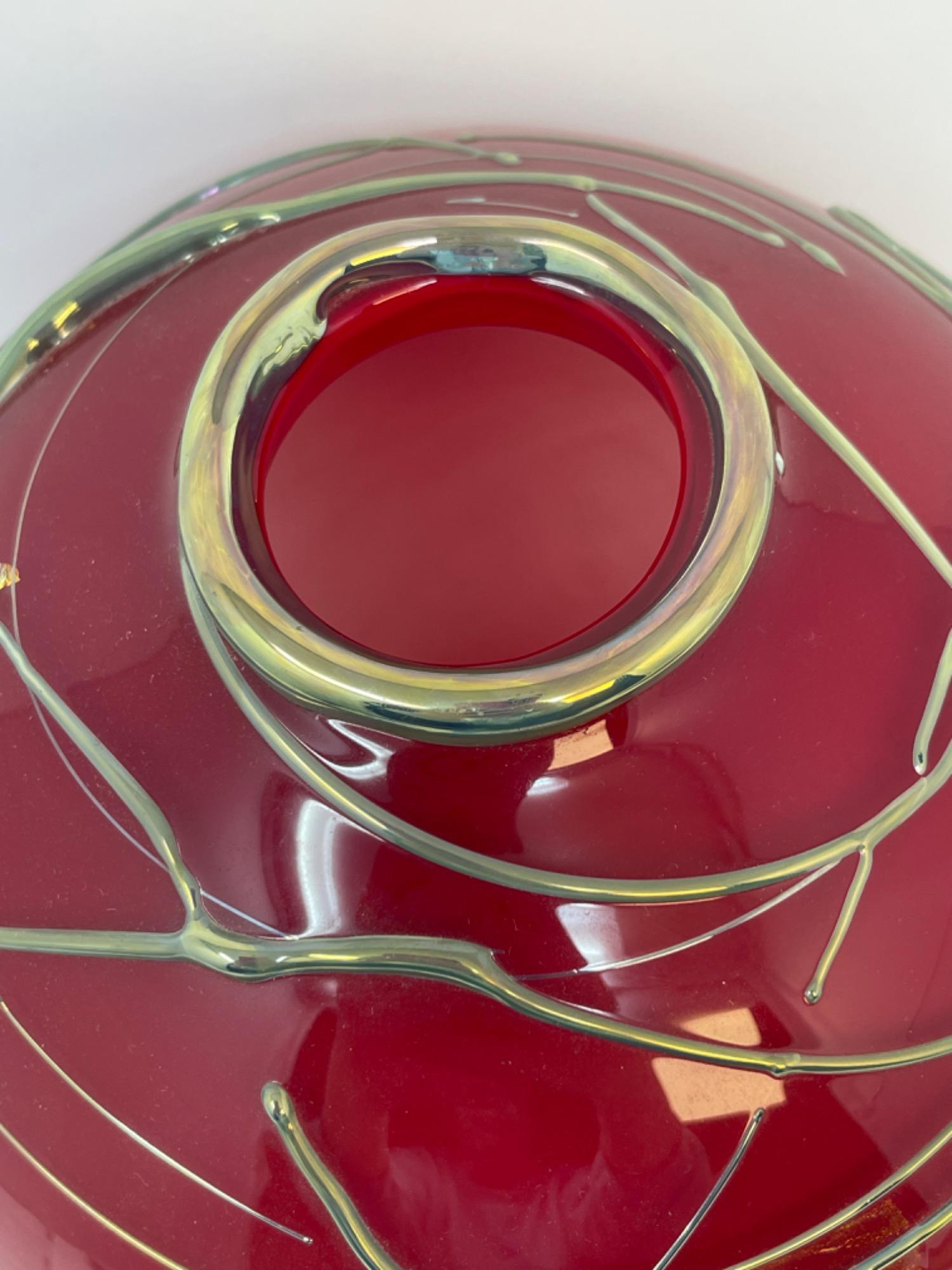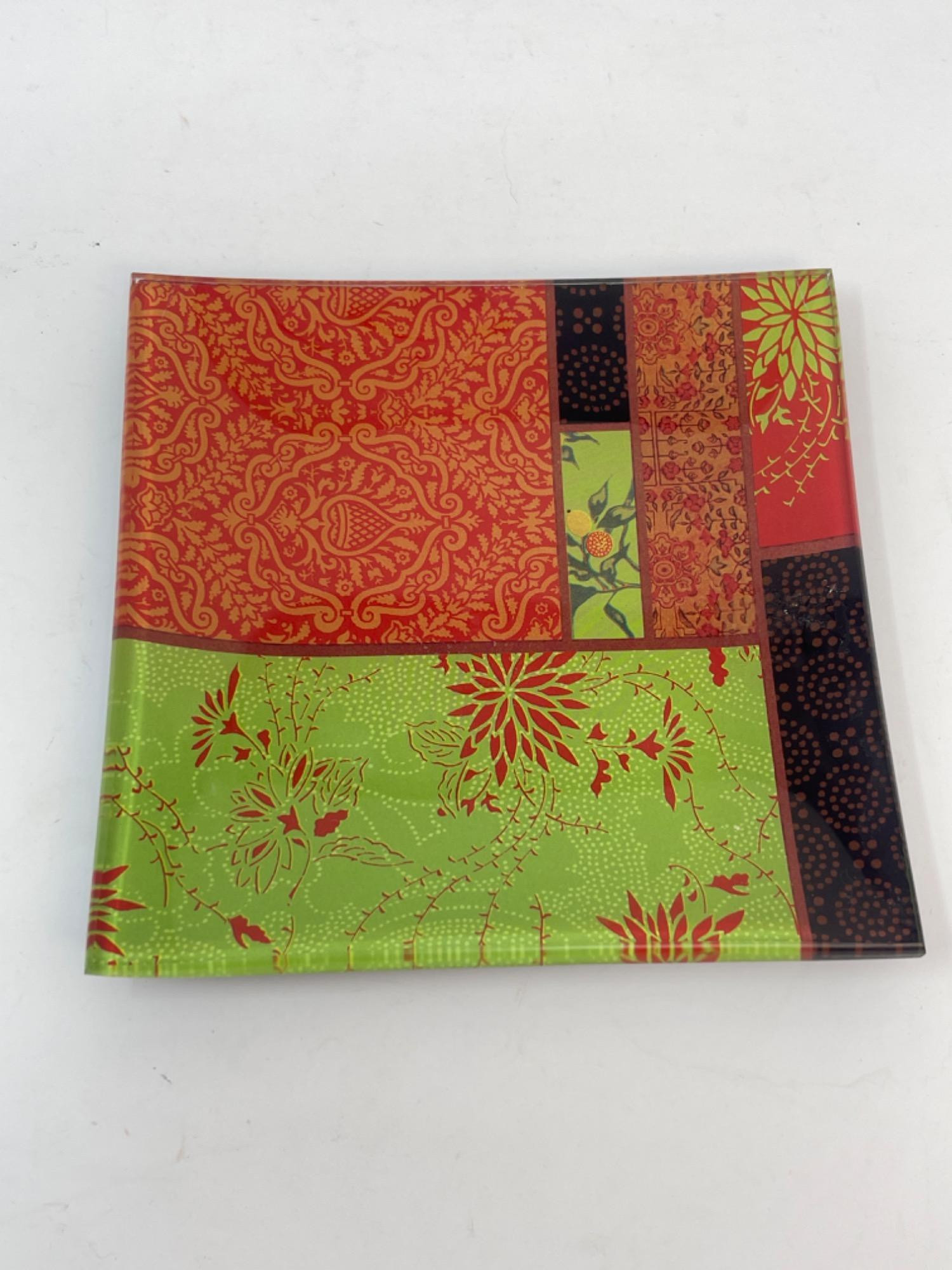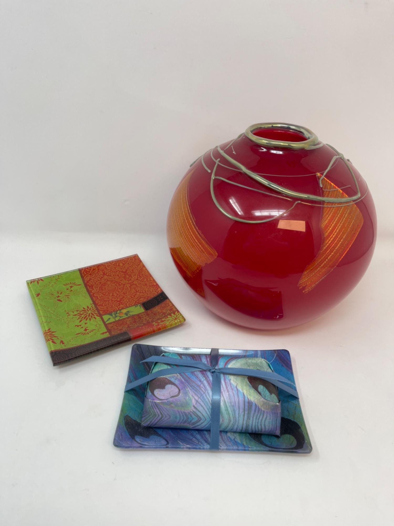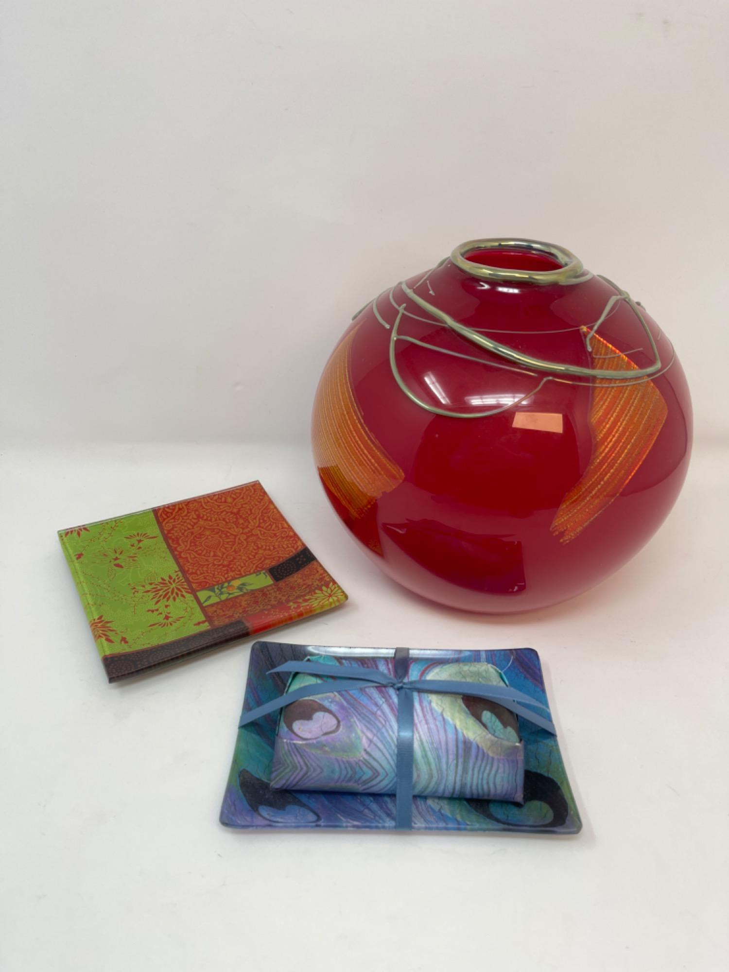 This vibrant decorative set includes a striking red art glass vase with intricate wrapped glass accents, a colorful fused glass tray, and a Tiffany-inspired soap dish set. The bold vase makes a stunning statement piece, while the decorative tray and soap dish add artistic charm to any space.