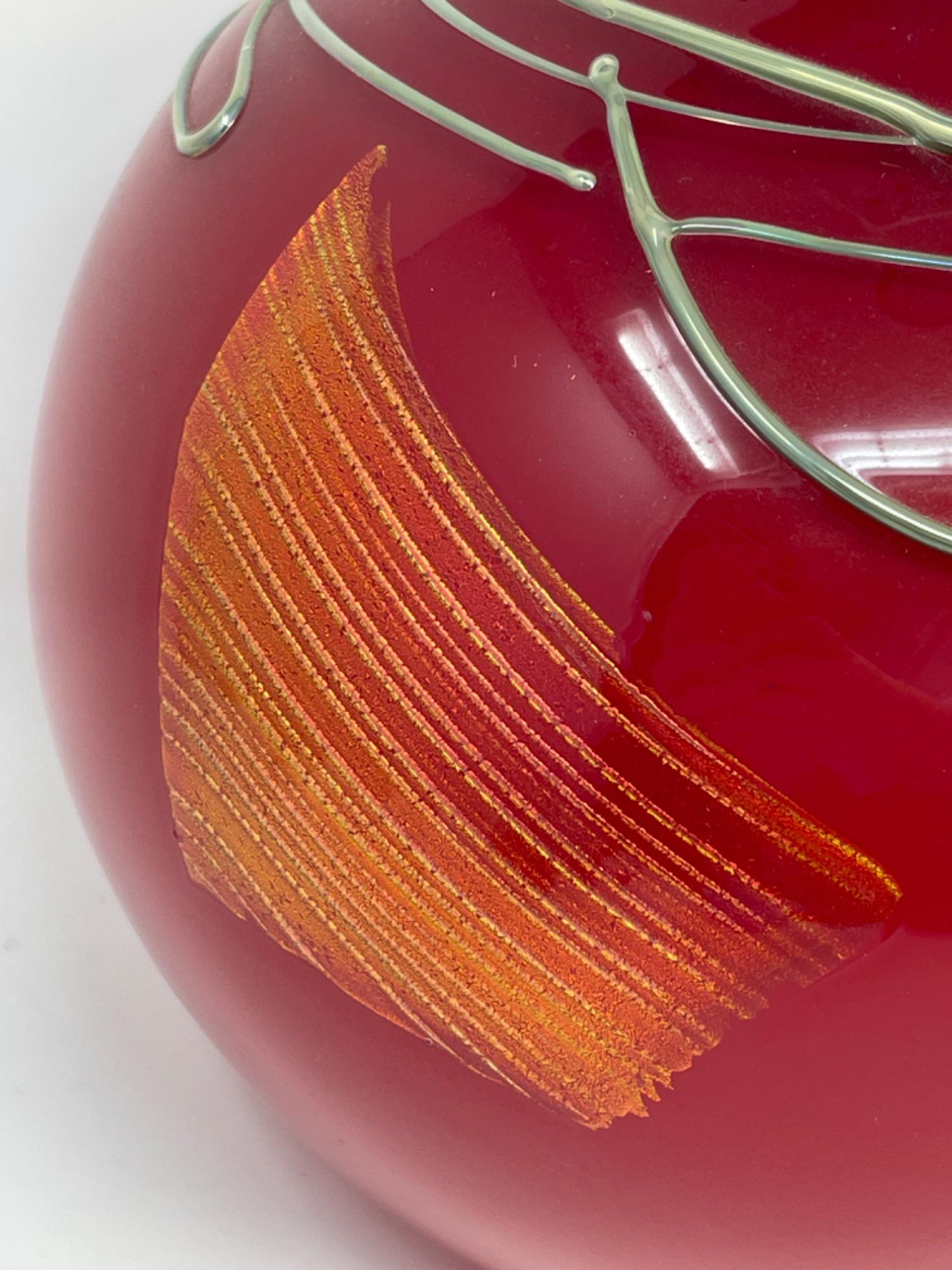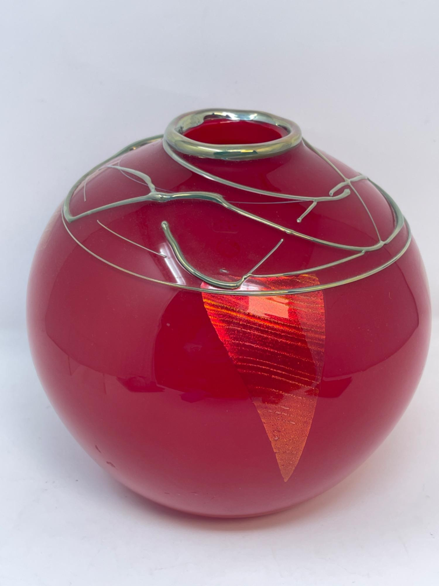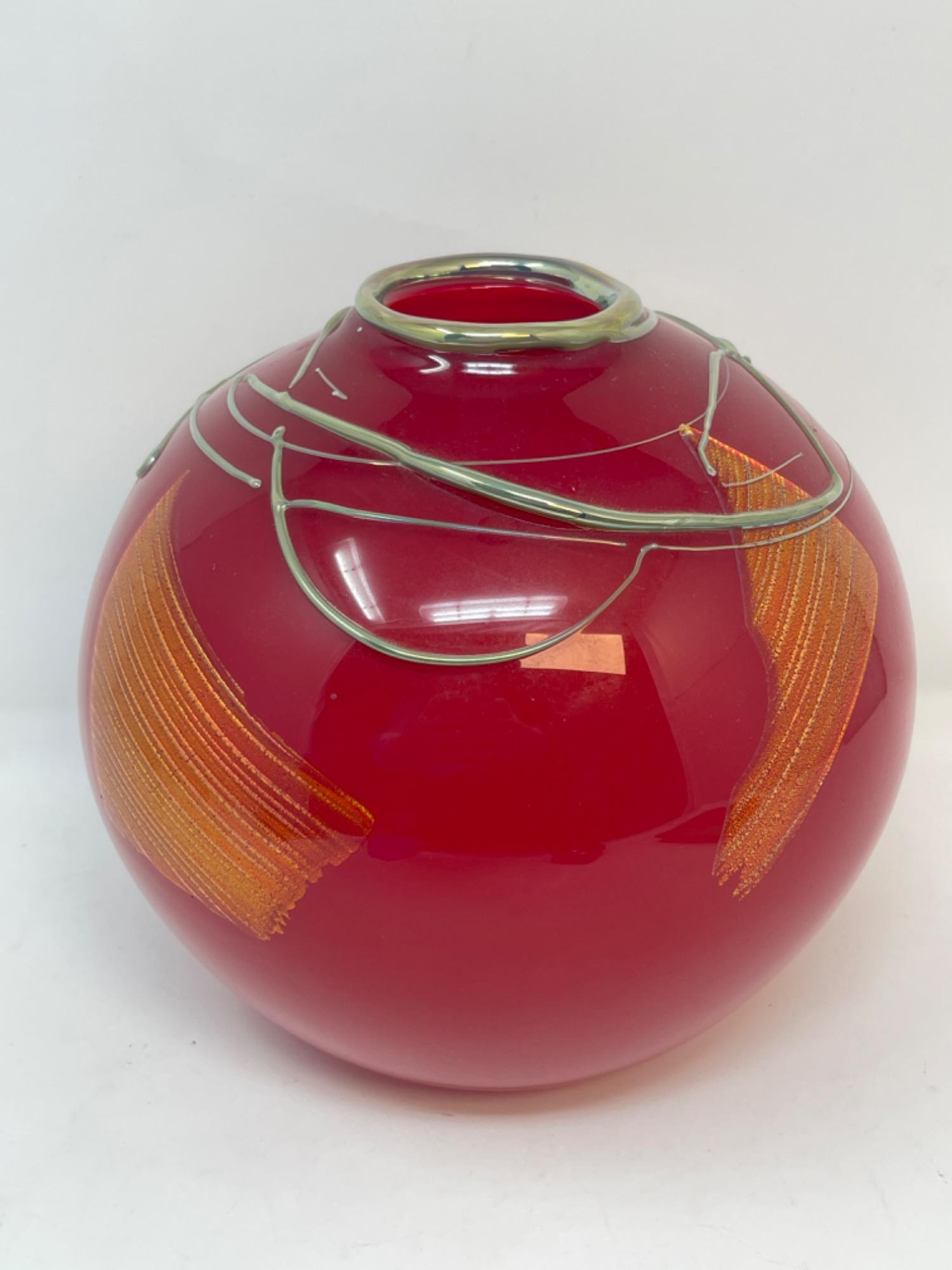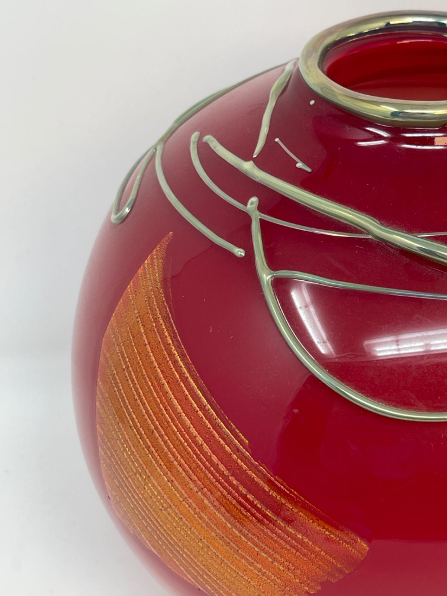 This vibrant decorative set includes a striking red art glass vase with intricate wrapped glass accents, a colorful fused glass tray, and a Tiffany-inspired soap dish set. The bold vase makes a stunning statement piece, while the decorative tray and soap dish add artistic charm to any space.