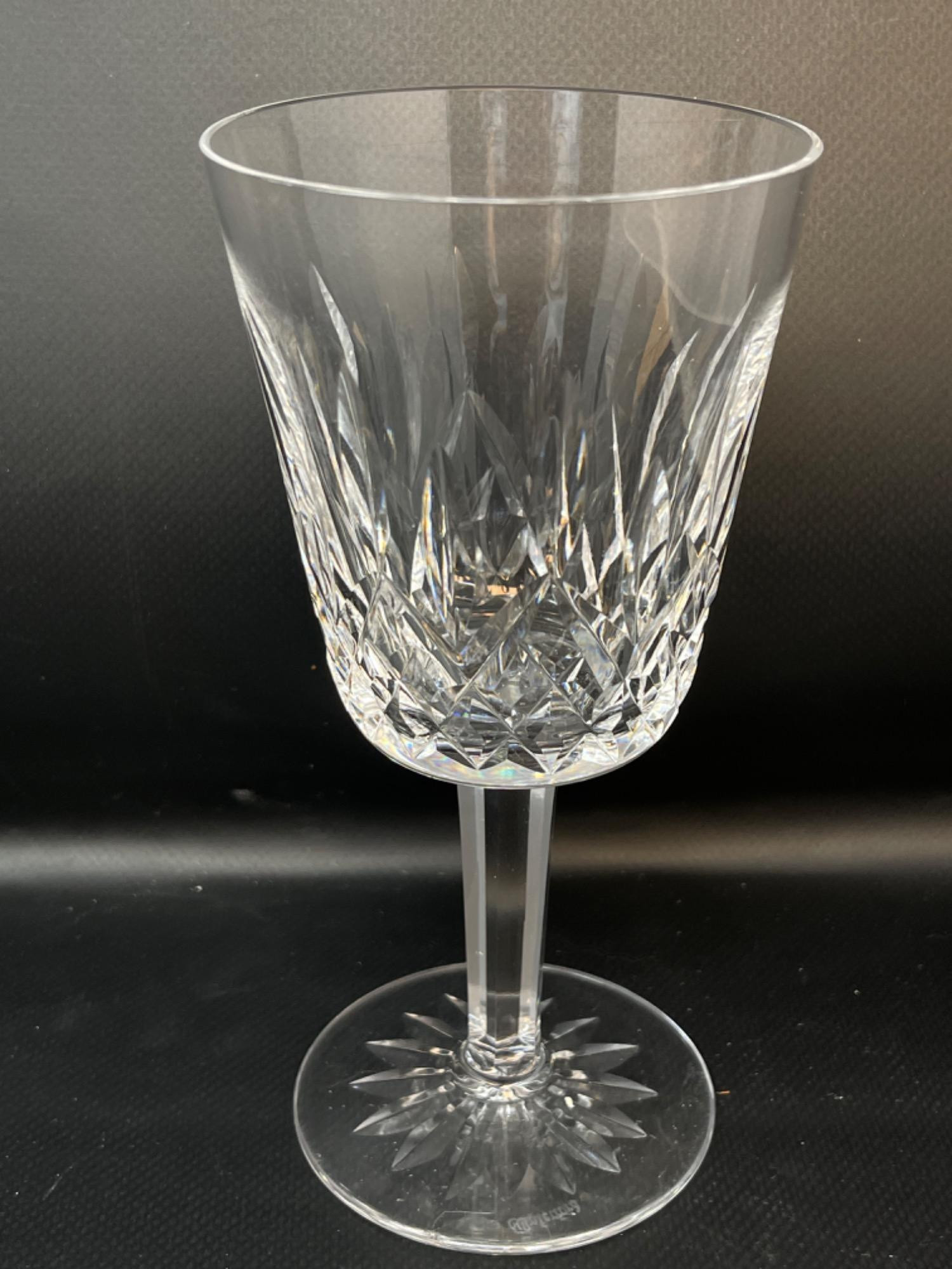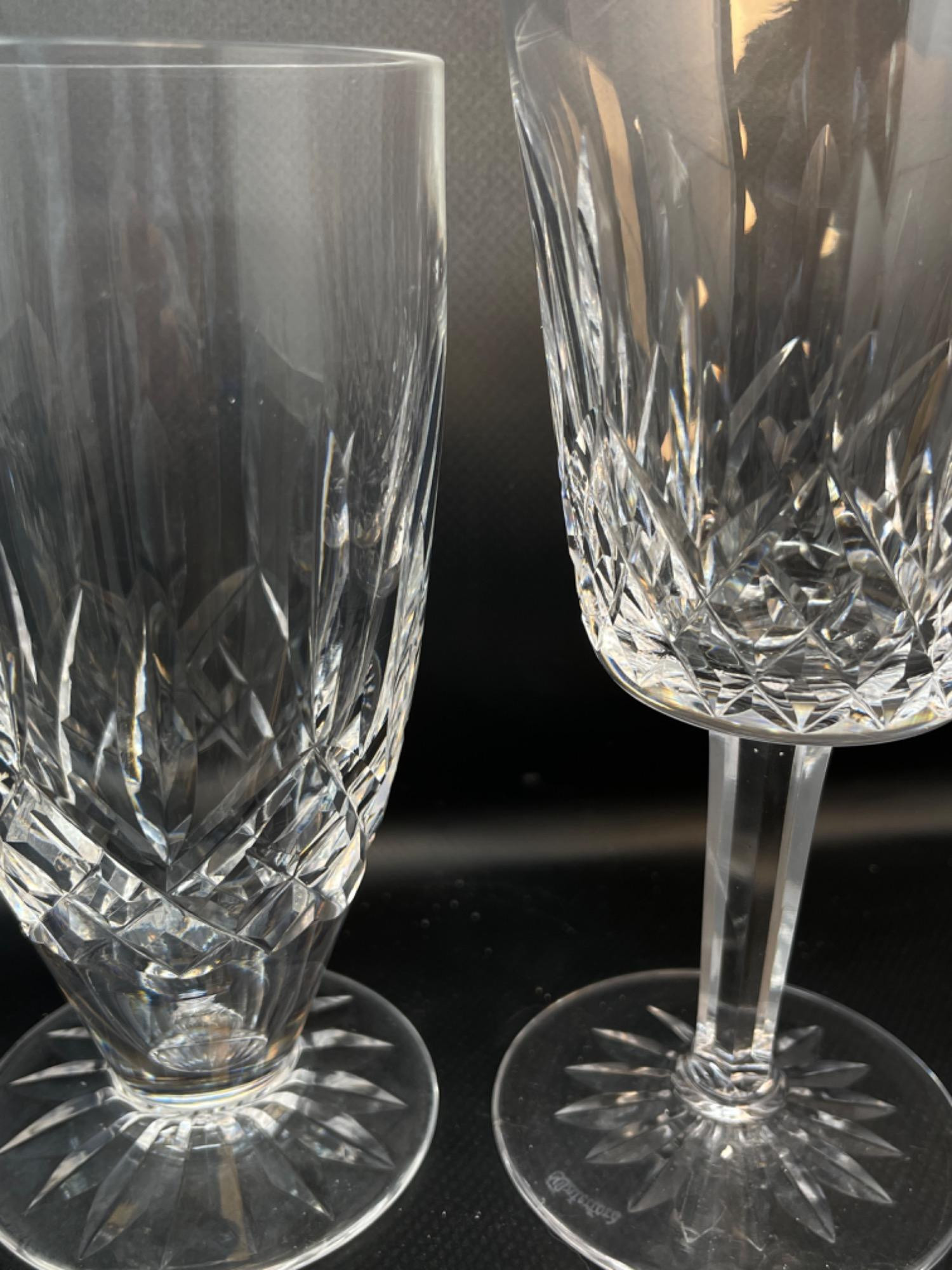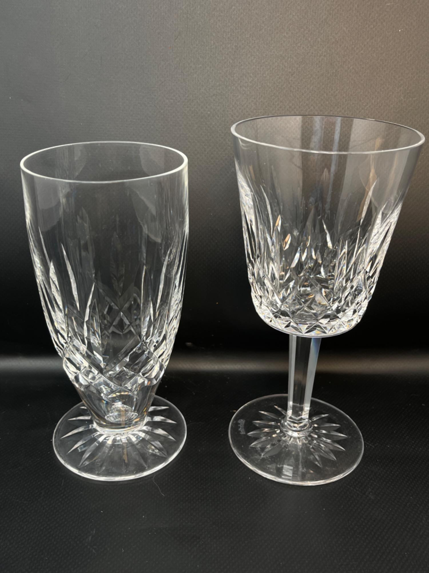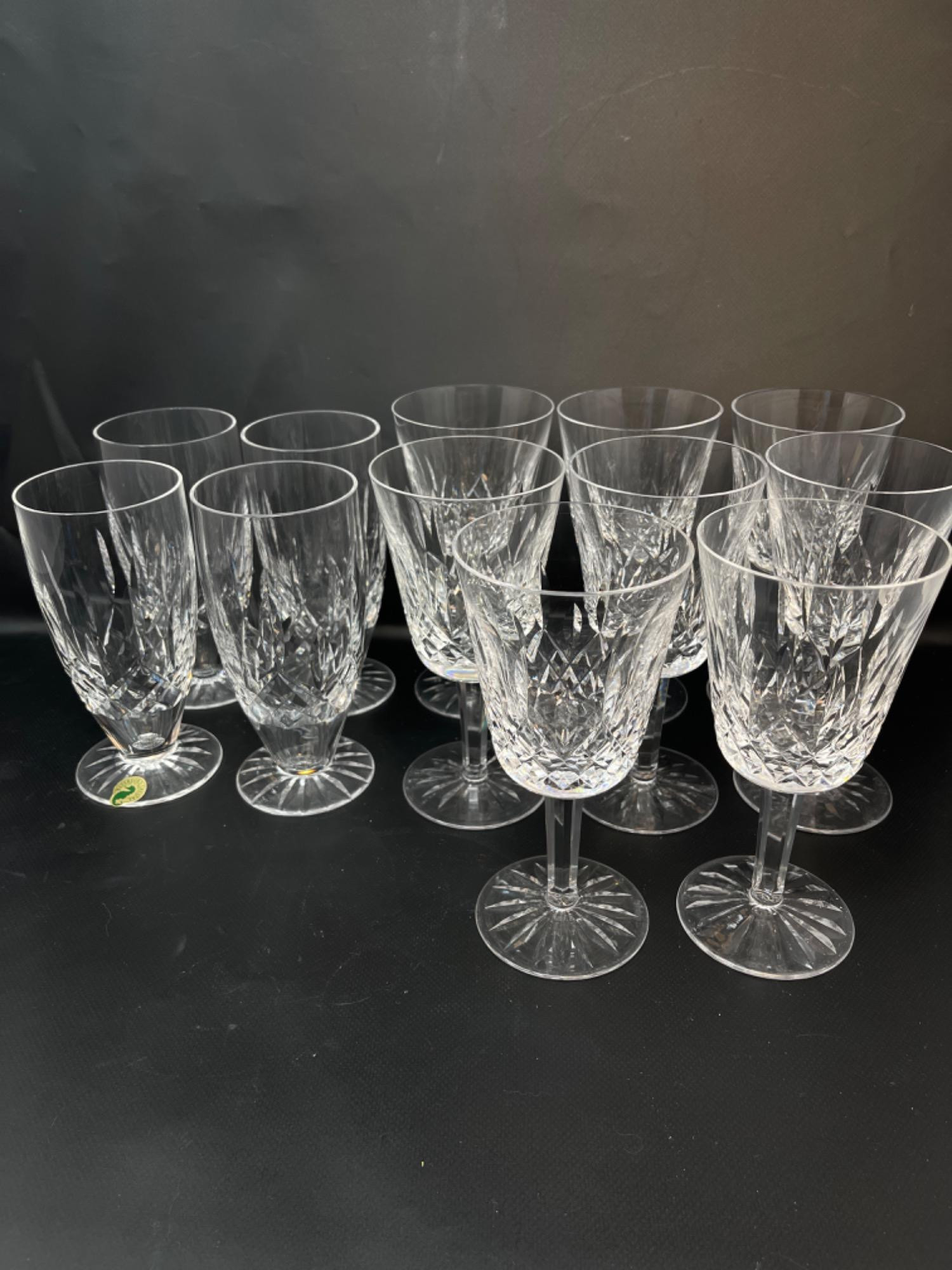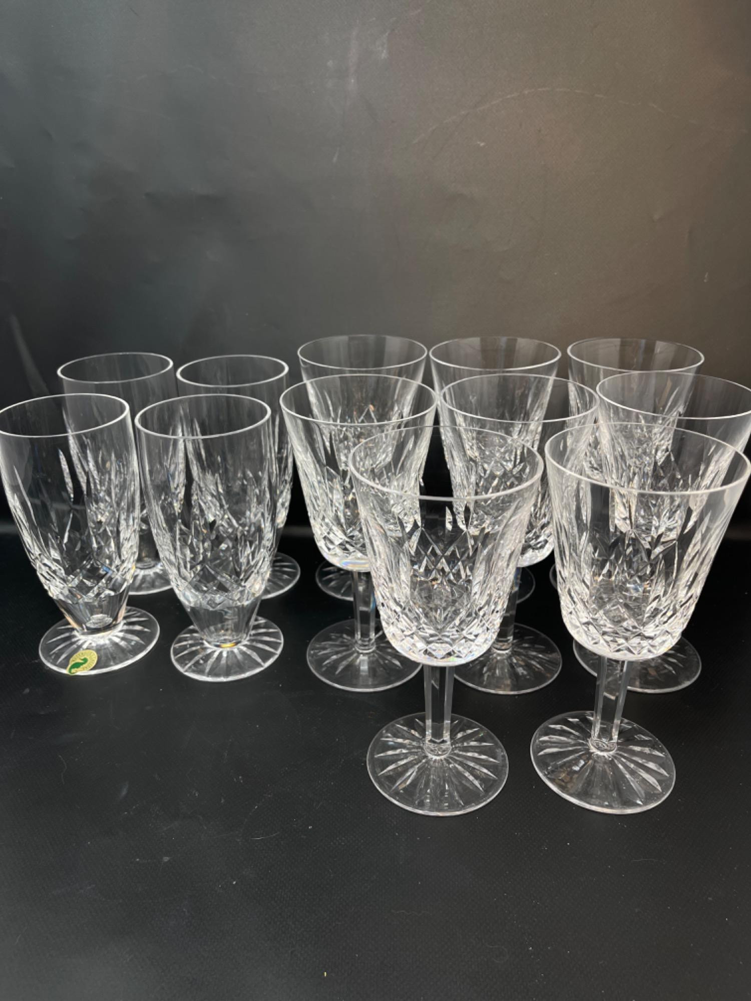 A refined collection of Waterford crystal stemware, featuring four Lismore iced tea glasses and eight claret wine goblets. The Lismore pattern is renowned for its intricate diamond and wedge cuts, exemplifying Waterford's commitment to quality and craftsmanship.