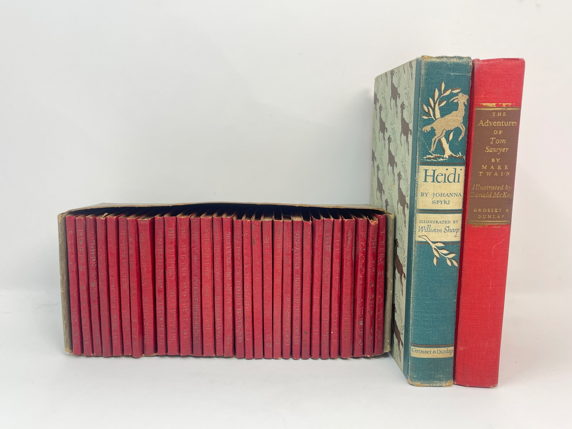 Condition: Good vintage condition with expected signs of wear. Some books show fading or foxing. Please refer to photos for details. Little Luxart Books: 4” H Heidi & Tom Sawyer: 8.25” H
