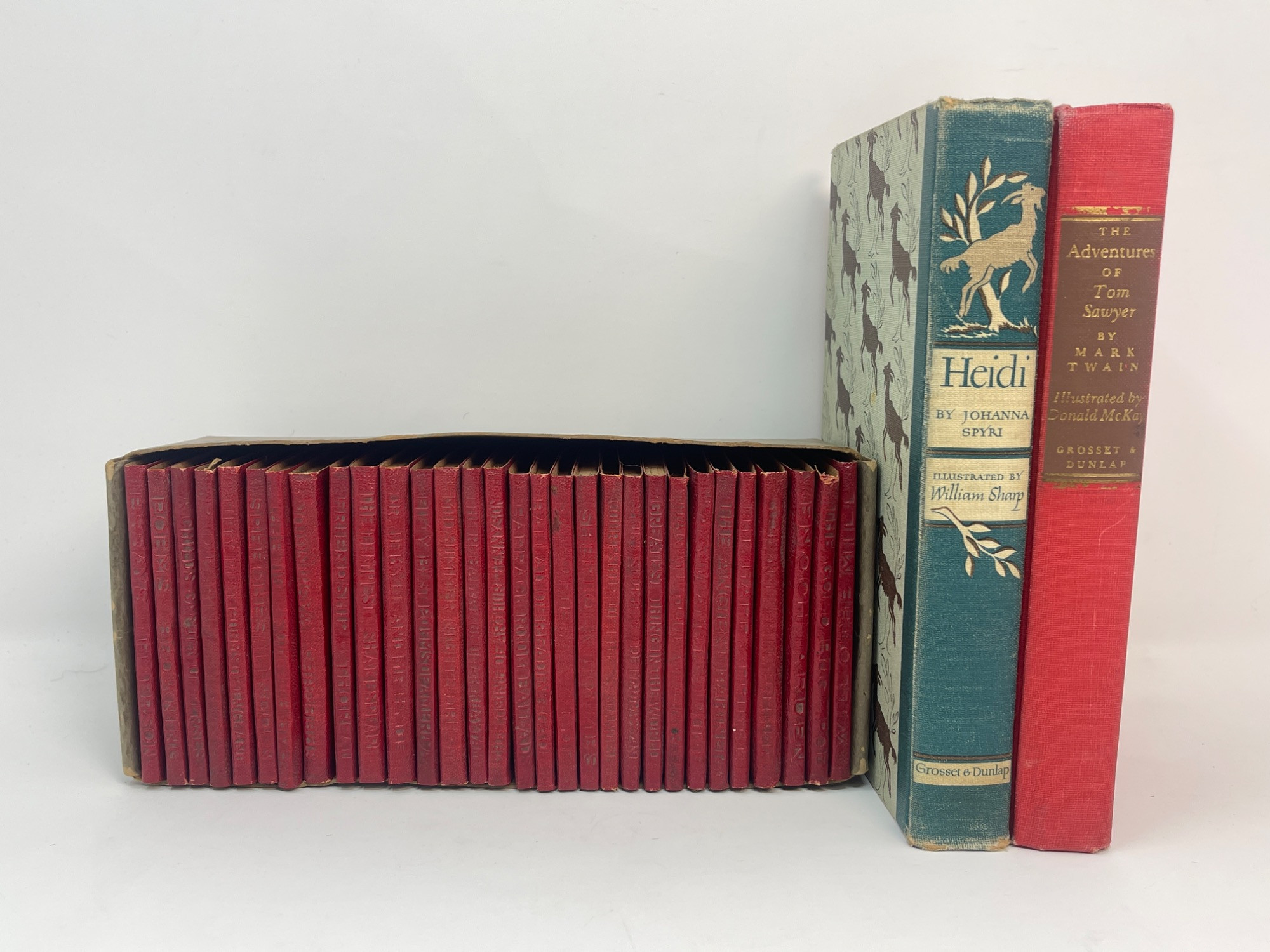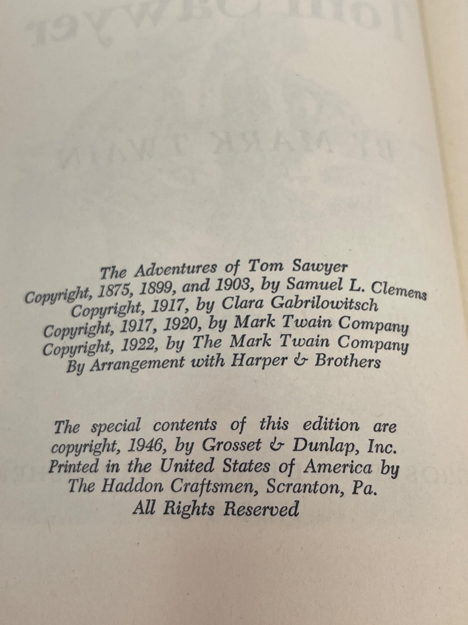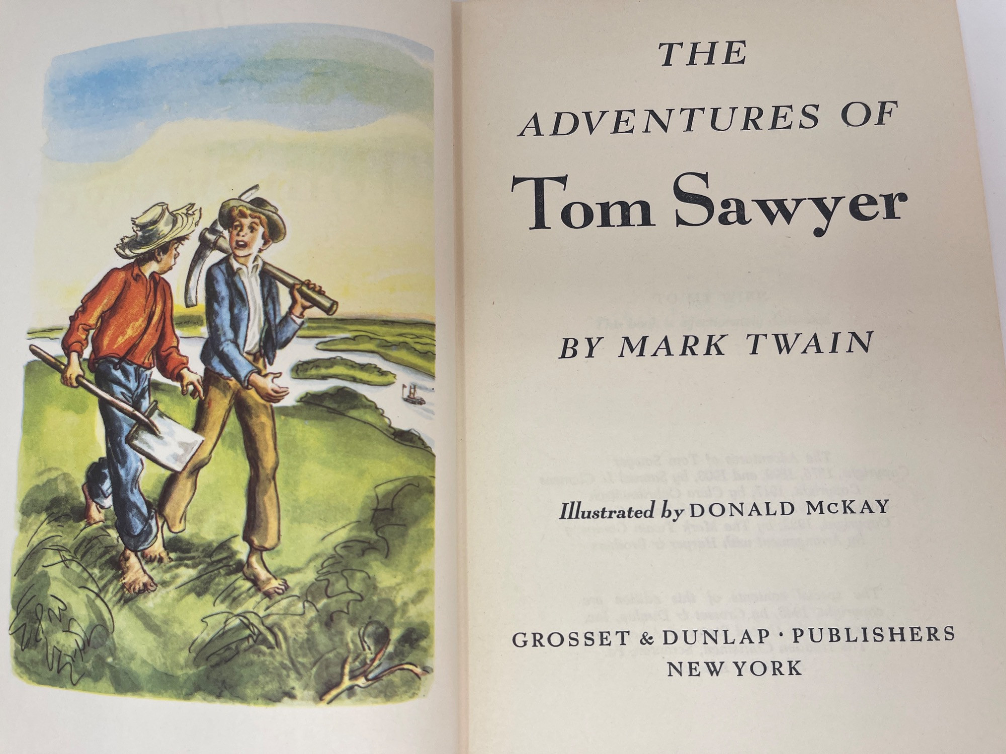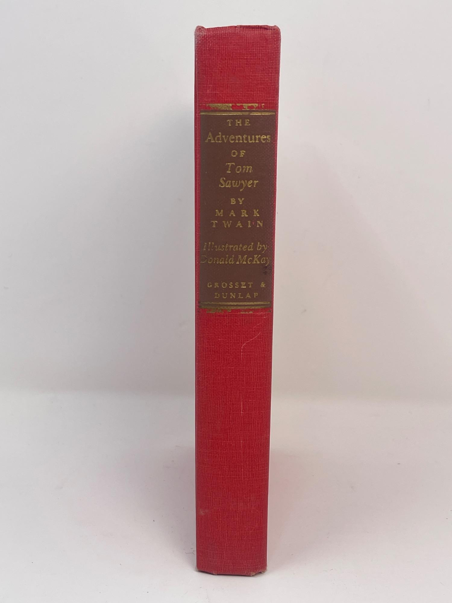 The Adventures of Tom Sawyer (Grosset & Dunlap, 1946): Illustrated by Donald McKay, this hardcover edition has a red cloth cover with gold lettering. Some signs of wear are present, but overall, it remains a well-preserved vintage copy.