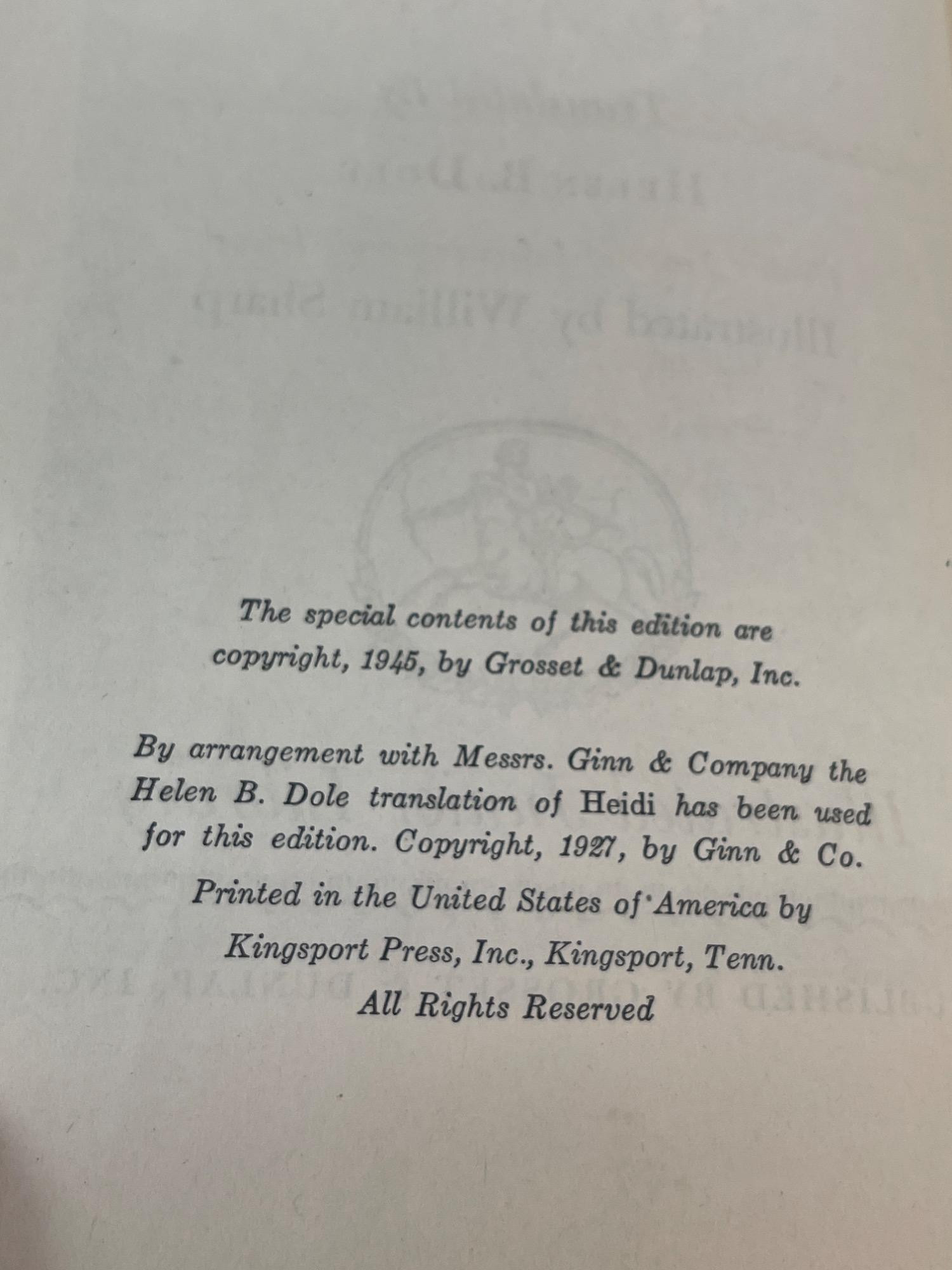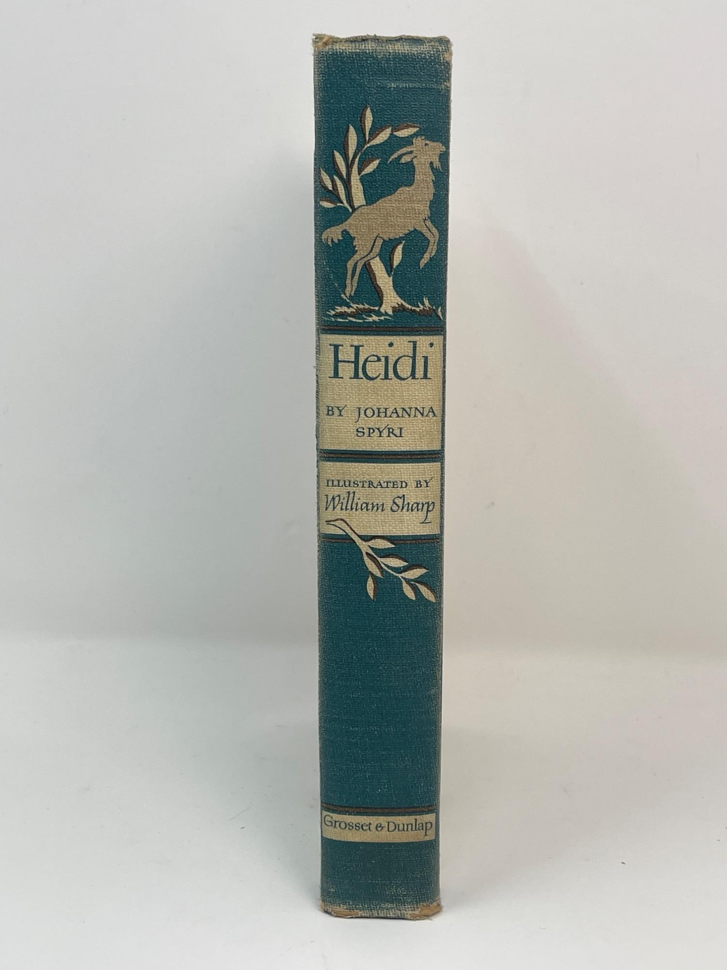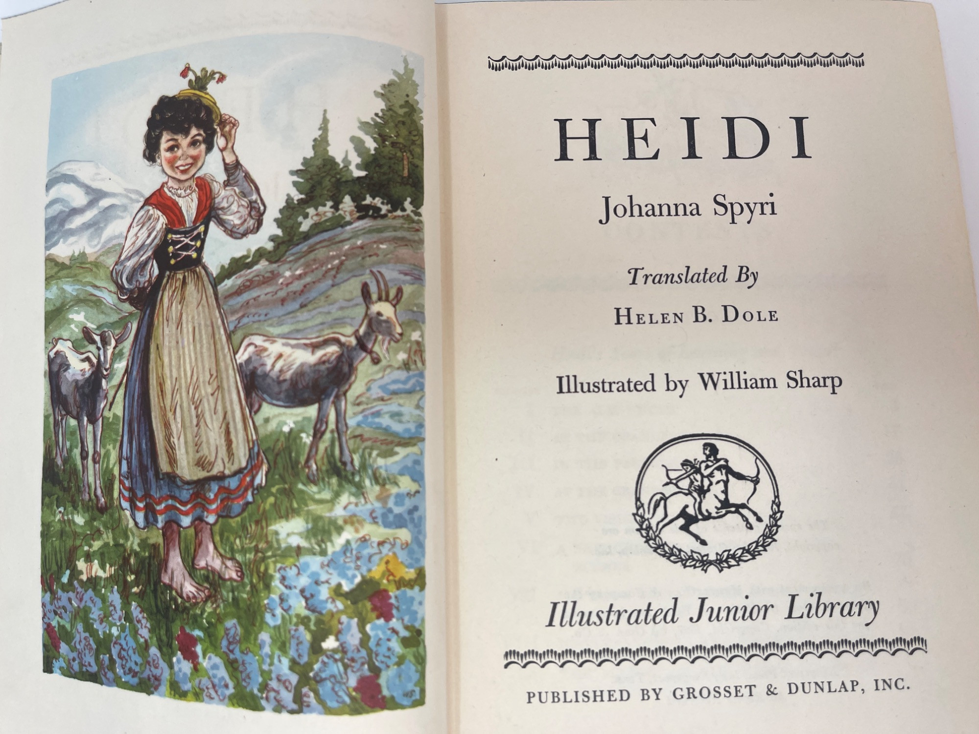 Heidi (Illustrated Junior Library, Grosset & Dunlap, 1945): Illustrated by William Sharp, this hardcover edition features a decorative cover. Some wear is visible, particularly on the spine and edges.