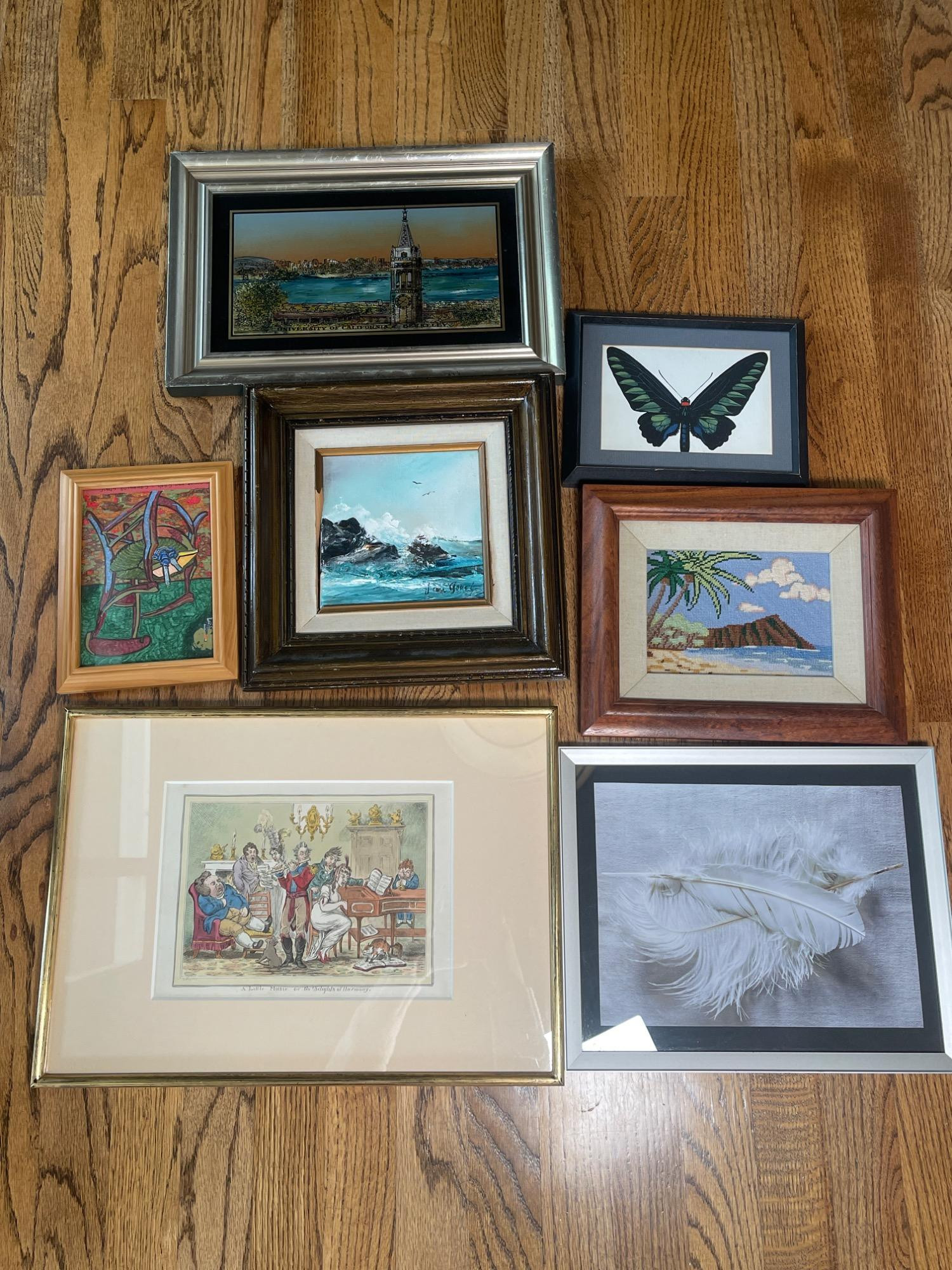 A diverse collection of framed artwork, including original paintings, prints, and a Hawaiian-themed stitching art piece. This set features a mix of styles and subjects, ranging from landscapes and abstract designs to nature and historical prints. The variety makes this an excellent selection for collectors, decorators, or those looking to refresh their wall art.