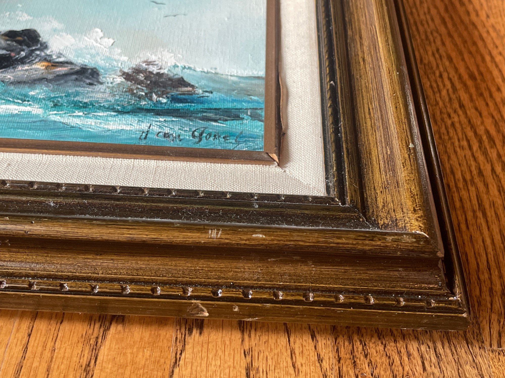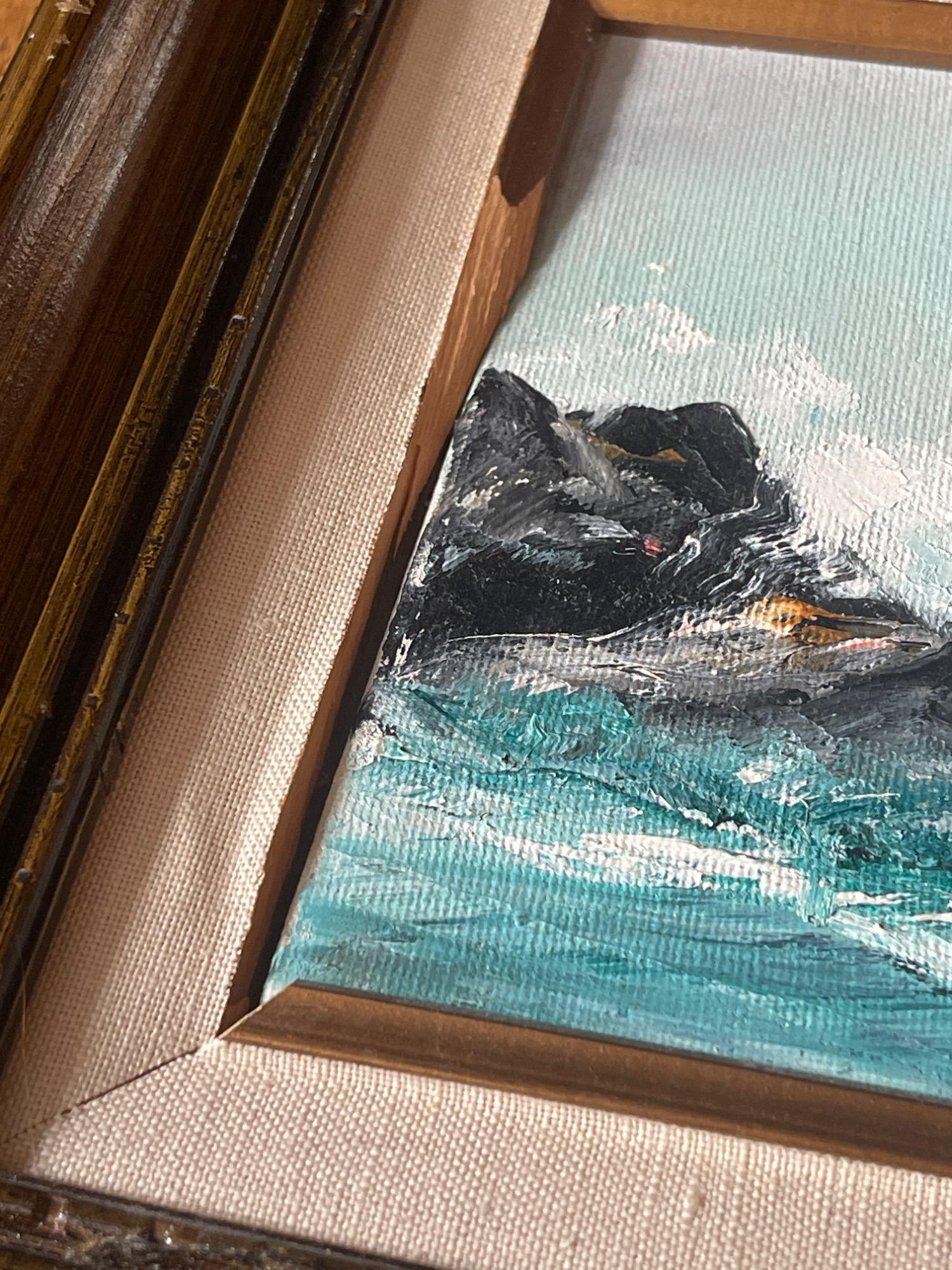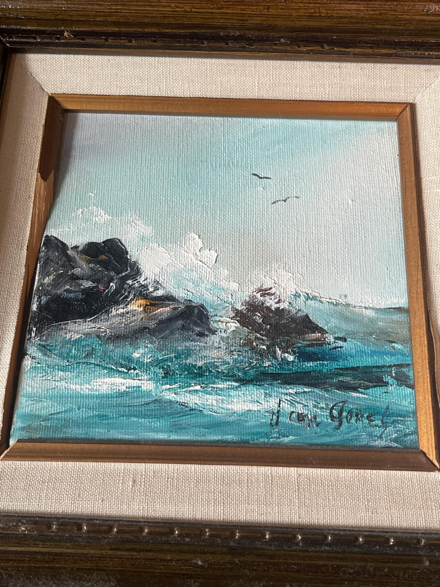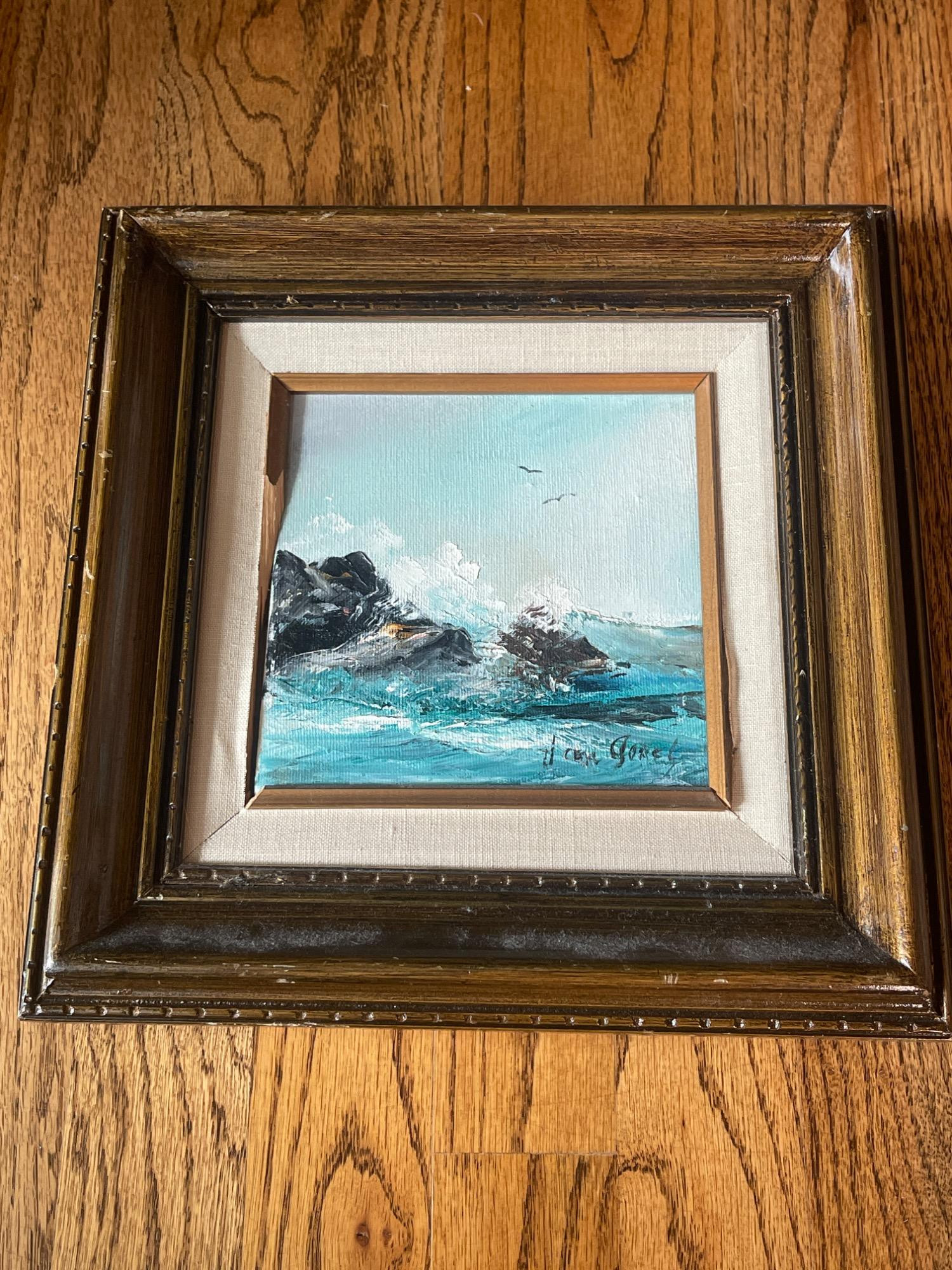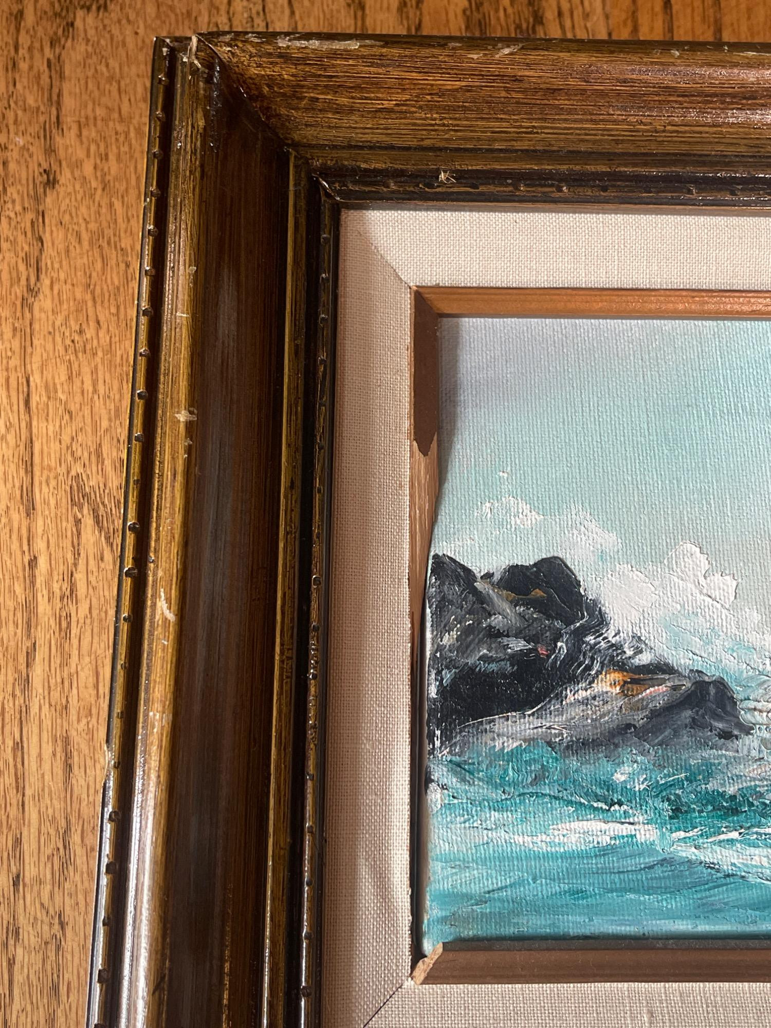 - The small seascape painting has significant breakage to its frame and will require reframing.