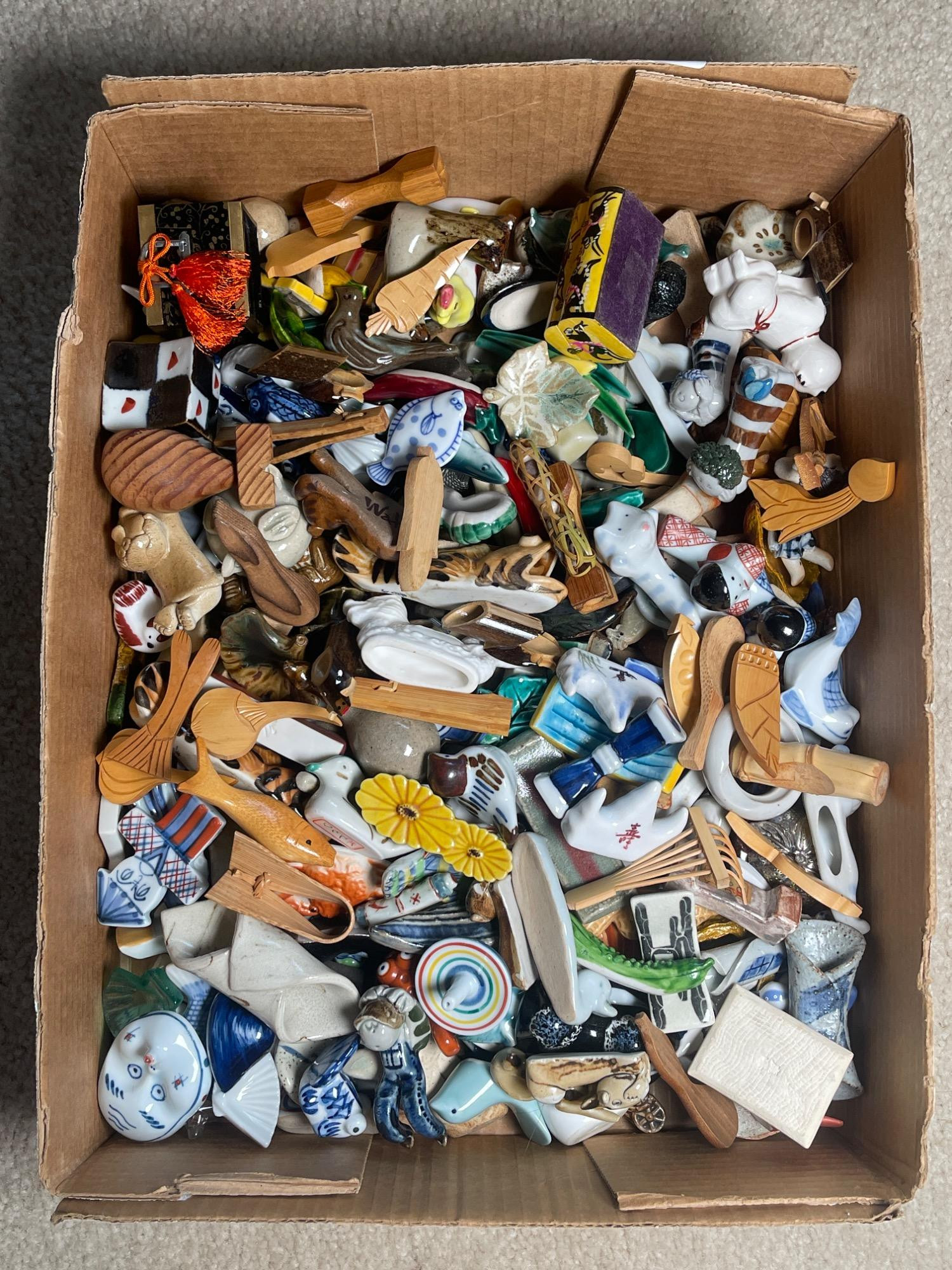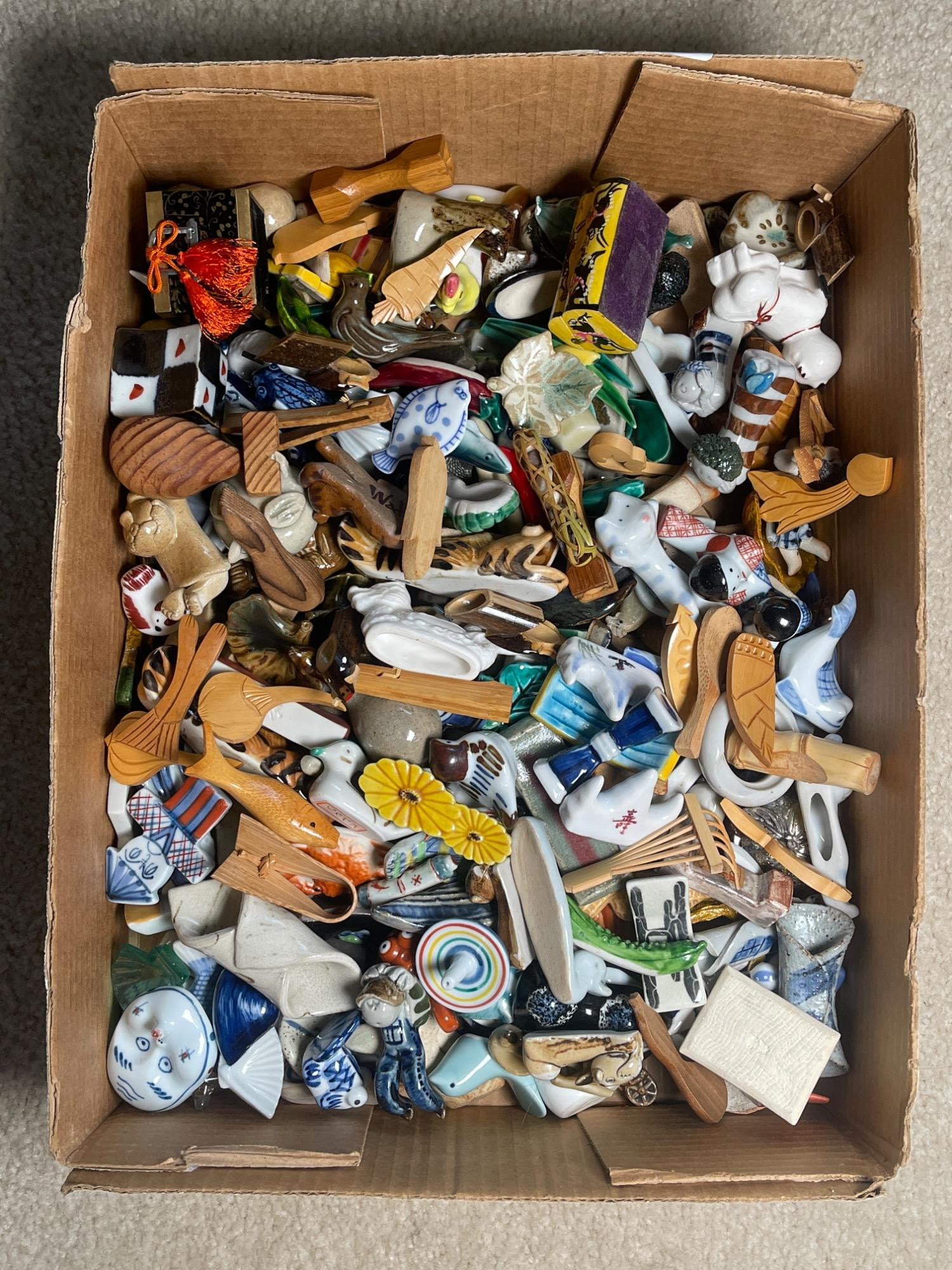 This collection features a large assortment of Japanese hashioki (chopstick rests), primarily crafted from porcelain. Many of the porcelain pieces are signed or stamped, indicating artisan craftsmanship. The designs range from traditional fish and animal motifs to contemporary artistic styles. Additionally, the collection includes various small wooden objects, some of which may also function as chopstick rests, while others appear to be decorative or functional miniatures.