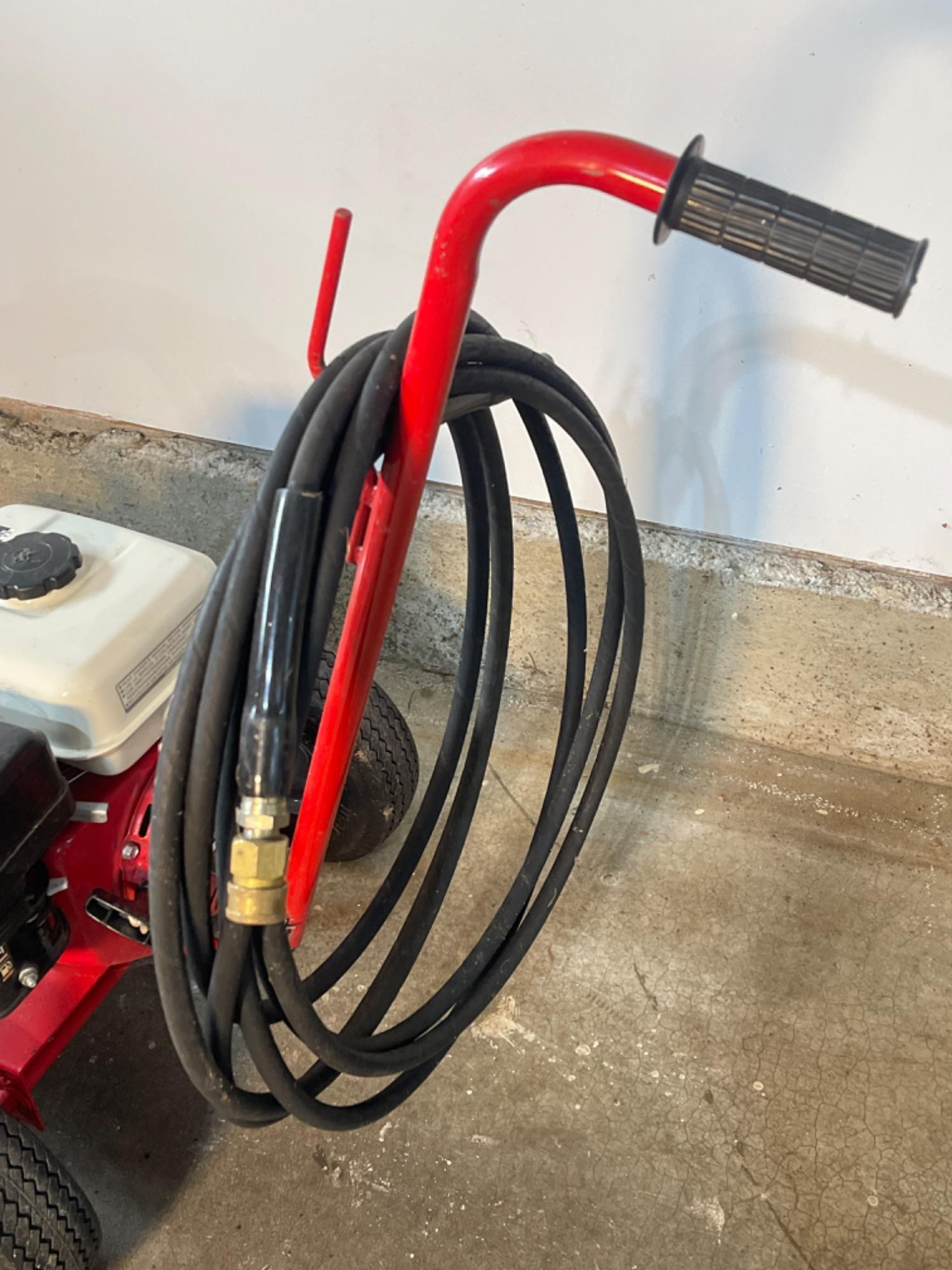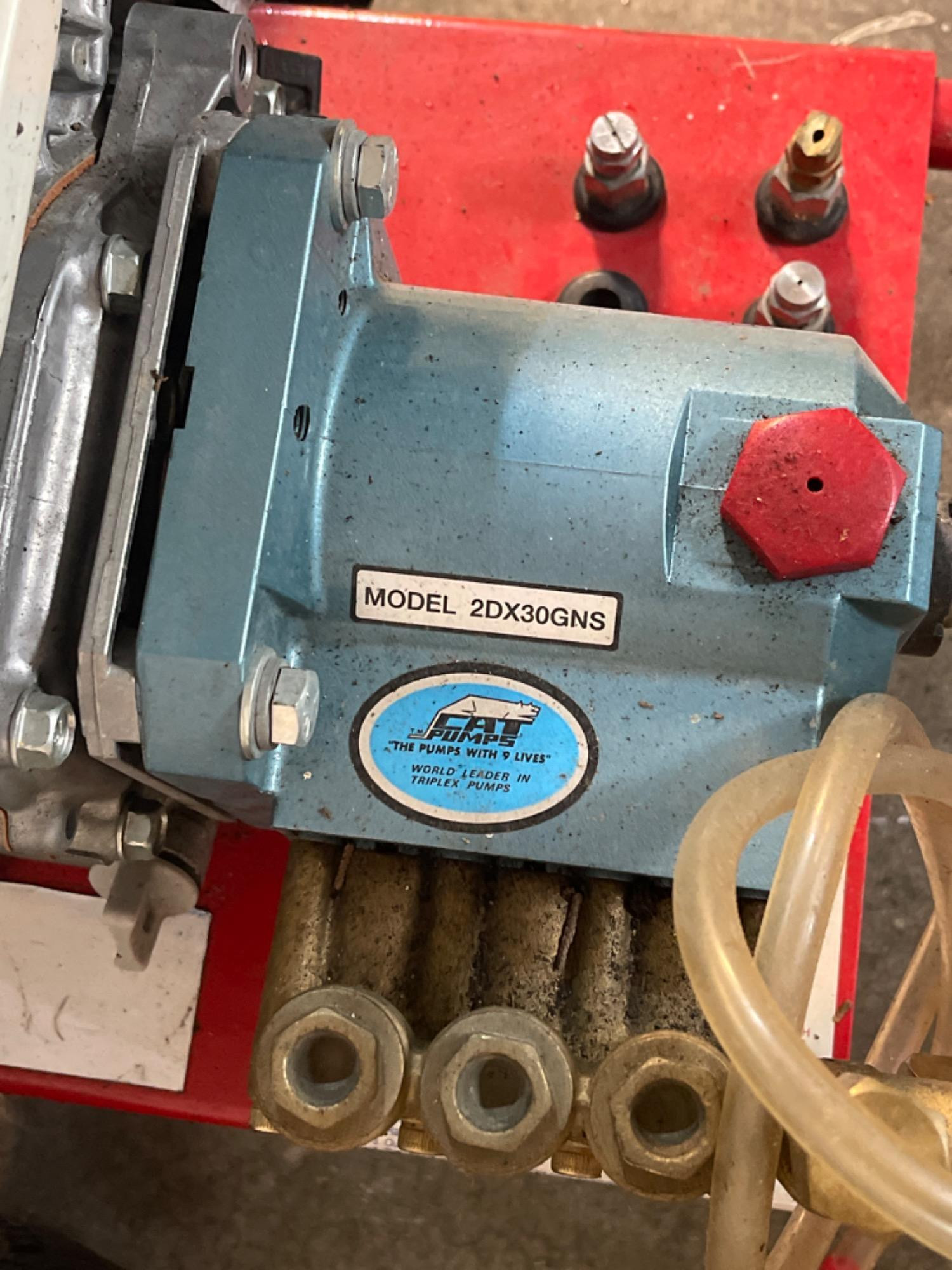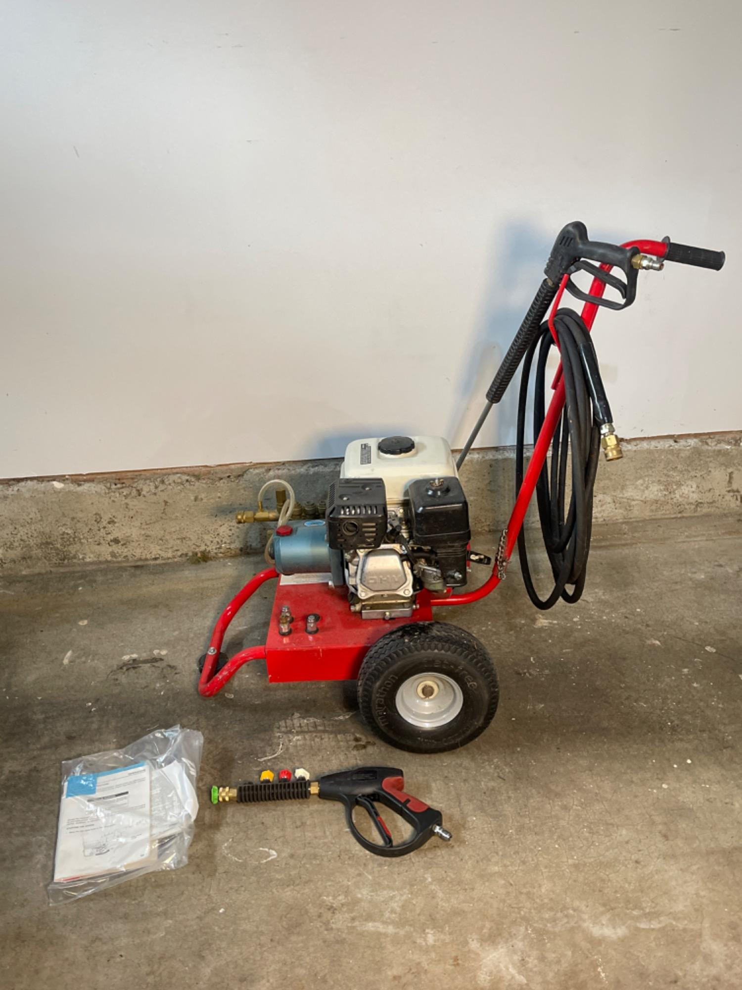 This heavy-duty gas-powered pressure washer is equipped with a reliable Honda GX160 5.5 HP engine and a CAT Pumps 2DX30GNS triplex pump, known for its durability and high performance. Designed for tackling tough cleaning tasks, it comes mounted on a sturdy red steel frame with large pneumatic tires for easy maneuverability. The washer includes a spray gun with multiple nozzles for versatile cleaning applications.