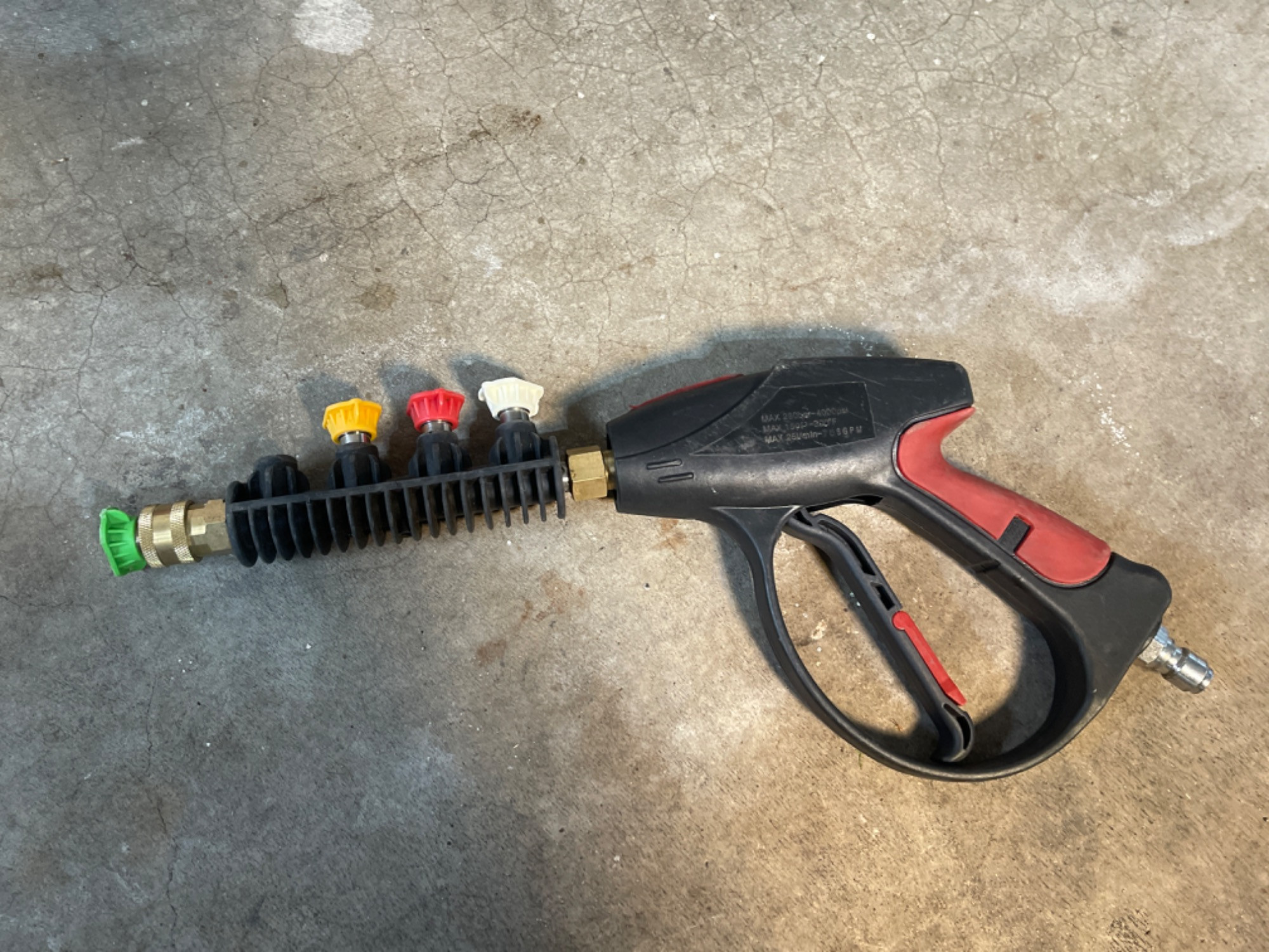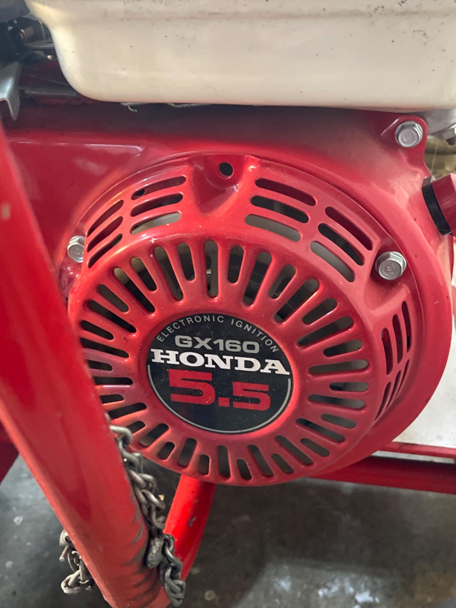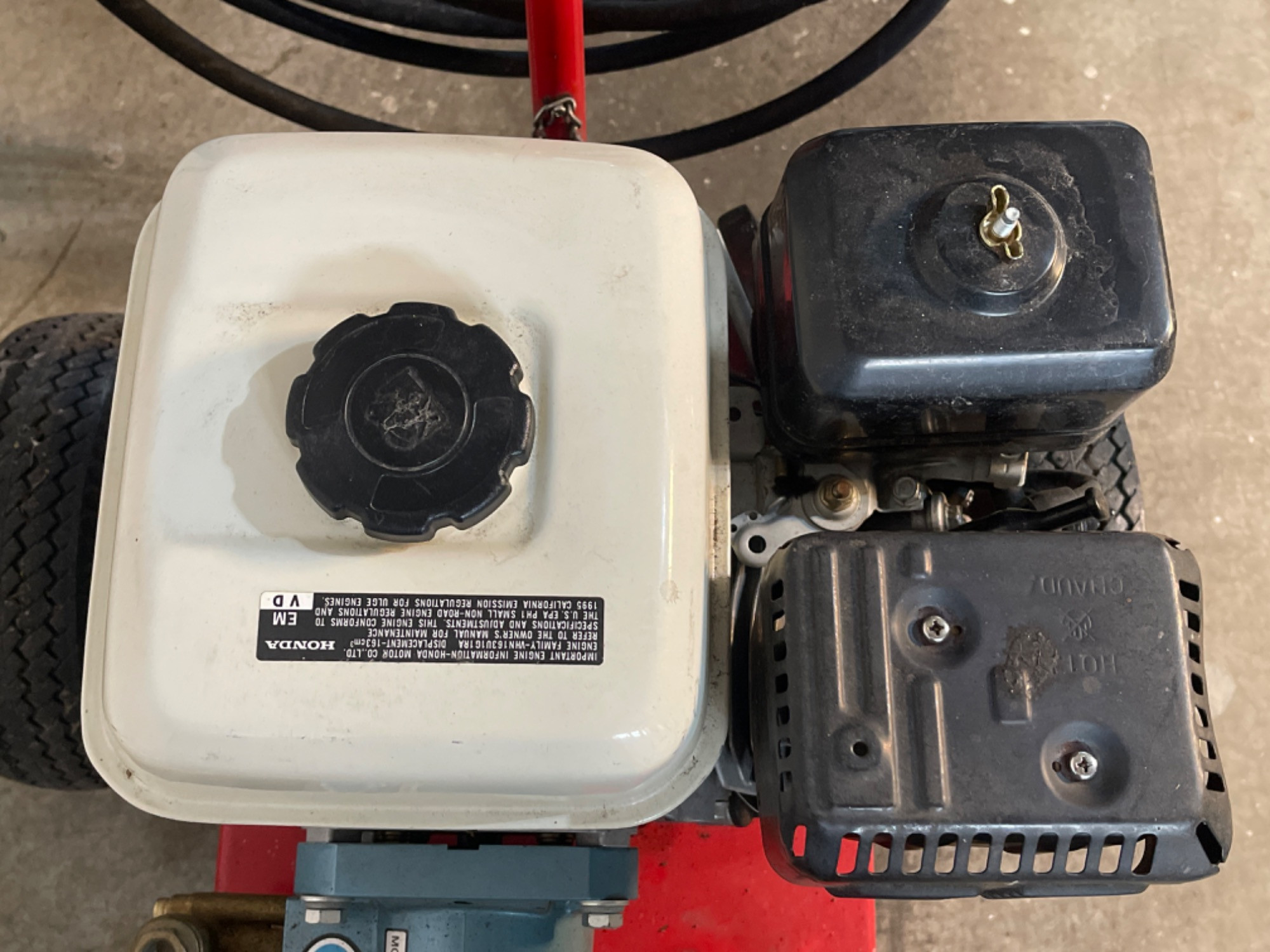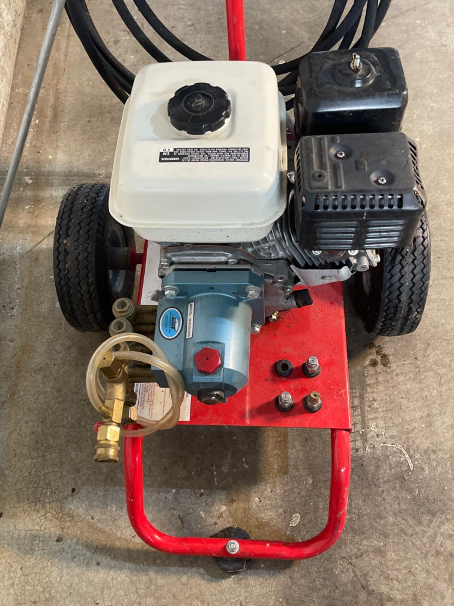 This heavy-duty gas-powered pressure washer is equipped with a reliable Honda GX160 5.5 HP engine and a CAT Pumps 2DX30GNS triplex pump, known for its durability and high performance. Designed for tackling tough cleaning tasks, it comes mounted on a sturdy red steel frame with large pneumatic tires for easy maneuverability. The washer includes a spray gun with multiple nozzles for versatile cleaning applications.