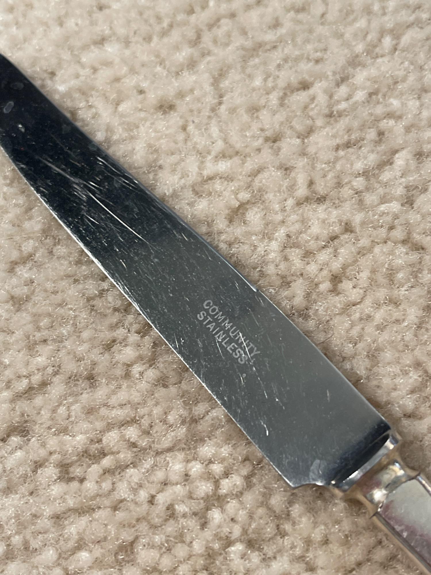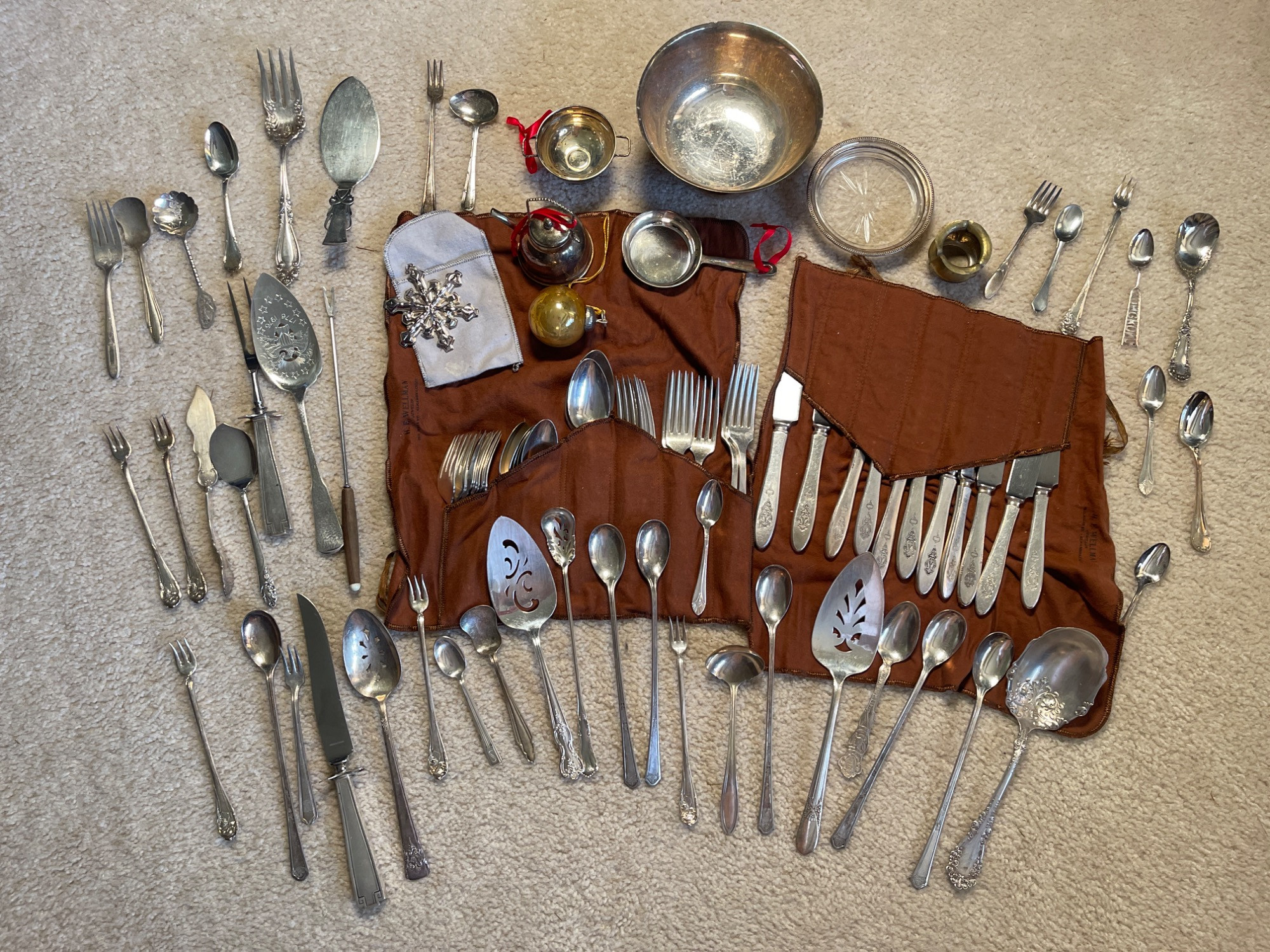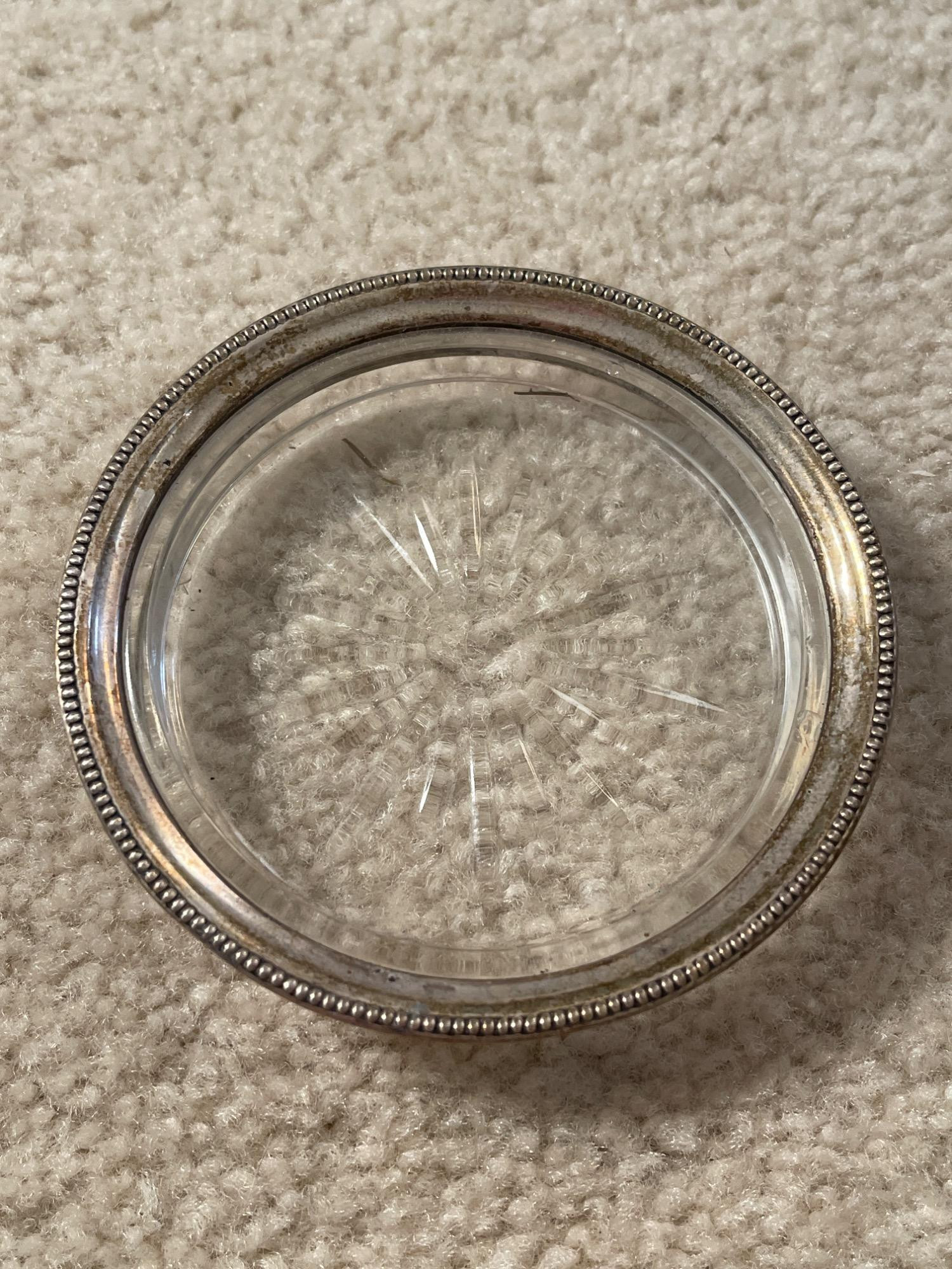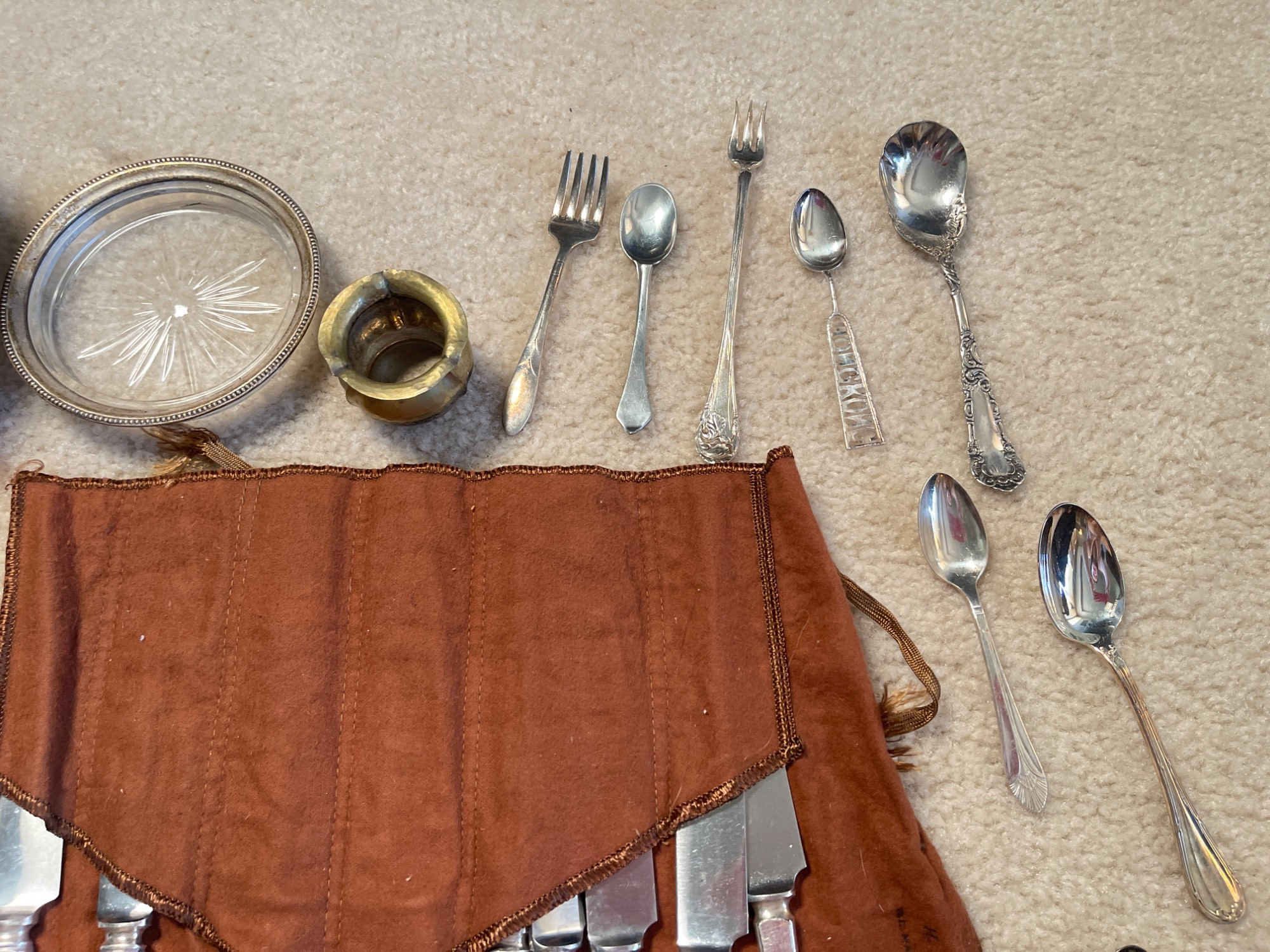 Assorted Vintage Silverware and Serveware Silver-rimmed coaster is sterling silver. Condition: All have some tarnishing, but are in good used condition. Measurements: Smallest: 4" L Largest: 10.5" L