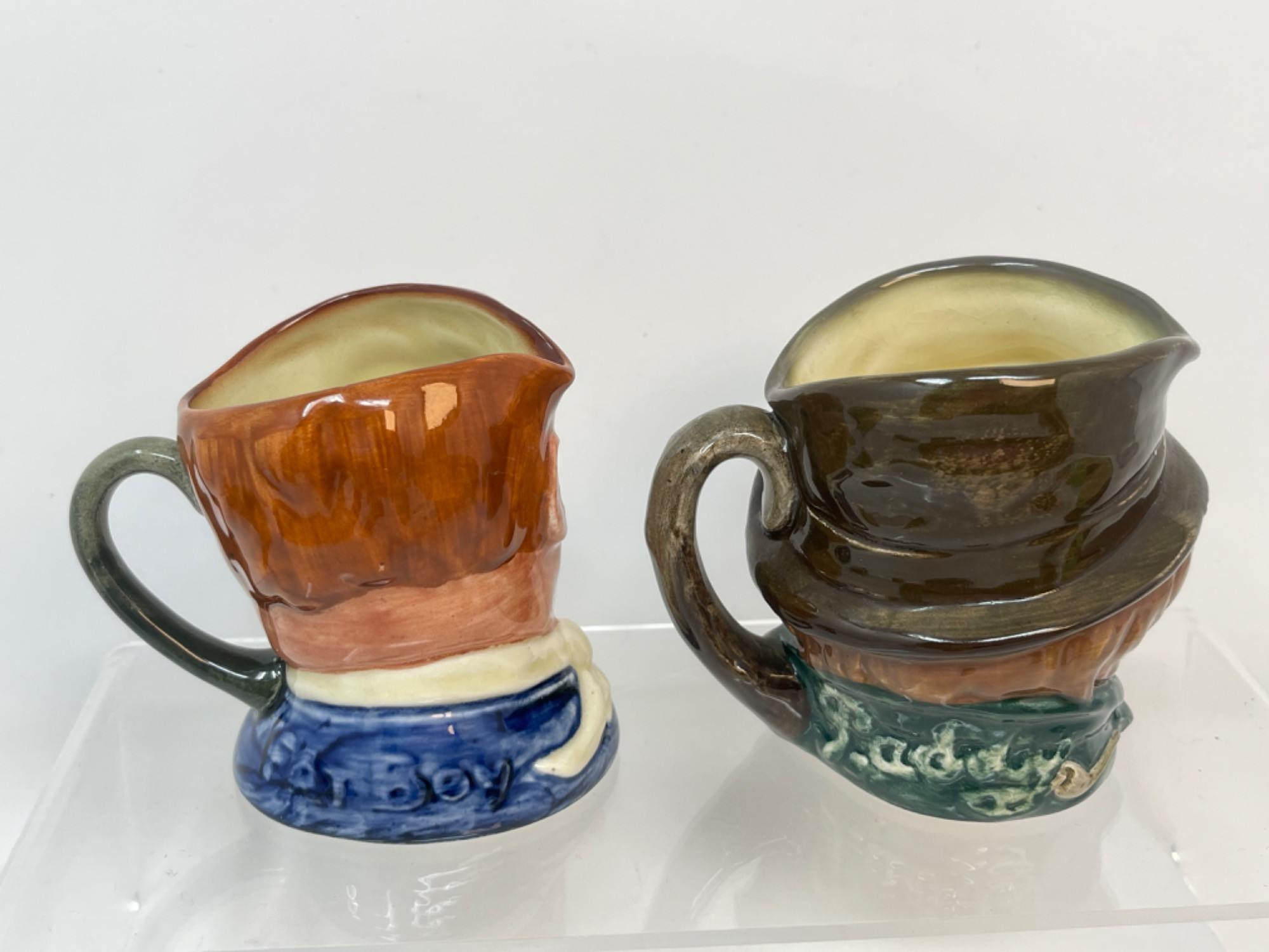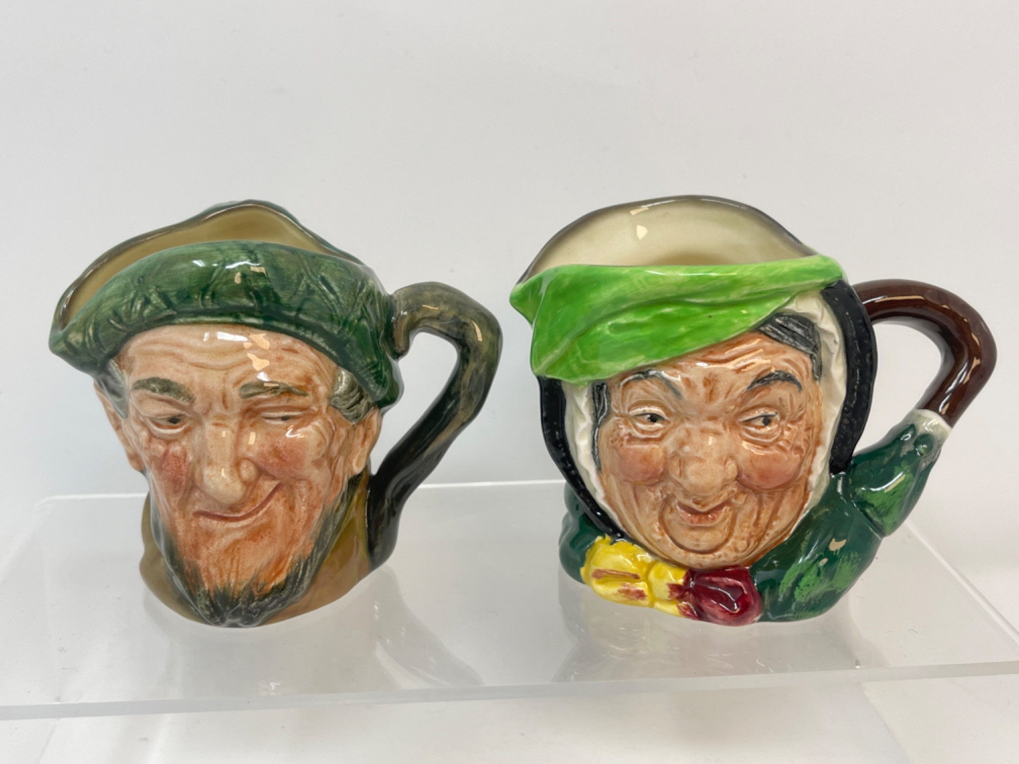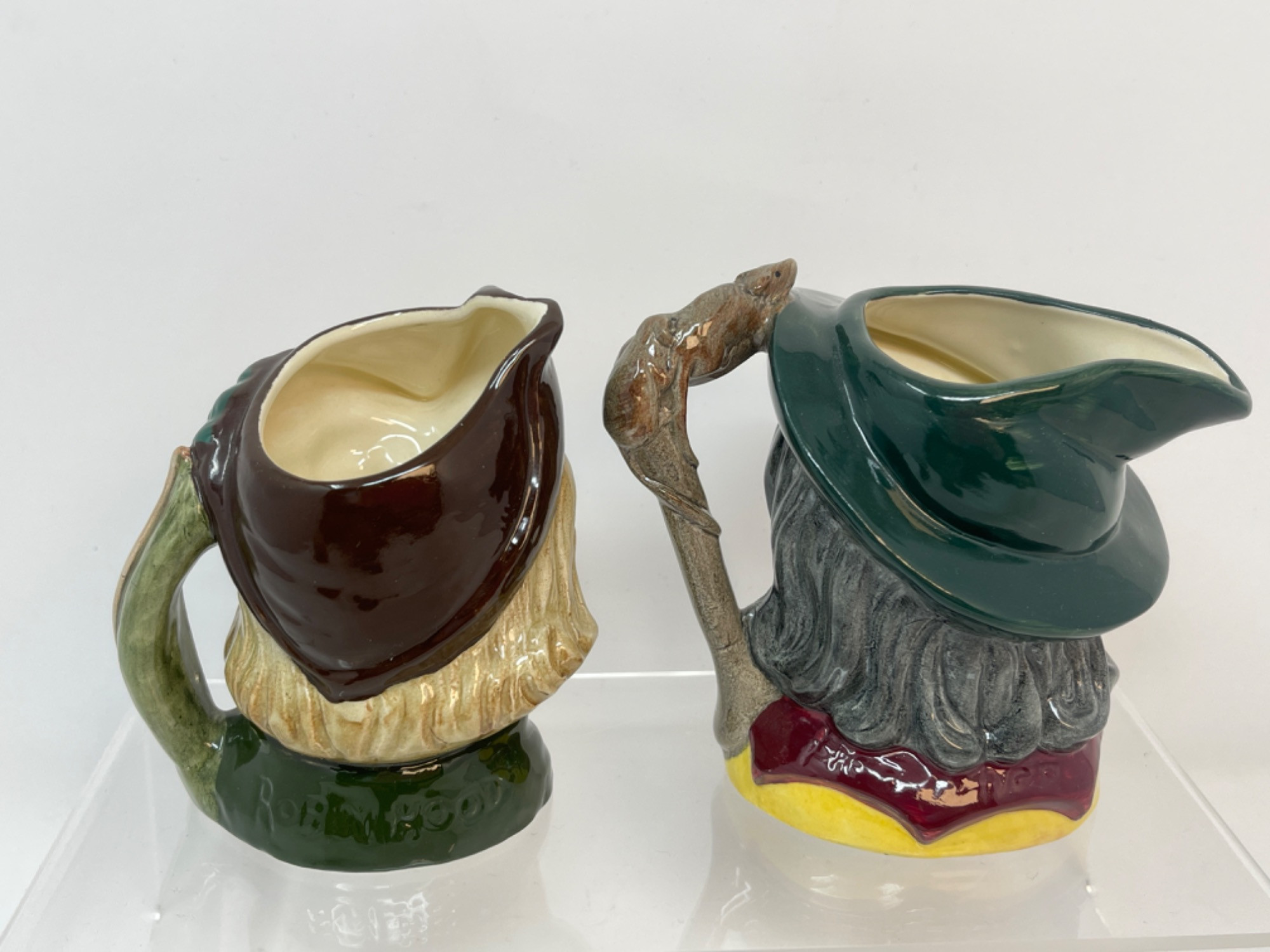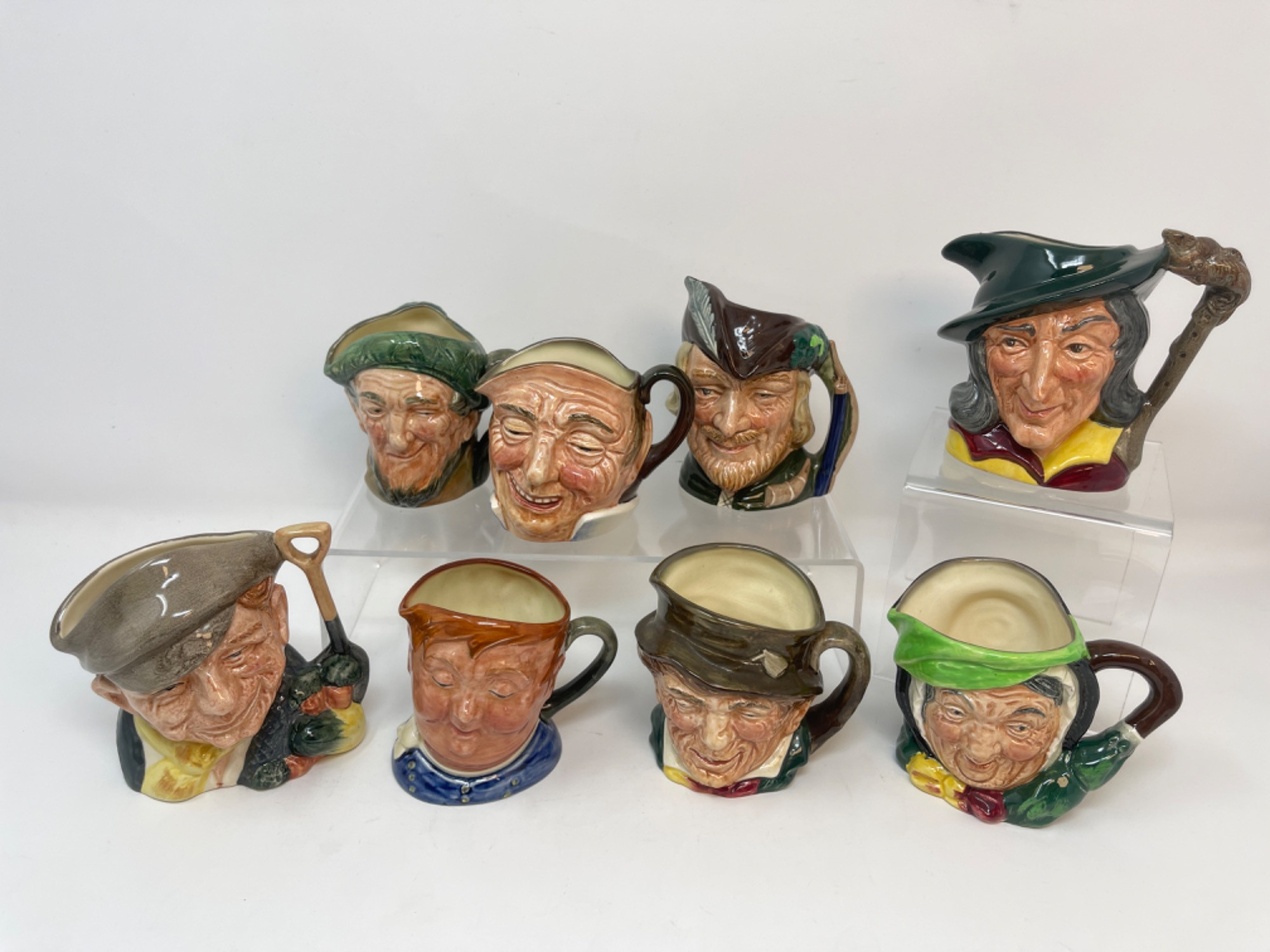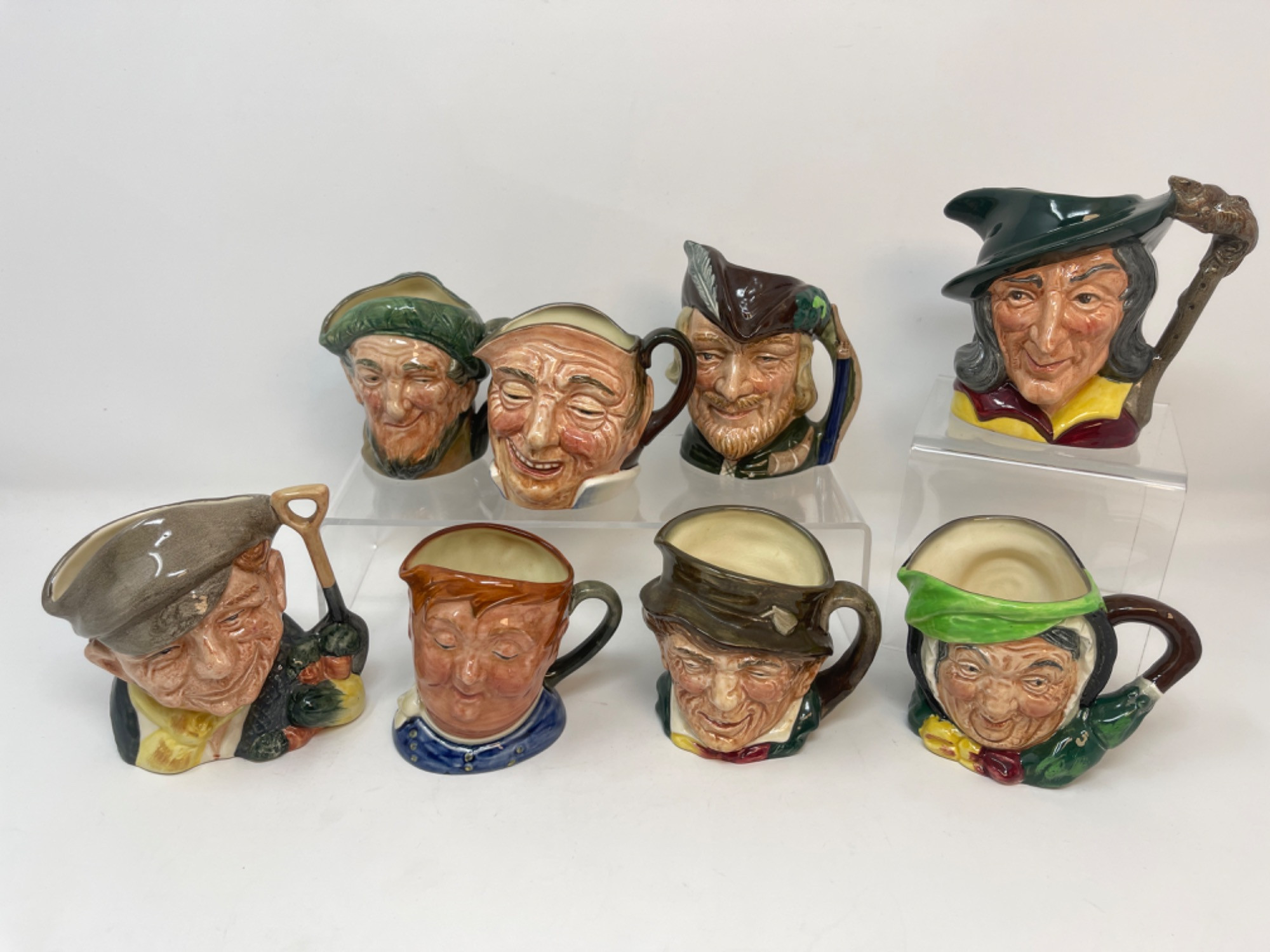 This collection of vintage Royal Doulton Toby jugs features intricately hand-painted character mugs depicting various historical and literary figures. Known for their expressive faces and detailed craftsmanship, these ceramic jugs have been highly collectible for decades. The set includes both traditional and themed designs, making them a great addition for collectors or decorative display.