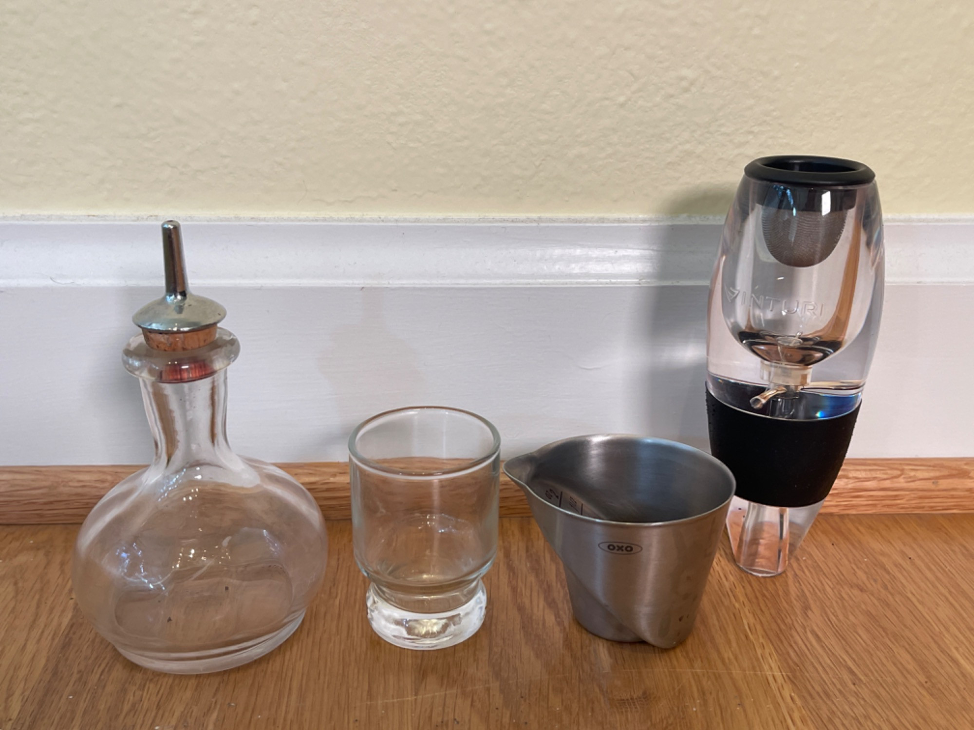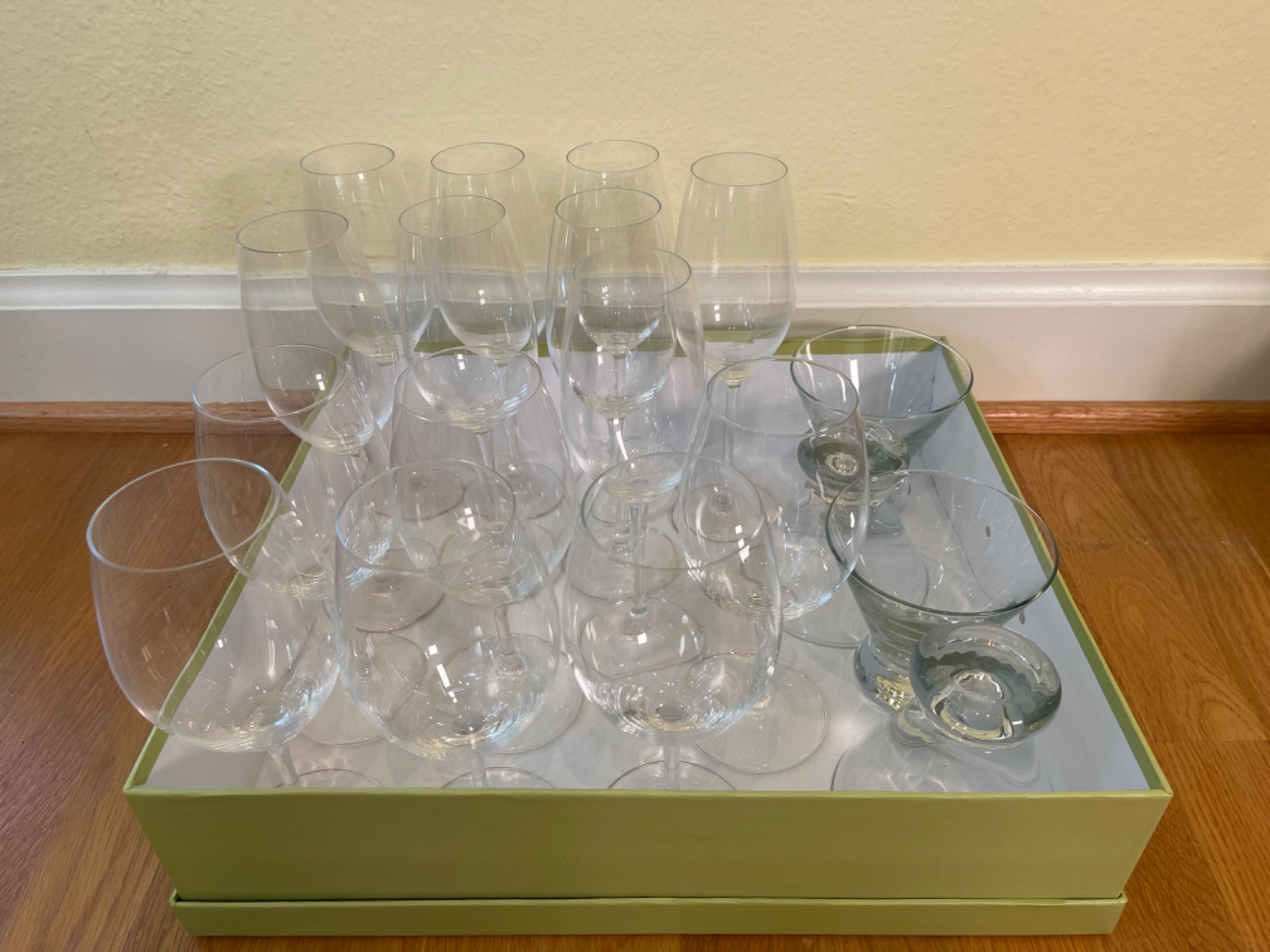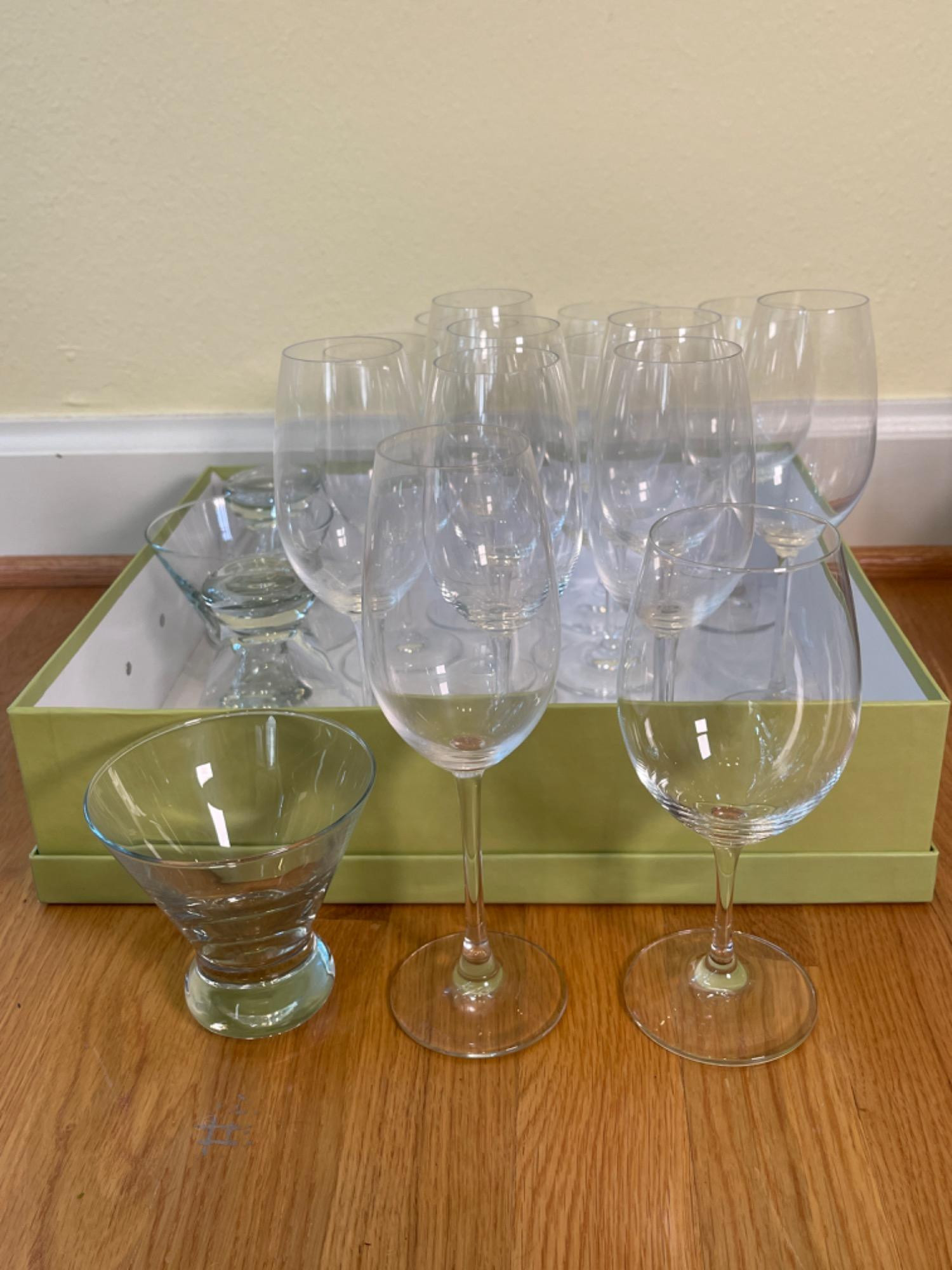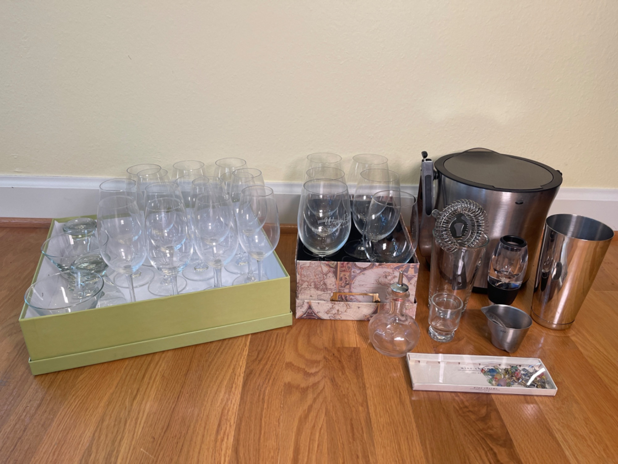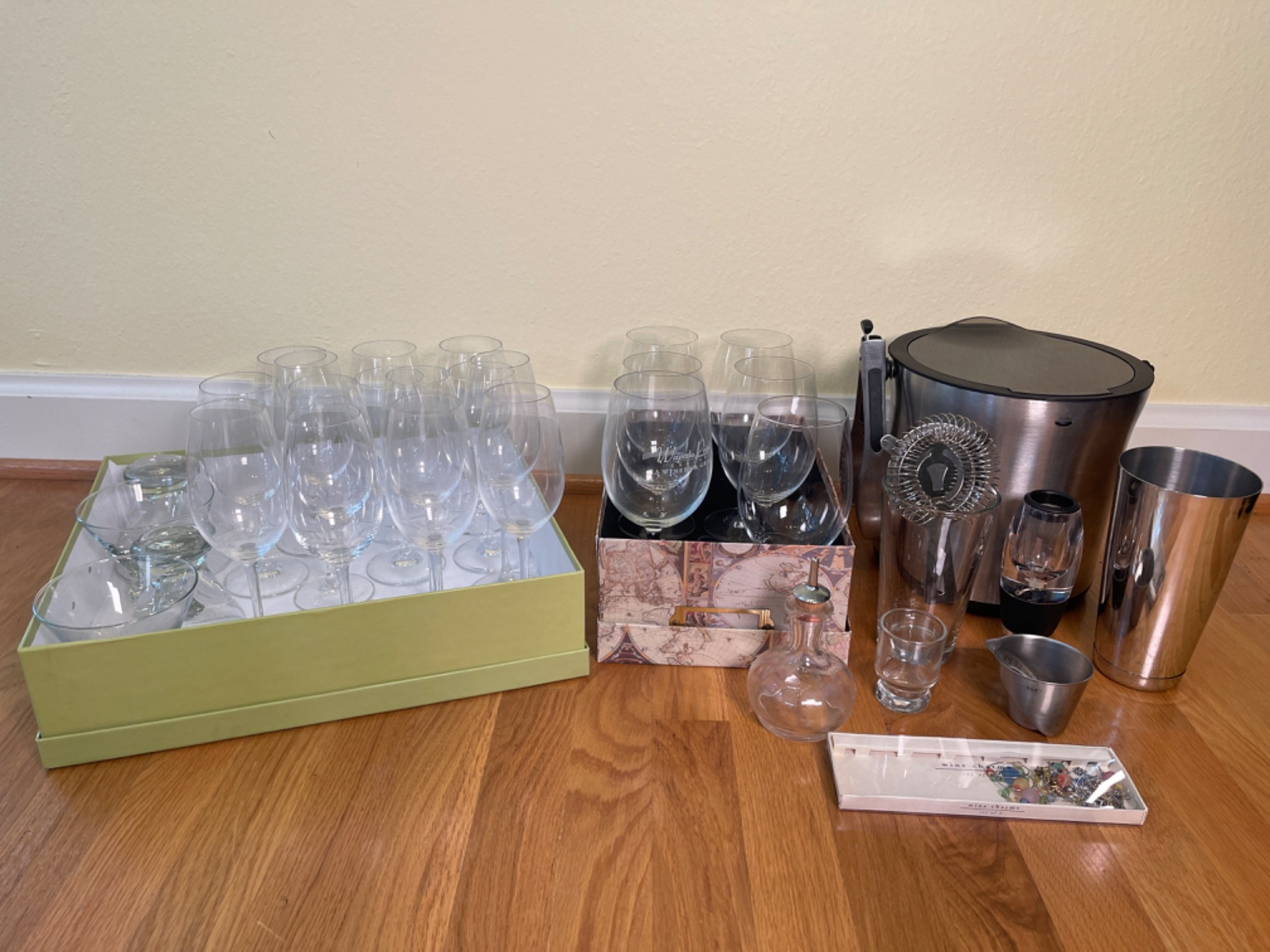 Bar Supply Restock! Reset your bar materials with this set! Complete with glasses, ice chest, shaker and more, you will be ready to entertain! Size Range: 3.75" - 8.75” H Condition: Good used condition.