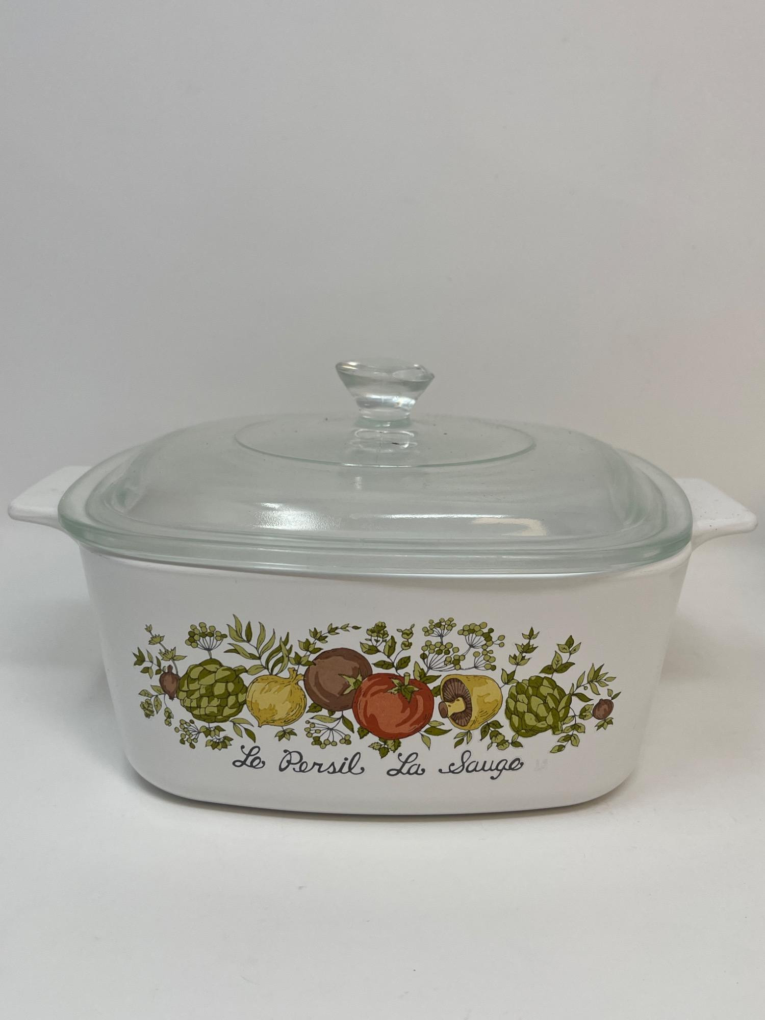 A pair of vintage CorningWare casserole dishes with clear glass lids. One features the Spice of Life pattern with "Le Persil La Sauge" text, while the other has the Wheat pattern in a simple gold-tone design. Classic and durable, these pieces are perfect for both baking and serving.