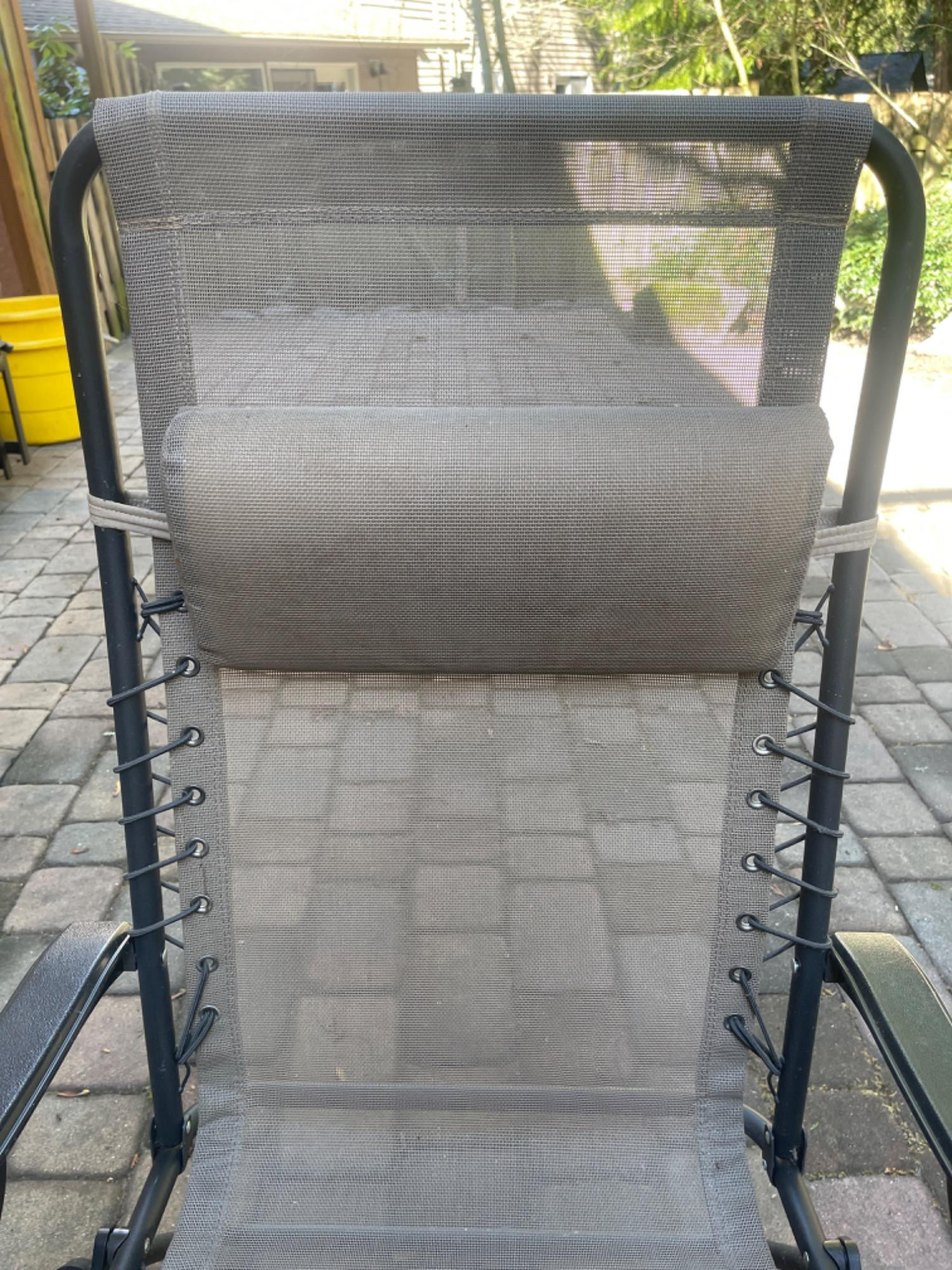 A pair of outdoor reclining lounge chairs featuring a sturdy metal frame with a mesh fabric seat. Designed for comfort, they include adjustable reclining positions and removable headrest pillows.