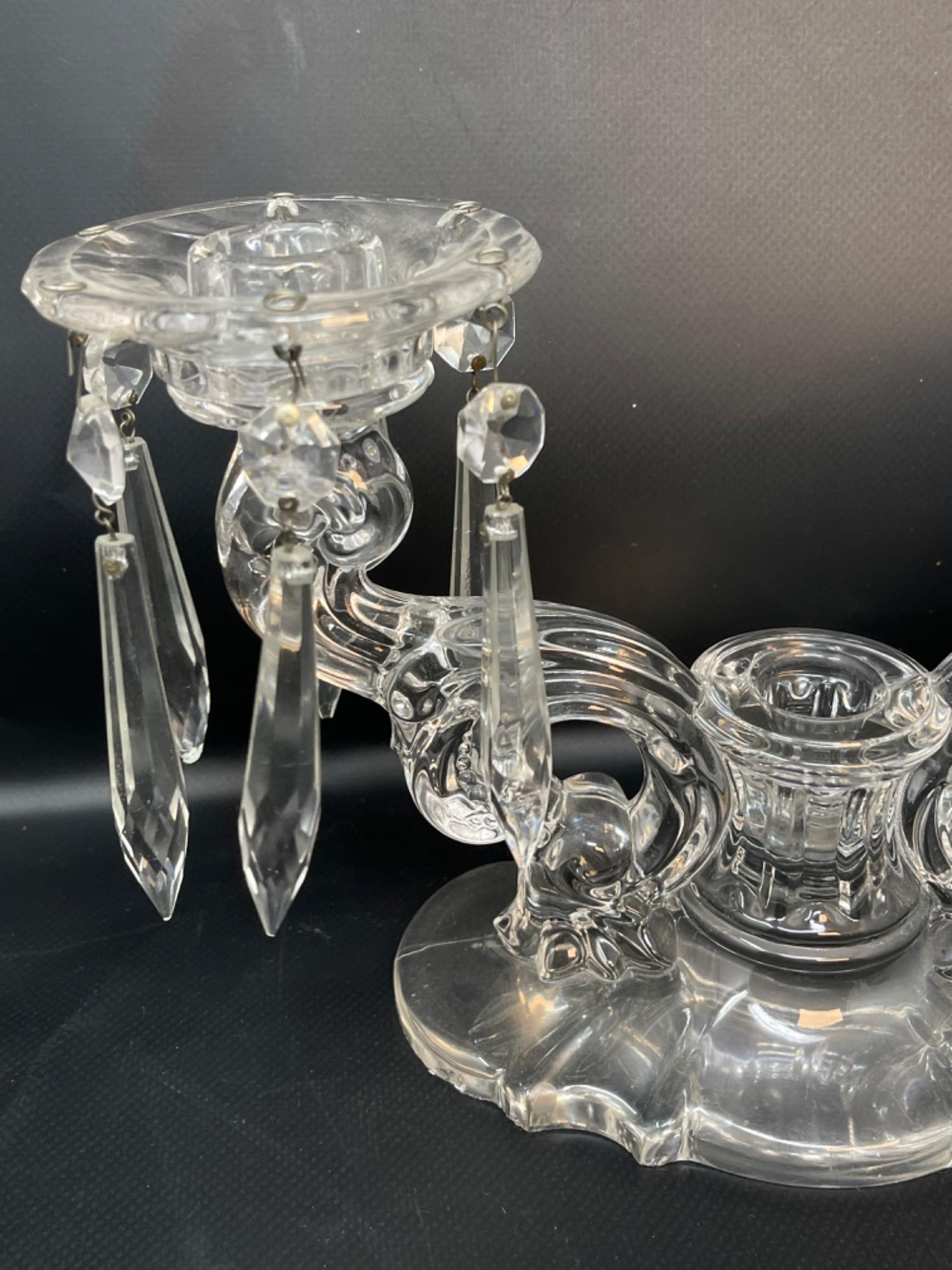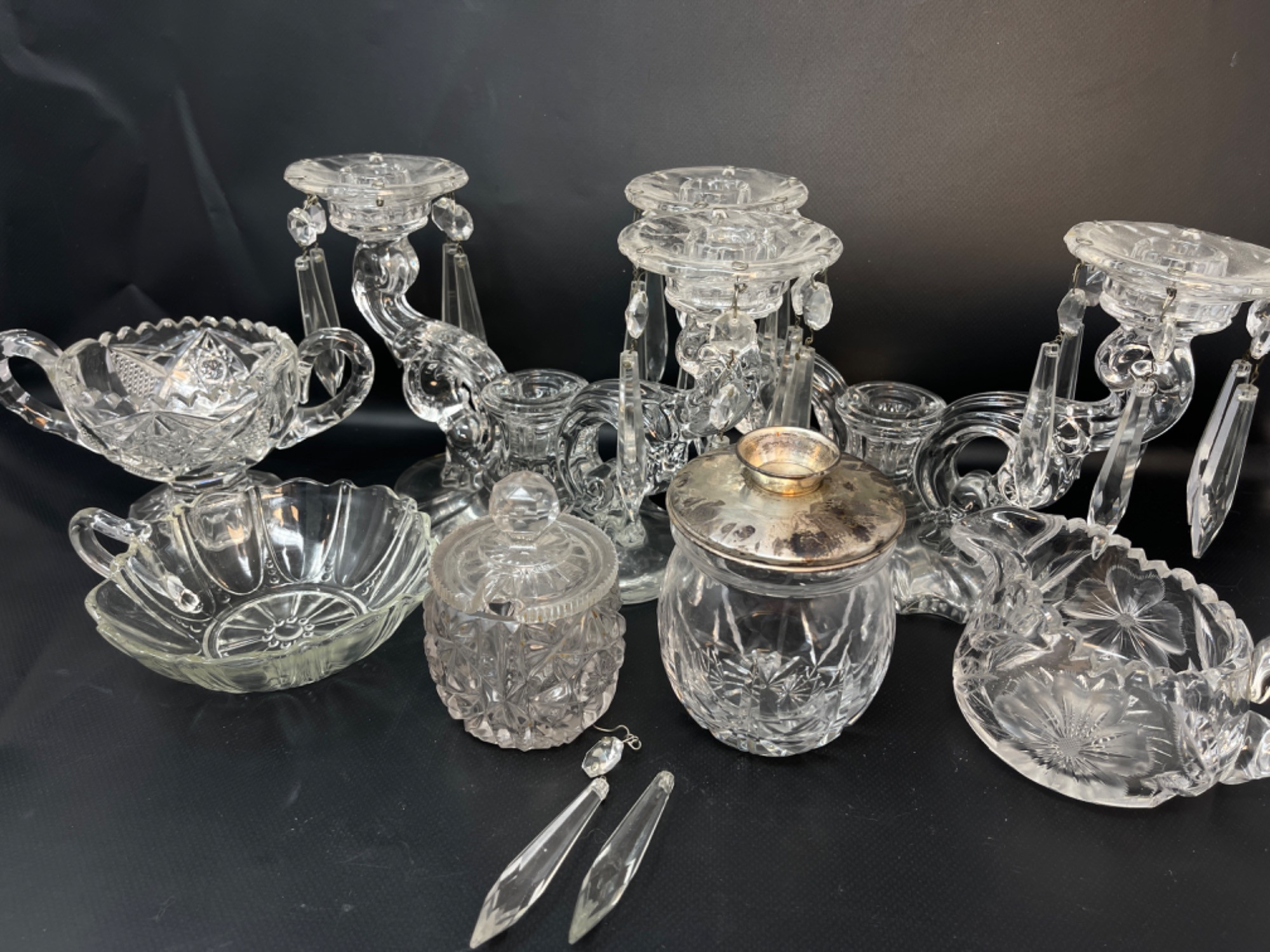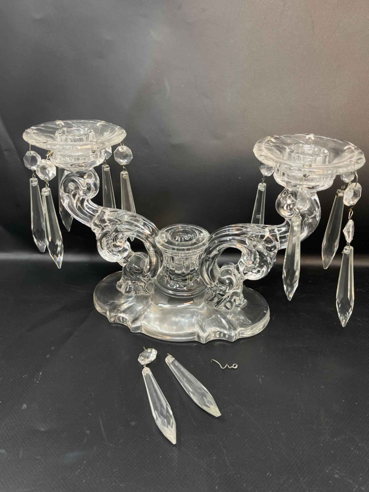 Vintage Crystal and Glass Pieces Size Range: 1.75" - 6.25” H Two of the hanging gems on one of the candleholders are broken off, but they are included.