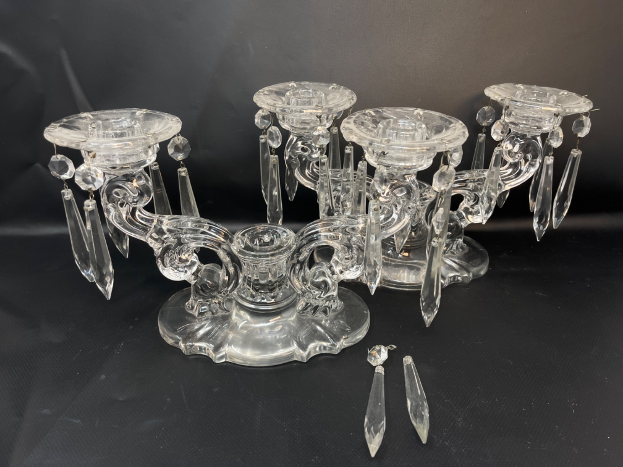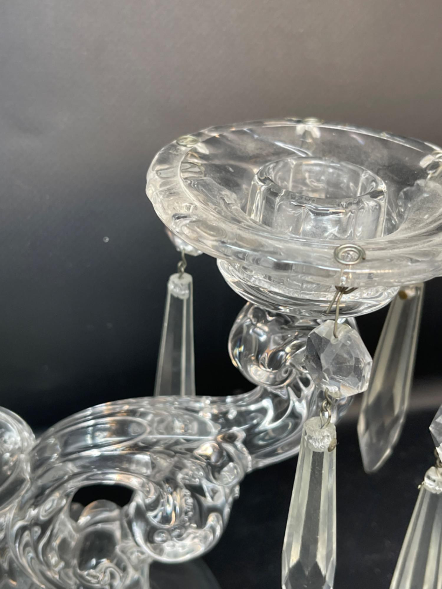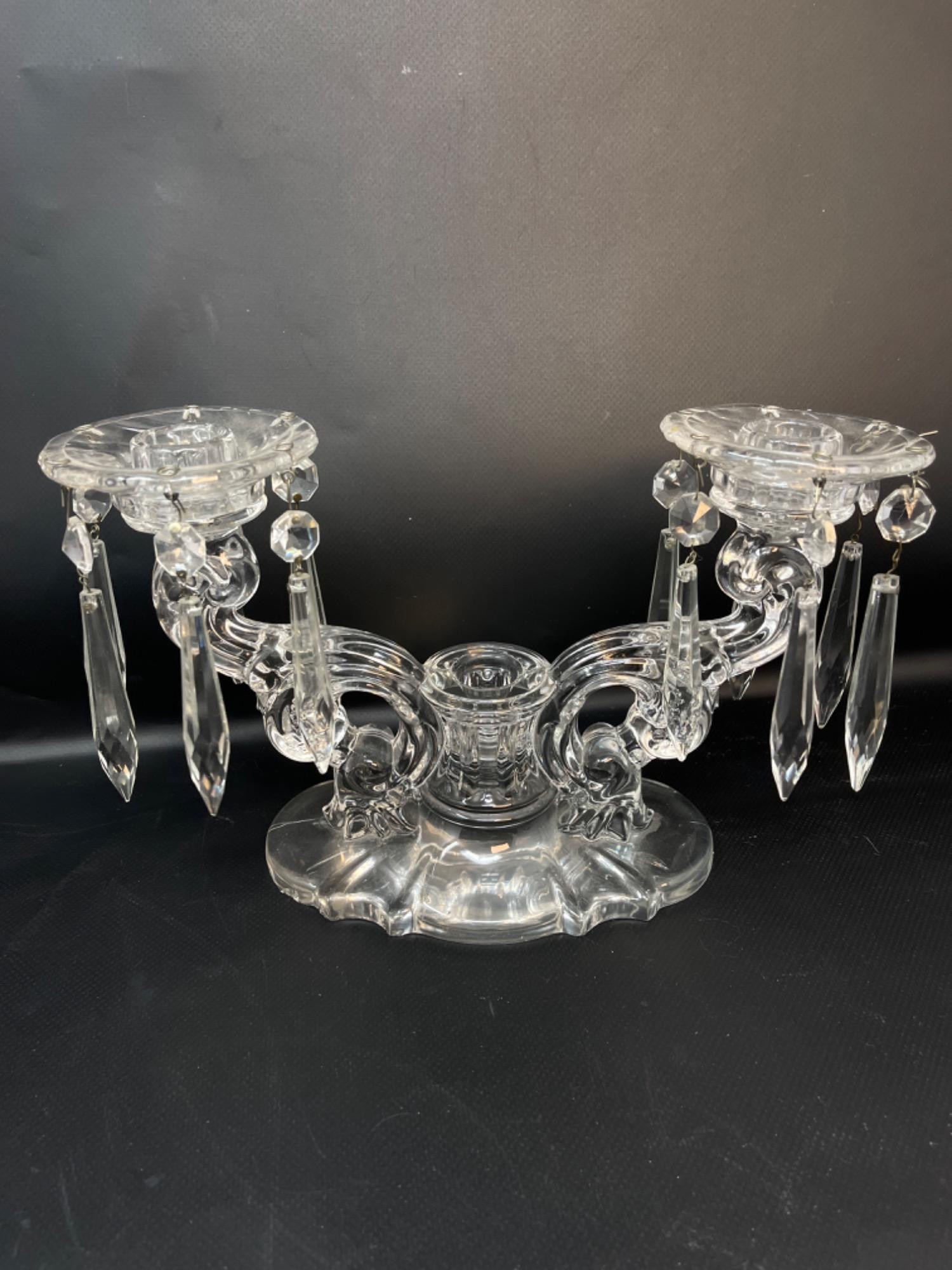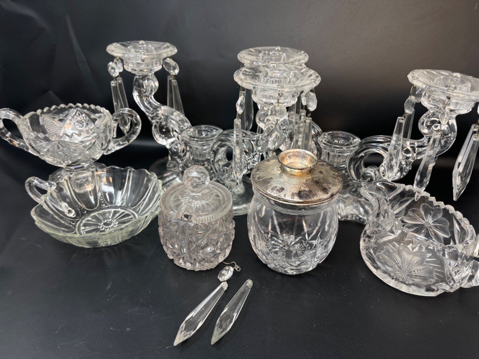 Vintage Crystal and Glass Pieces Size Range: 1.75" - 6.25” H Two of the hanging gems on one of the candleholders are broken off, but they are included.