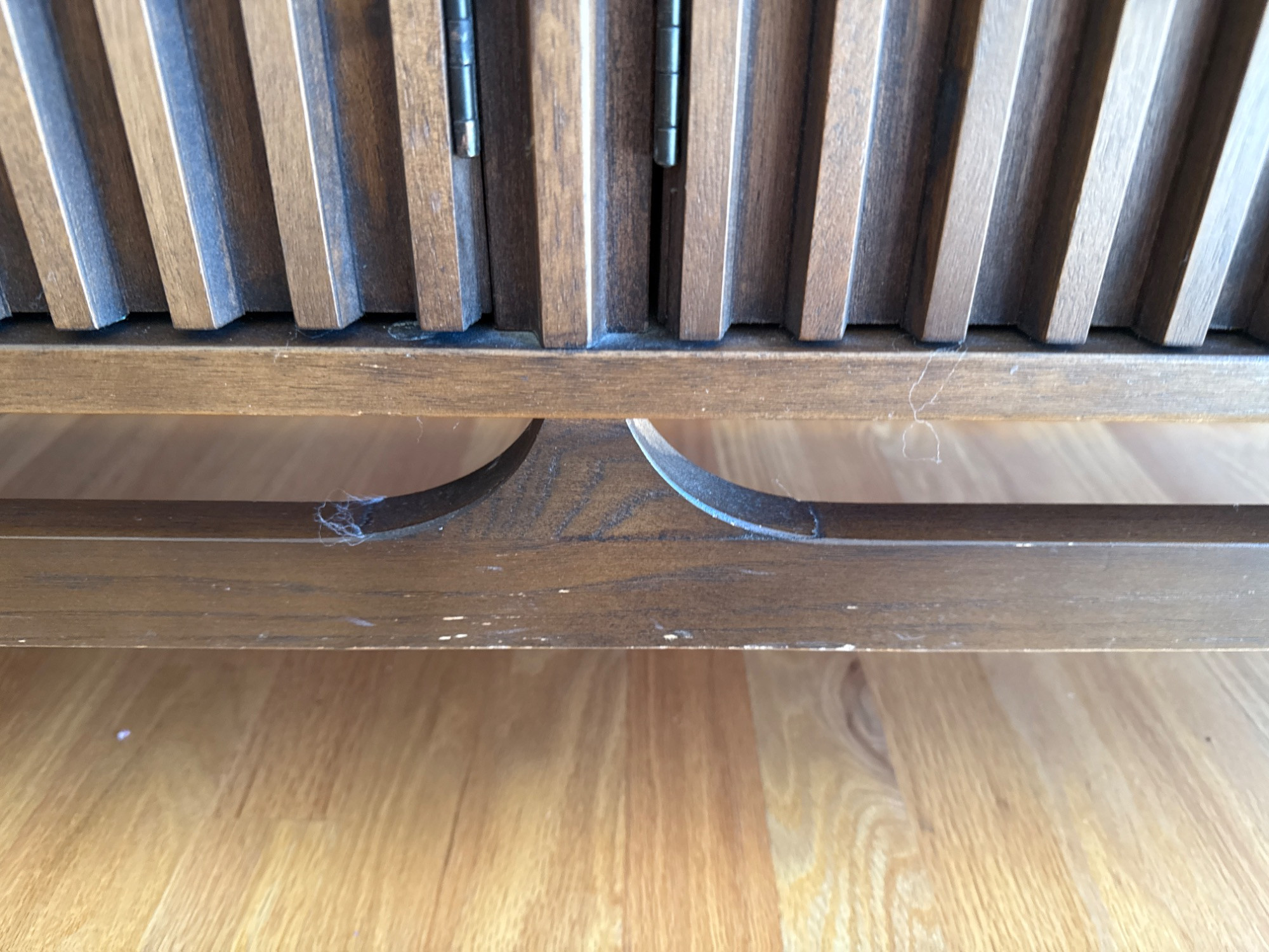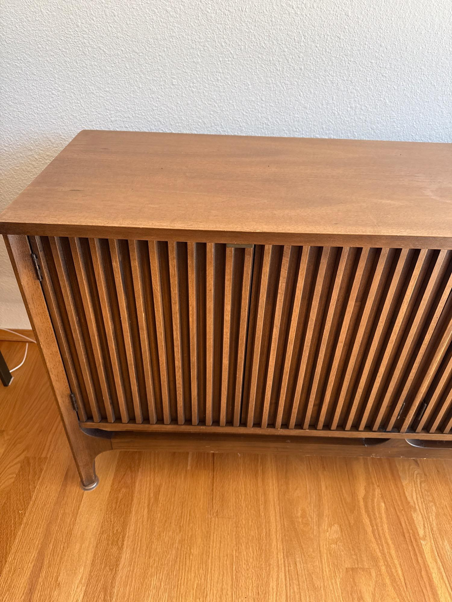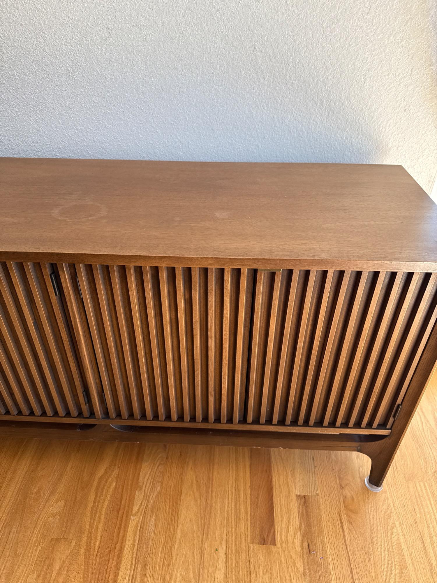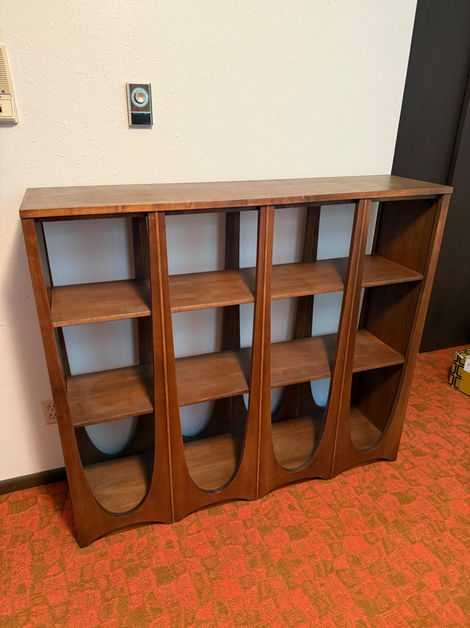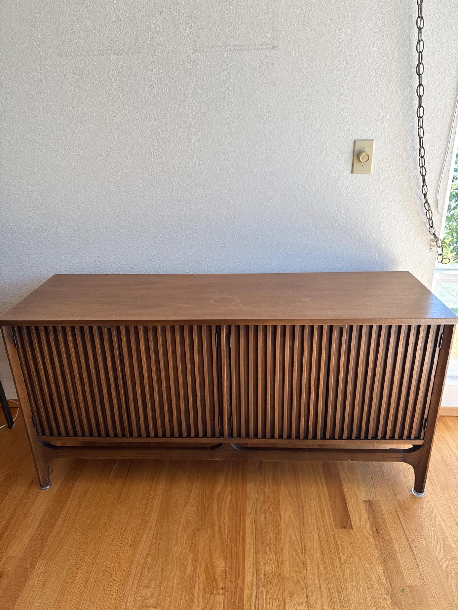 Broyhill Brasilia MCM Room Divider – Iconic Sideboard & Hutch Set. This Broyhill Brasilia Mid-Century Modern (MCM) room divider is a highly sought-after collector’s piece, featuring the signature sculptural arches that define the Brasilia collection. Crafted from rich walnut, this two-piece set seamlessly blends style and functionality. Sideboard: 54"W x 17"D x 27"T – Features louvered doors for sleek, enclosed storage. Hutch: 52"W x 46"T x 13.5"D – Open shelving with Brasilia’s iconic curved details, ideal for displaying décor or collectibles. This versatile set serves as a room divider, display hutch, or storage credenza, making it a perfect statement piece for MCM interiors. Market Value & Investment Potential: A similar piece sold on Invaluable.com for $2,900 USD Currently being offered on 1stDibs for $9,500 USD (source) Bidding on this lot is an agreement that: (1.) You will have 2 capable, able-bodied persons to lift and load at a minimum. (2.) You will bring a hand truck and/or any other tools needed to remove this item. If these steps are not followed your item will be forfeited and no refund given.