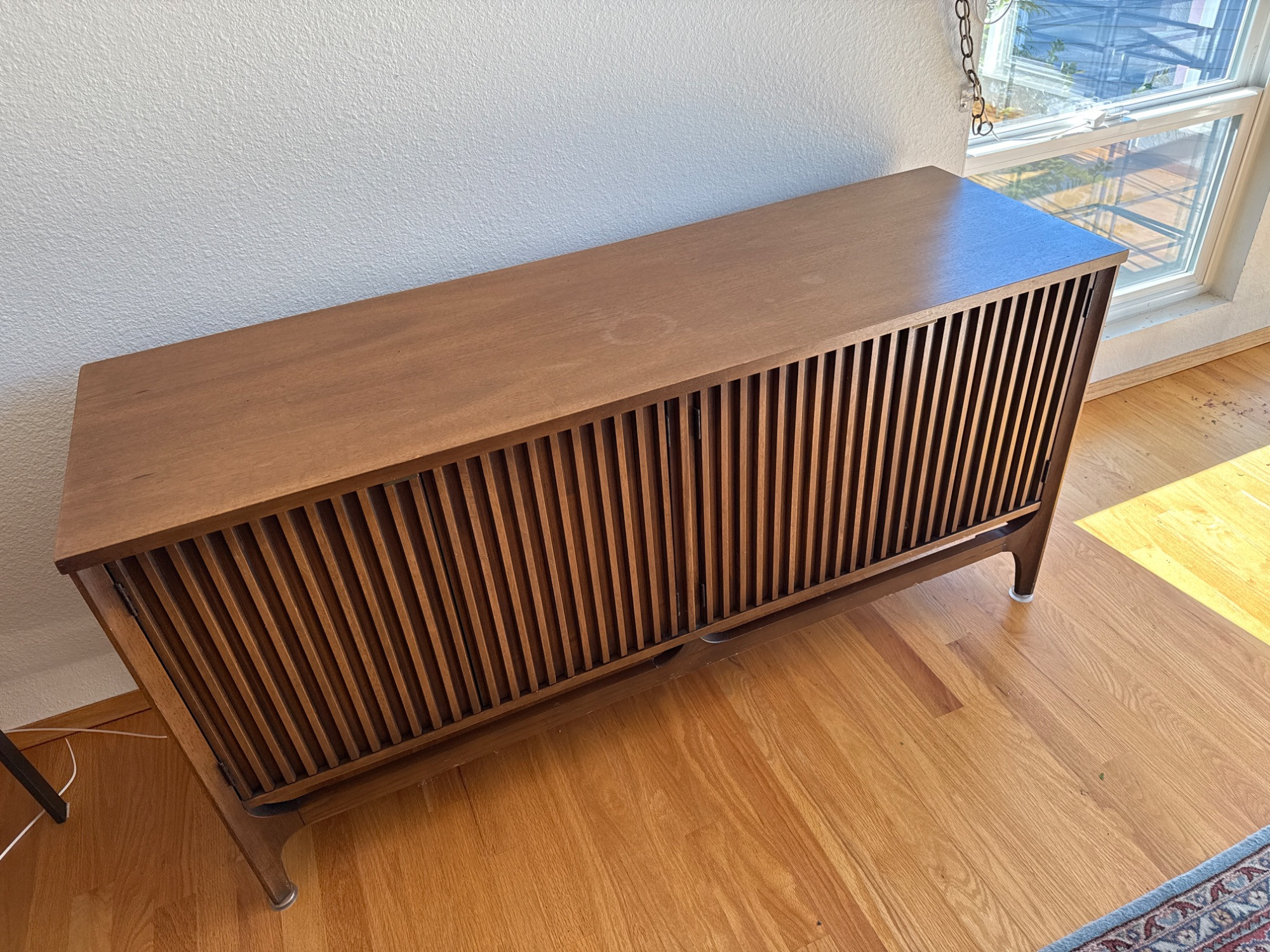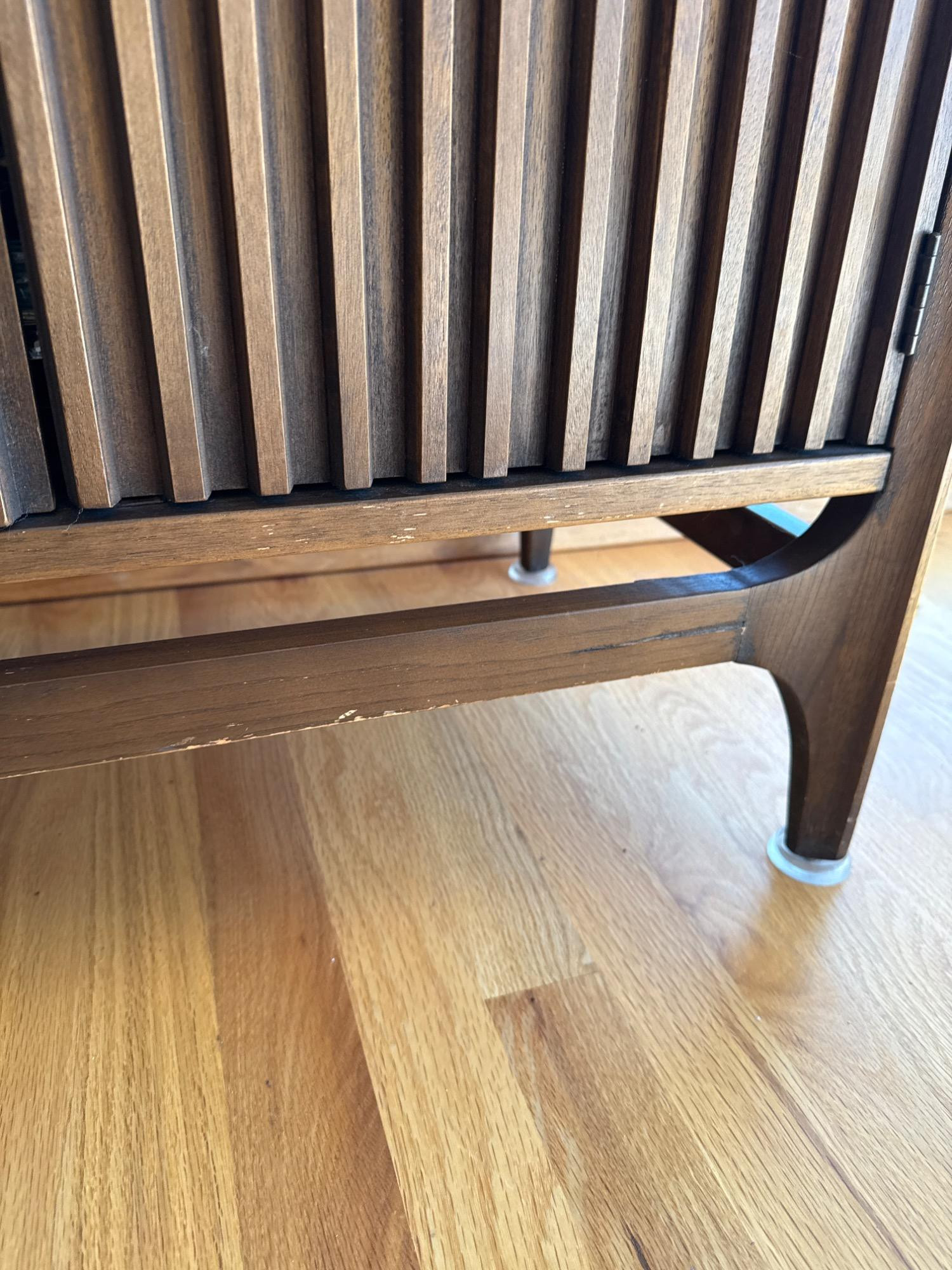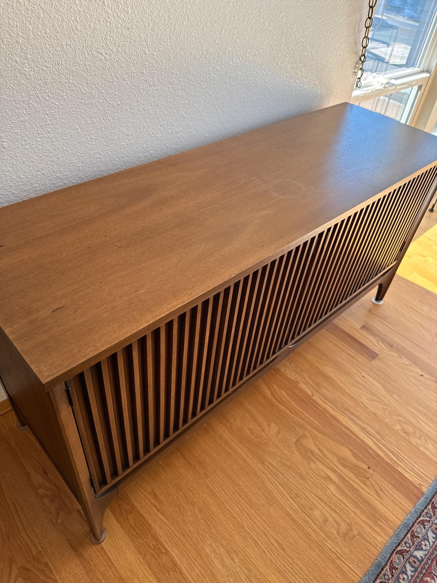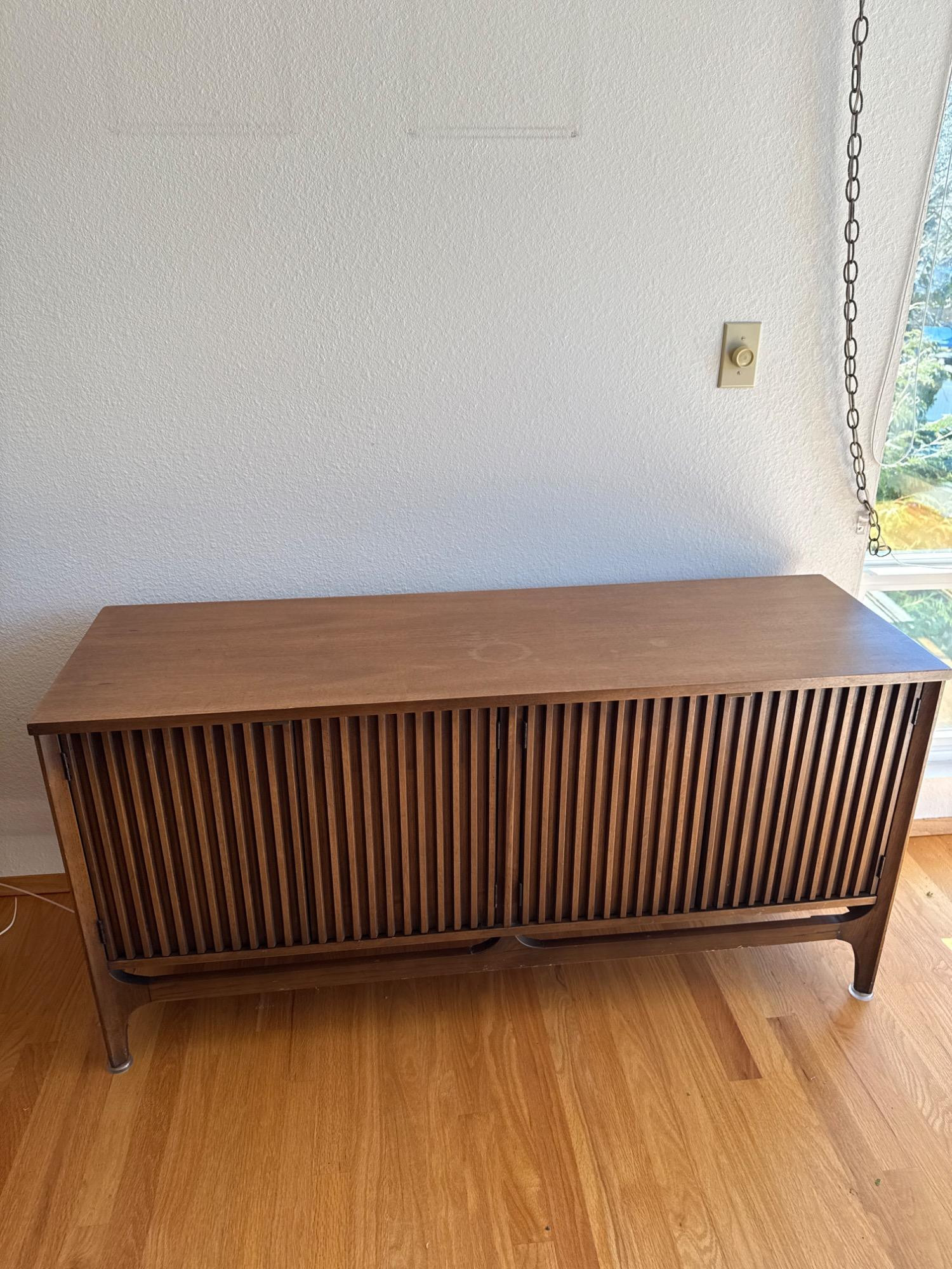 Broyhill Brasilia MCM Room Divider – Iconic Sideboard & Hutch Set. This Broyhill Brasilia Mid-Century Modern (MCM) room divider is a highly sought-after collector’s piece, featuring the signature sculptural arches that define the Brasilia collection. Crafted from rich walnut, this two-piece set seamlessly blends style and functionality. Sideboard: 54"W x 17"D x 27"T – Features louvered doors for sleek, enclosed storage. Hutch: 52"W x 46"T x 13.5"D – Open shelving with Brasilia’s iconic curved details, ideal for displaying décor or collectibles. This versatile set serves as a room divider, display hutch, or storage credenza, making it a perfect statement piece for MCM interiors. Market Value & Investment Potential: A similar piece sold on Invaluable.com for $2,900 USD Currently being offered on 1stDibs for $9,500 USD (source) Bidding on this lot is an agreement that: (1.) You will have 2 capable, able-bodied persons to lift and load at a minimum. (2.) You will bring a hand truck and/or any other tools needed to remove this item. If these steps are not followed your item will be forfeited and no refund given.
