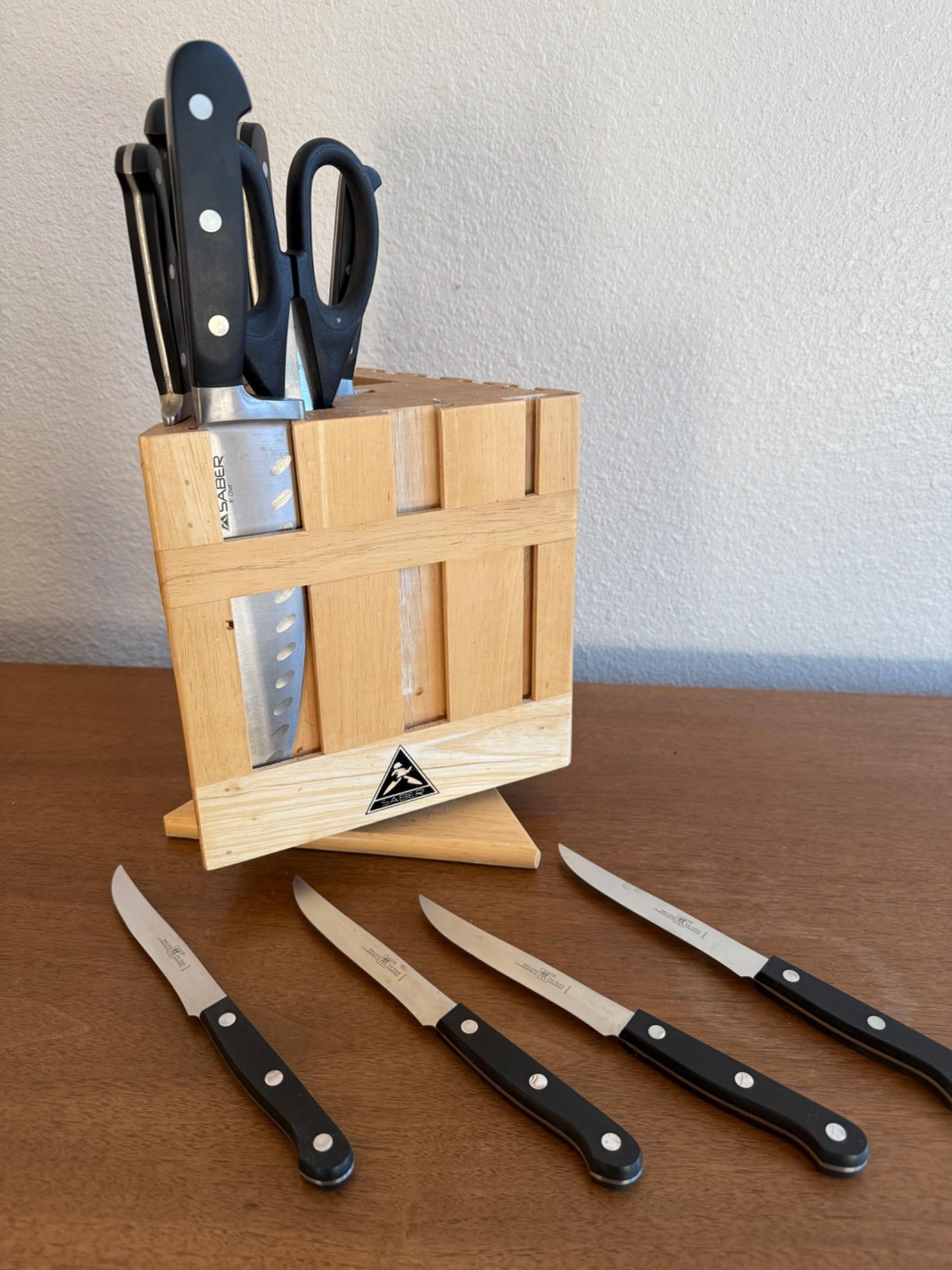 Saber & Henckel Knife Set w/ Butcher Block Caddy – 9 Knives + Scissors. This high-quality knife set includes a mix of Saber and Henckel knives, offering precision and durability for any kitchen task. Stored in a wood butcher block knife caddy, this set provides both functionality and a stylish countertop display. In good condition. See photos for details.