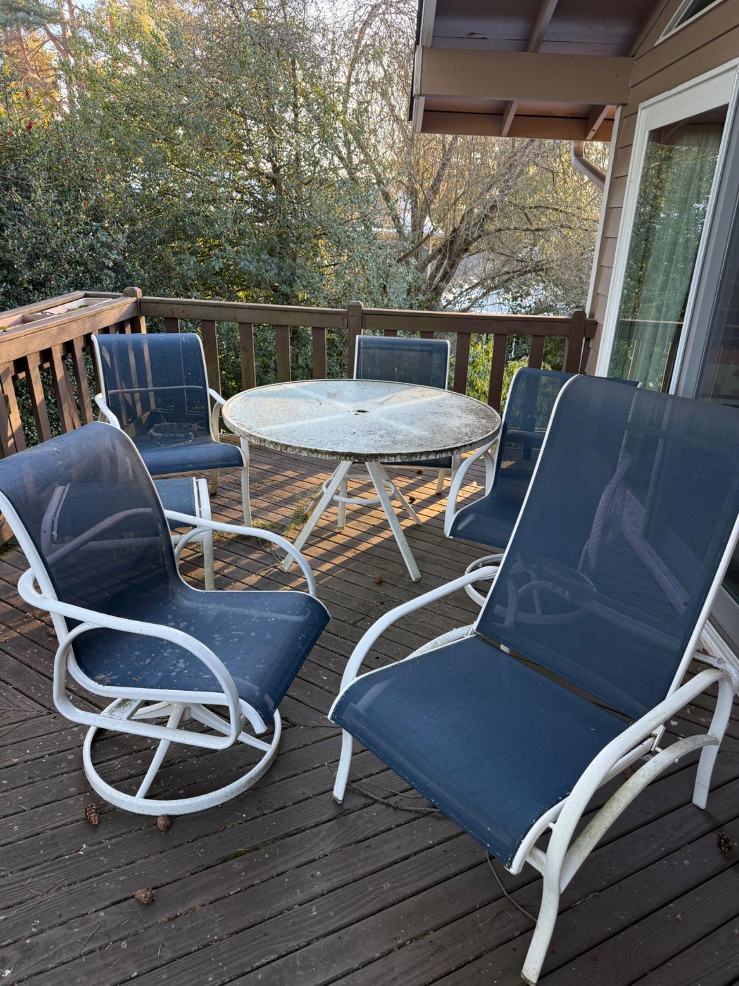 Tropitone Patio Set – Table & 5 Chairs. This Tropitone patio set includes a 4' x 27" round glass table and five sturdy chairs, perfect for outdoor relaxation. The set features two swivel chairs and three standard chairs, all with a white metal frame and blue mesh seating for durability and comfort. The set is in very good condition but needs a thorough pressure washing to restore its full beauty. A high-quality outdoor furniture set built to last! Bidding on this lot is an agreement that: (1.) You will have 2 capable, able-bodied persons to lift and load at a minimum. (2.) You will bring a hand truck and/or any other tools needed to remove this item. If these steps are not followed your item will be forfeited and no refund given.