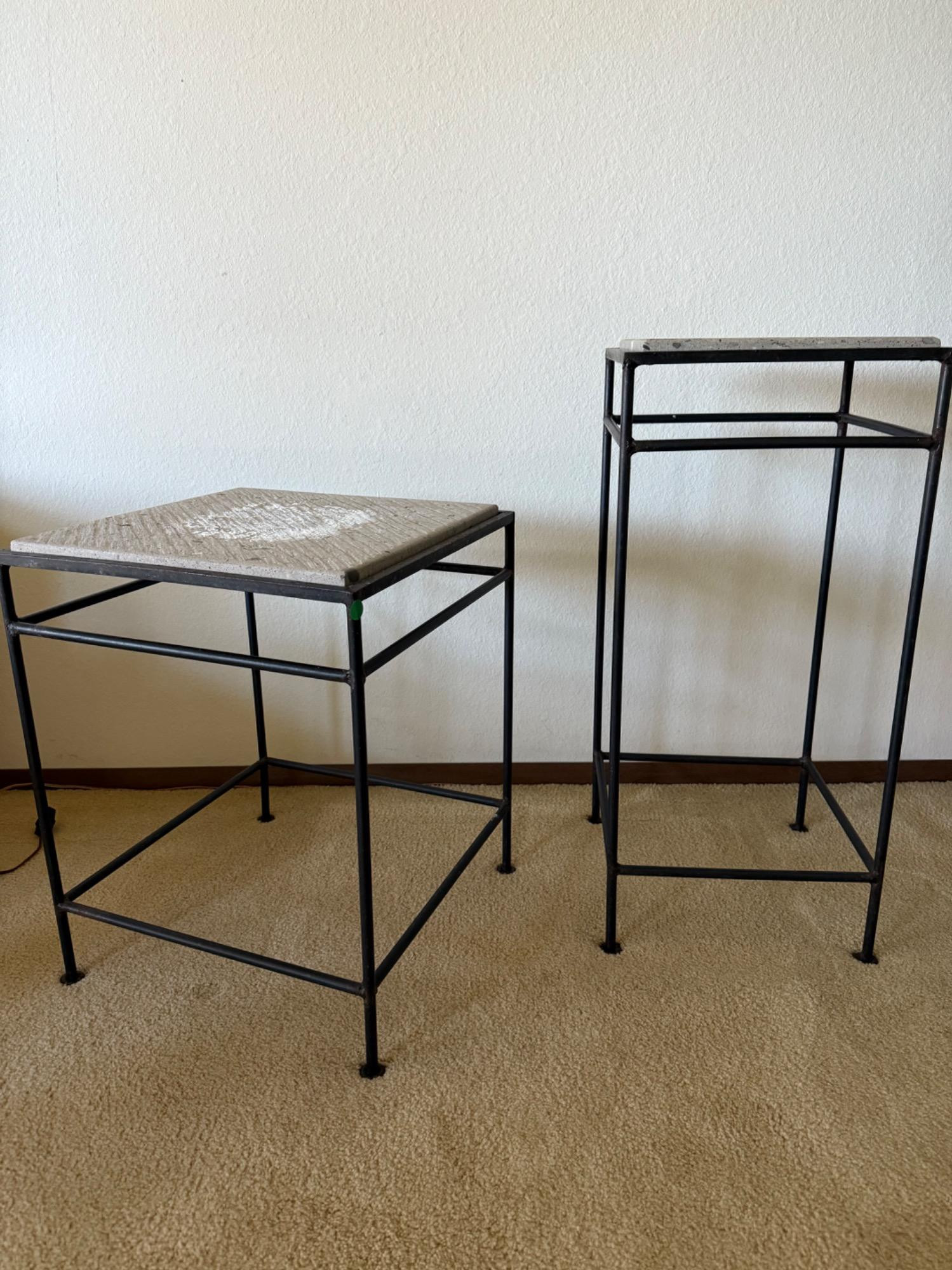 Set of 2 Metal Frame Side Tables w/ Textured Tops. Largest measures-29T x 13 W Smaller-21.5 T x 17 W This set of two side tables features sturdy metal frames with textured stone-like tops, offering a sleek industrial aesthetic. The open-frame design provides a modern, minimalist look, making them versatile for any space, including living rooms, patios, or as plant stands. Both tables show visible wear on the tops (see photos), but the metal frames remain sturdy. With a little refinishing, these tables could make a great functional and decorative addition to any home.
