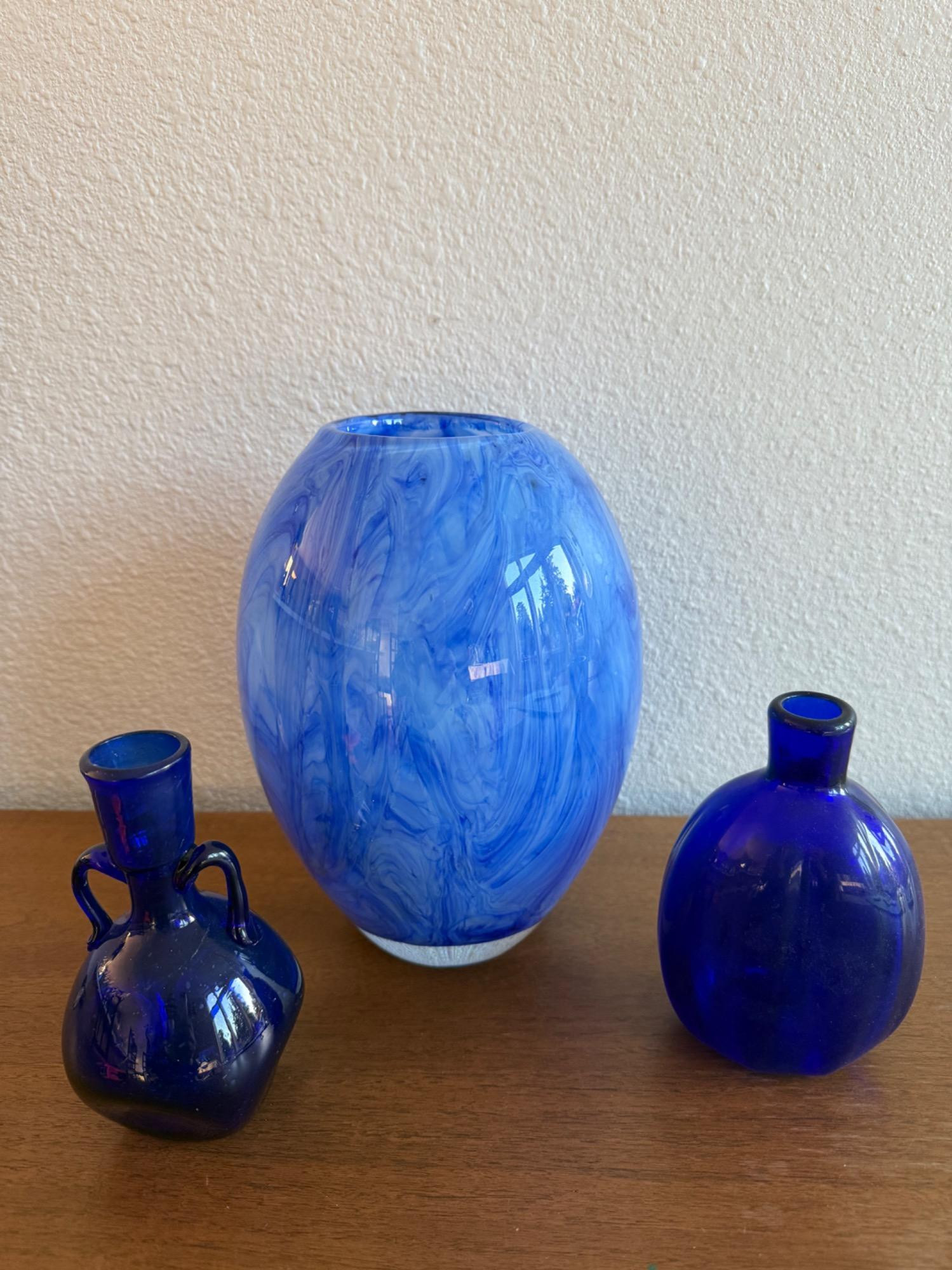 Crate & Barrel Cirrus Vase – Thick Blue Cloud Glass & Mini Cobalt Blue Vases. This listing features a stunning Crate & Barrel Cirrus Vase, crafted from thick blue glass with a swirling cloud-like pattern. Its modern yet organic design makes it a beautiful decorative piece for any space. Also included are two miniature cobalt blue vases, each with a unique shape and deep, rich blue color. These charming vintage-style pieces are perfect for collectors or as elegant accents to any decor.