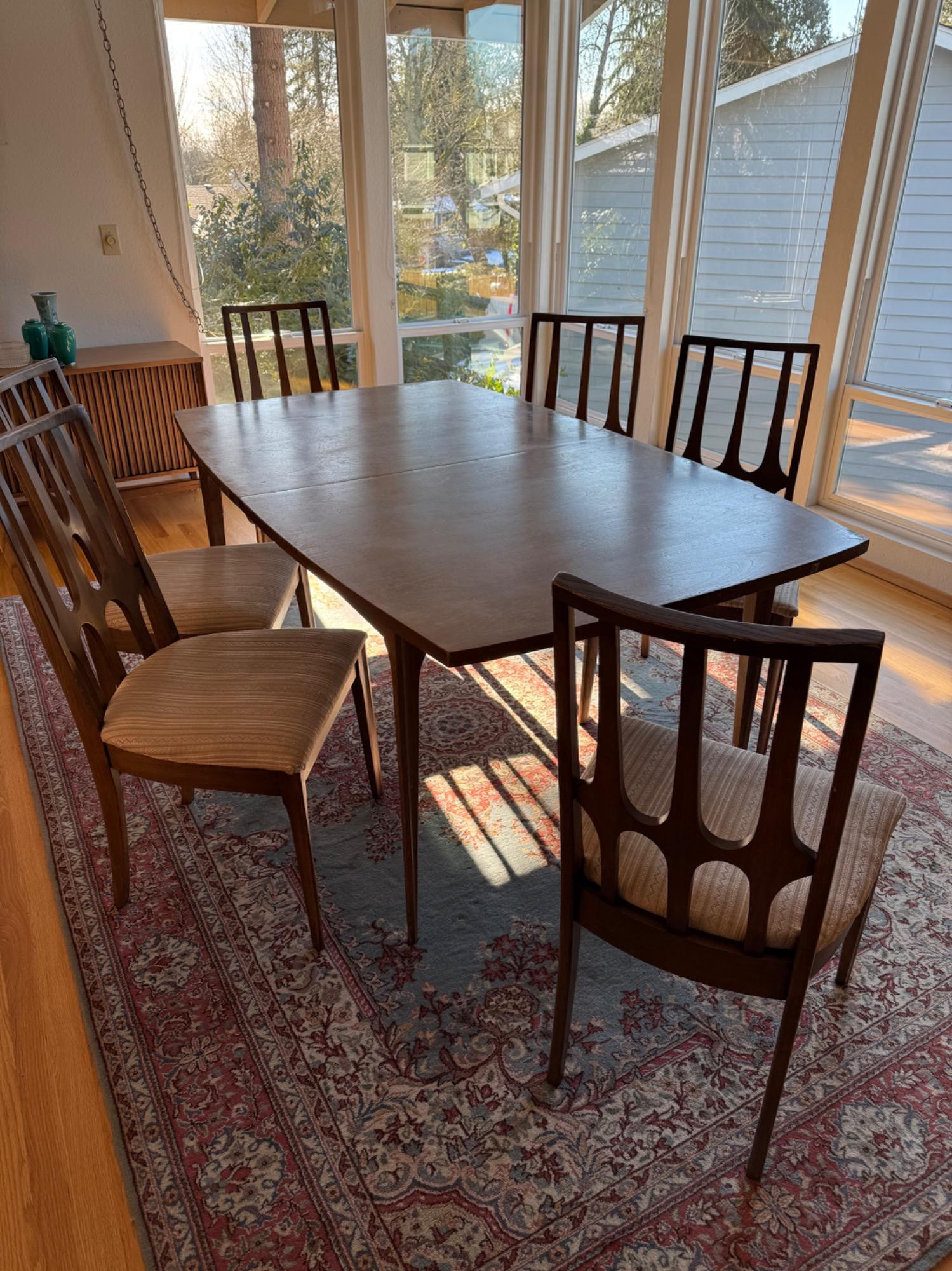 Broyhill Brasilia MCM Dining Set with Six Chairs-Leaves. Beautiful Broyhill Brasilia dining set, comes with a table and 6 chairs. This beautiful set is very sturdy. Dimensions: Table Height: 30 in (76.2 cm)Width: 78 in (198.12 cm)Depth: 40 in (101.6 cm) Seat Height: 19 in (48.26 cm) Chairs have wear on upholstery. Bidding on this lot is an agreement that: (1.) You will have 2 capable, able-bodied persons to lift and load at a minimum. (2.) You will bring a hand truck and/or any other tools needed to remove this item. If these steps are not followed your item will be forfeited and no refund given.