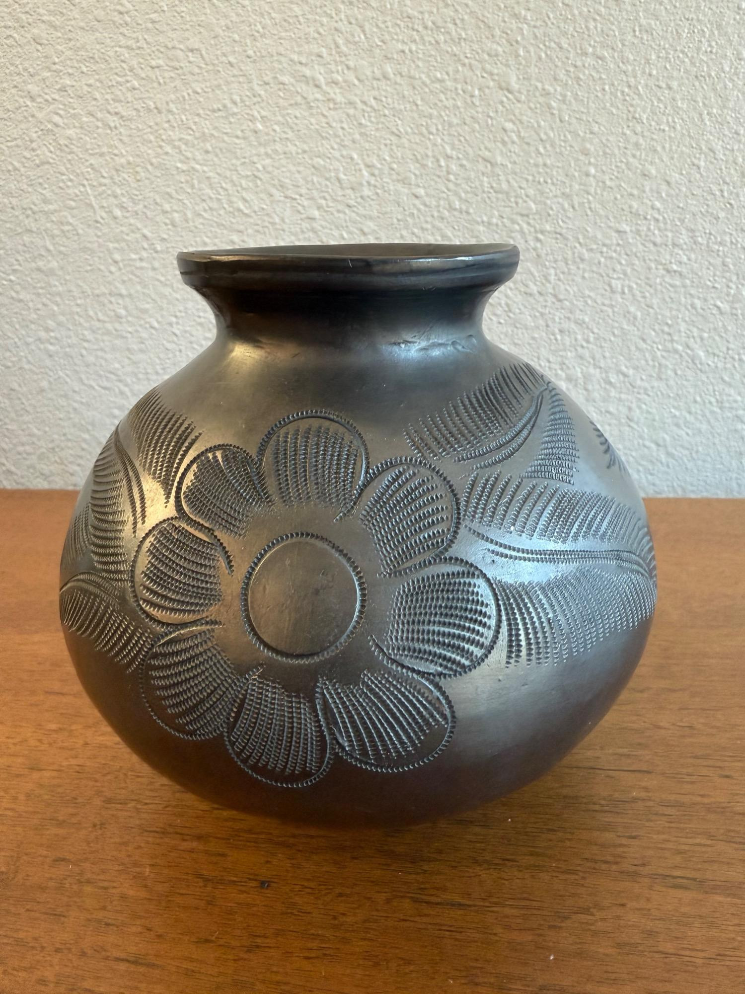 Vintage Mexican Black Pottery Vase w/ Floral & Leaf Engraving This vintage Mexican black pottery vase features a rounded base and an elegant hand-engraved floral and leaf motif. Crafted using traditional techniques, this smooth, dark-finished ceramic piece reflects the artisanal heritage of Mexican pottery. The rich black color and intricate design make it a unique decorative accent for any collection or home display. Measures 6.5” tall x 6” wide. See photos for details.