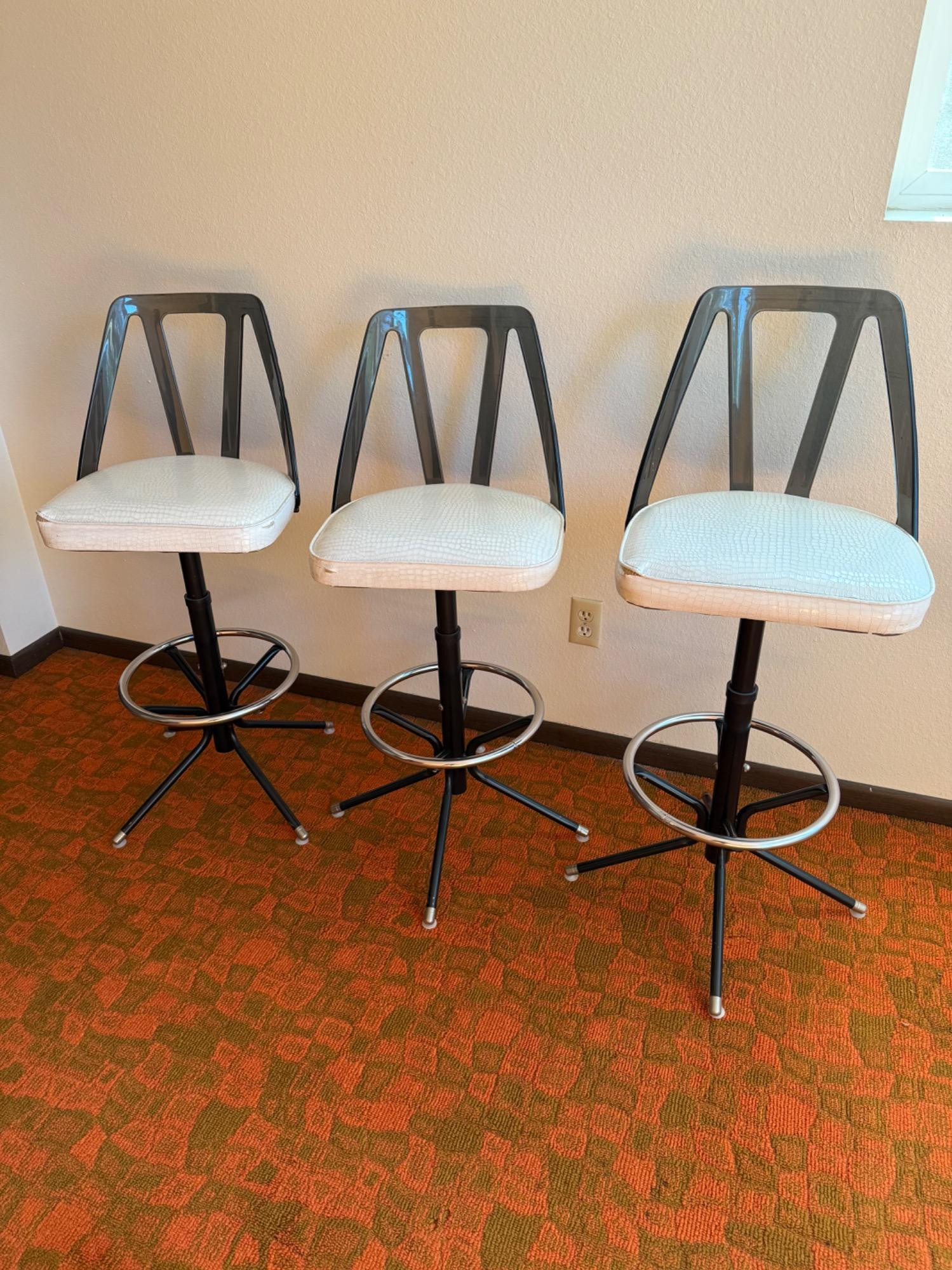 1970s Atomic Retro Adjustable Swivel Bar Stools – Vinyl & Lucite A set of three vintage 1970s Atomic Retro bar stools featuring adjustable swivel bases, Lucite backs, and textured vinyl seats. These stools embody the classic mid-century modern aesthetic, perfect for a stylish bar, kitchen, or lounge. Some wear on the vinyl (see photos), but overall in great condition with all original components intact. Bidding on this lot is an agreement that: (1.) You will have 2 capable, able-bodied persons to lift and load at a minimum. (2.) You will bring a hand truck and/or any other tools needed to remove this item. If these steps are not followed your item will be forfeited and no refund given.